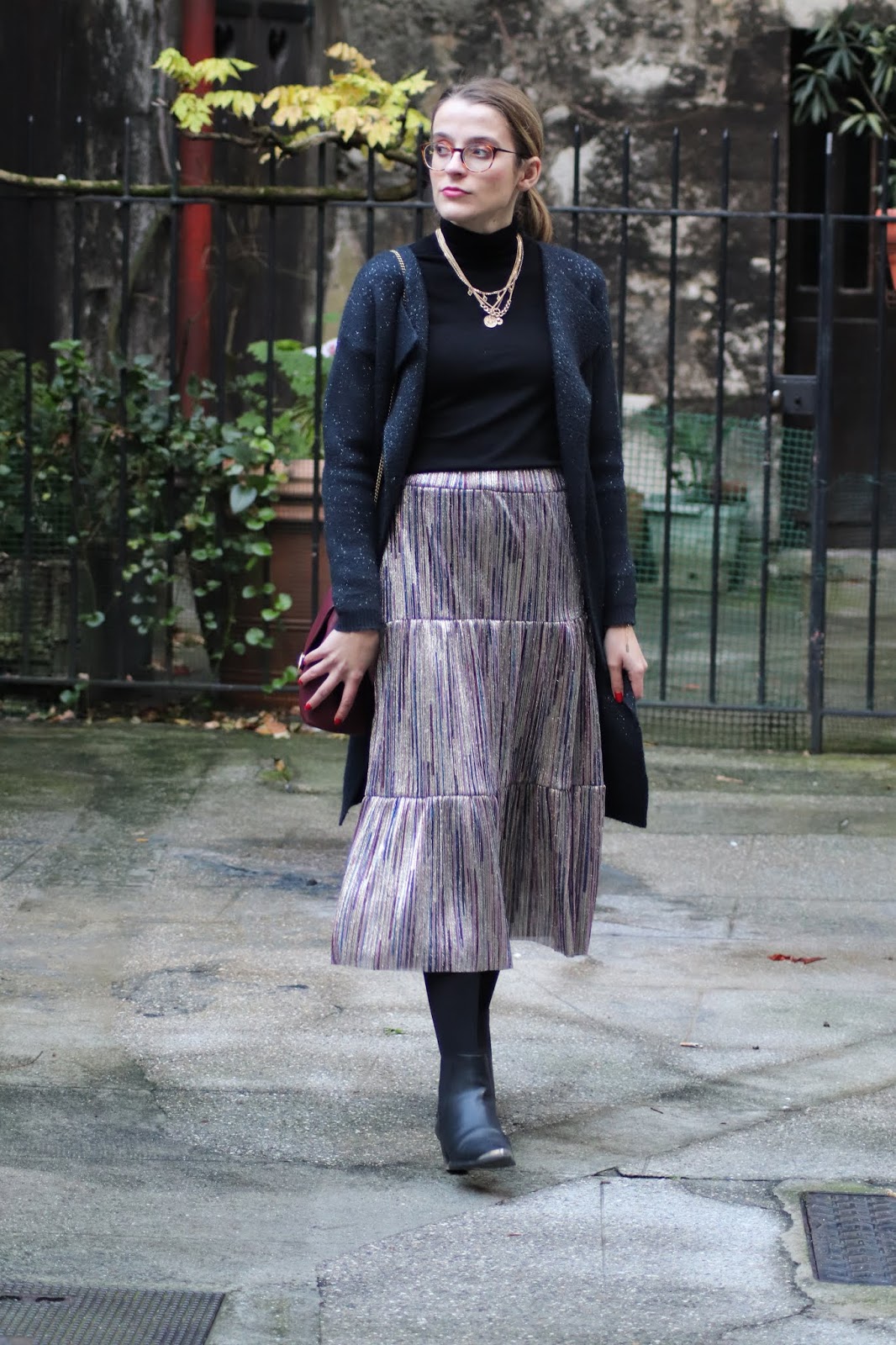 On se retrouve cette semaine avec une nouvelle tenue par ici. Un look shooté le lendemain de celui de la semaine dernière, dans un autre petit spot que j’aime bien. J’avais très envie de vous montrer ma nouvelle jupe, shoppée dans un multi-marques durant mon séjour dans le sud, d’une petite marque italienne que je ne connaissais pas. Ce jour-ci, je m’étais également acheté une autre jupe midi que j’espère vous montrer bientôt. Je l’adore, étant très originale, mais pas non plus trop tape à l’oeil, portée comme ici avec un top noir. Une accumulation de colliers shoppés chez Stradivarius pour un look plus original, et parce que j’adore porter beaucoup de colliers en ce moment. Des bottines noires, et mon fameux sac, et le tour est joué!