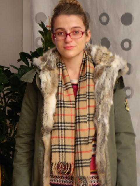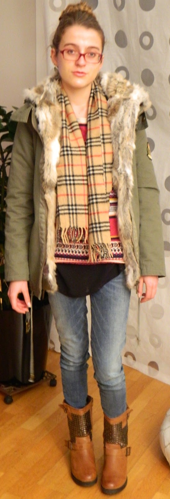 Vous pouvez voir ma nouvelle parka que je vous montrais ici ainsi que mes nouvelles bottes et mon nouveau jean. Bref que du neuf. Je trouve que ces deux couleurs s’accordent bien d’où l’association. Pour rester dans les mêmes tons, j’ai mis mon écharpe Burberry qui appartient à ma mère et l’a achetée quand cette marque était encore accessible. Pour la coiffure, mon coiffeur personnel Pierre a encore fait des merveilles.