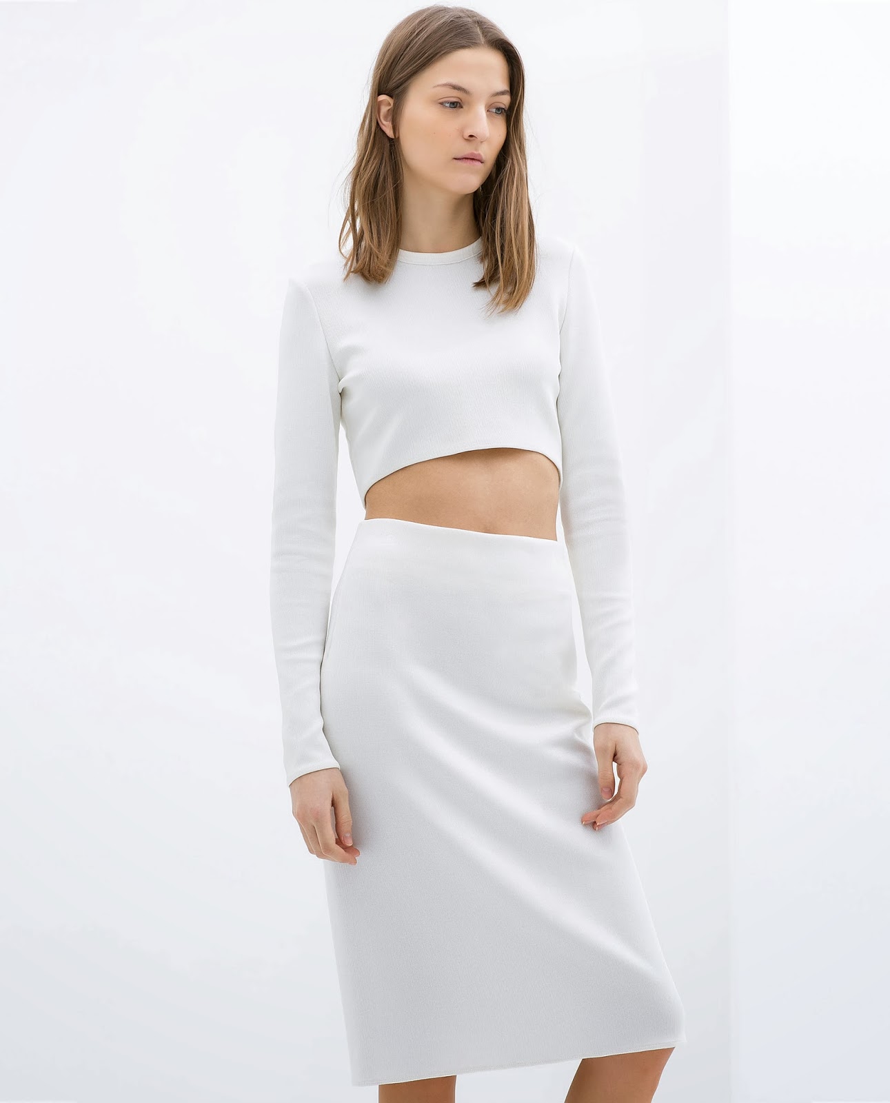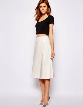Jupe Warehouse, sur Asos 70 € en similicuir fini brillant. A adopter en look bicolore avec un haut noir crop comme sur le modèle