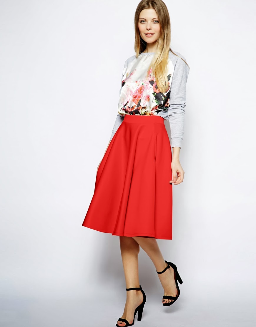 Jupe rouge en neoprene, Asos, 50 €. Parce que le rouge c’est la couleur toujours en vogue, et parce que le neoprene c’est LA matière du moment, mixez les deux, ça donne ça!