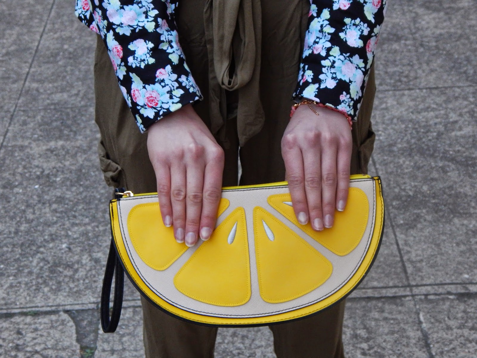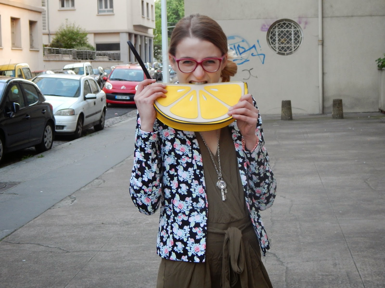 Quant à cette pochette, j’avais craqué sur la tendance des pochettes fruits, mais celles qui étaient déjà sorties depuis quelques temps chez New Look, je les trouvais trop petites. Dans celle-ci au moins, je peux mettre un peu plus de choses donc je l’ai embarquée. Je l’imaginais cet été à la plage, pour apporter une touche de fun. Et pour une soirée lyonnaise, avec le strict minimum dedans, elle est idéale.