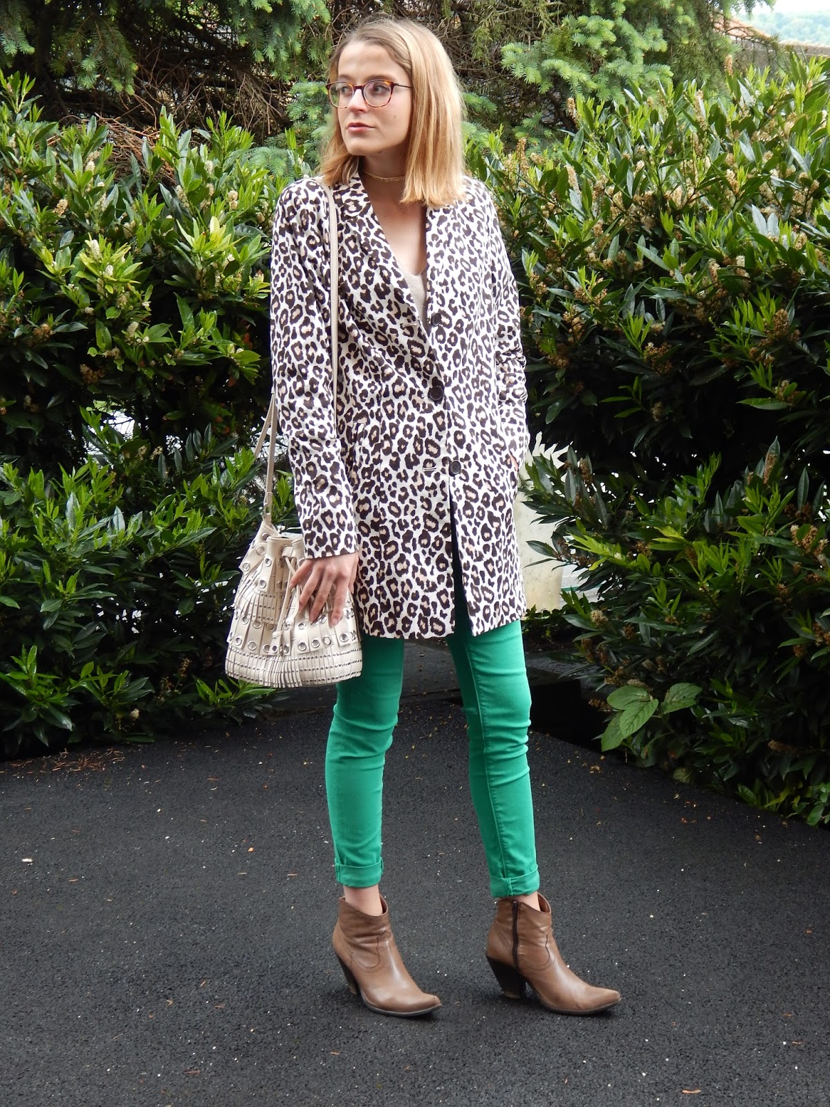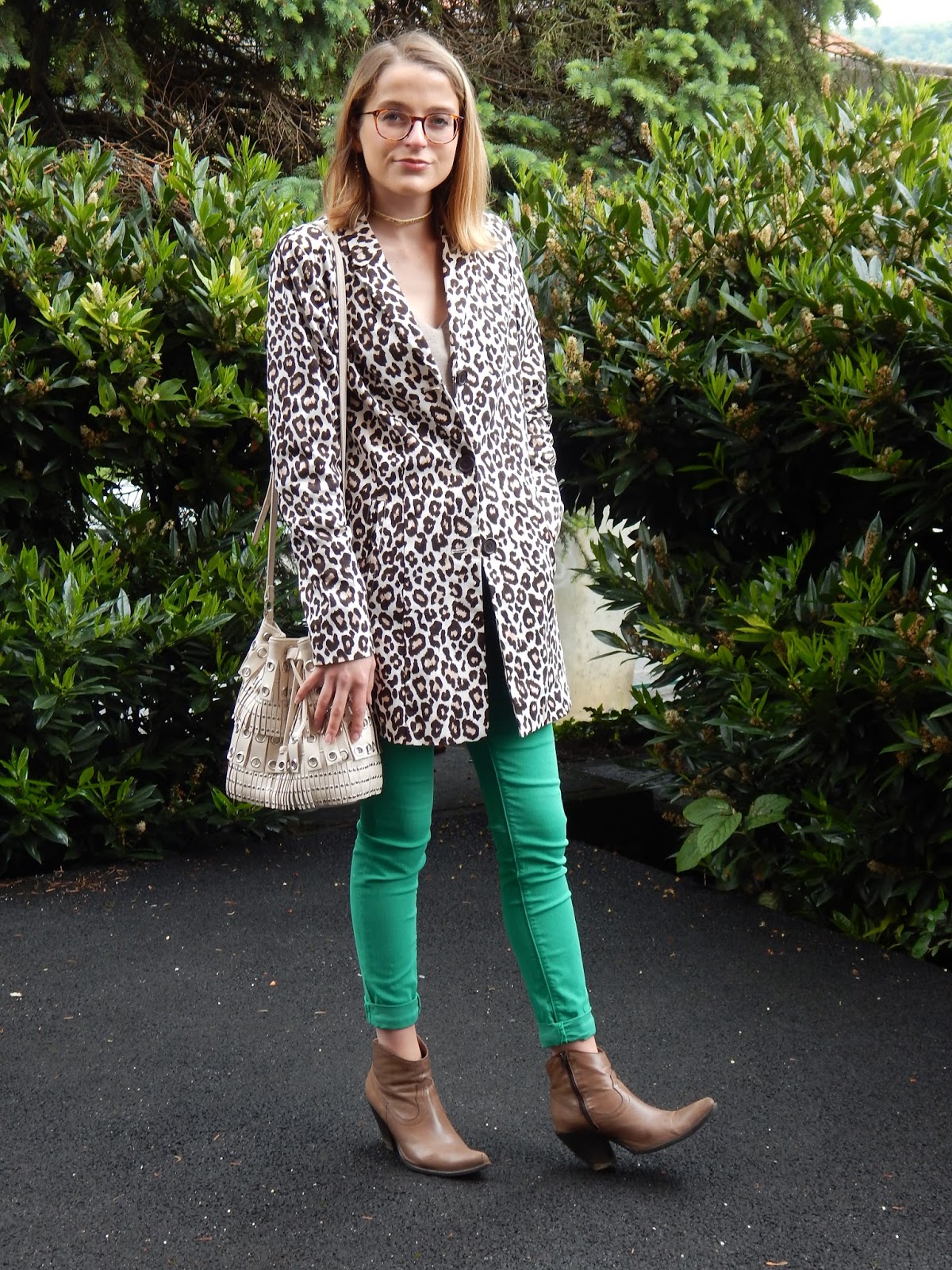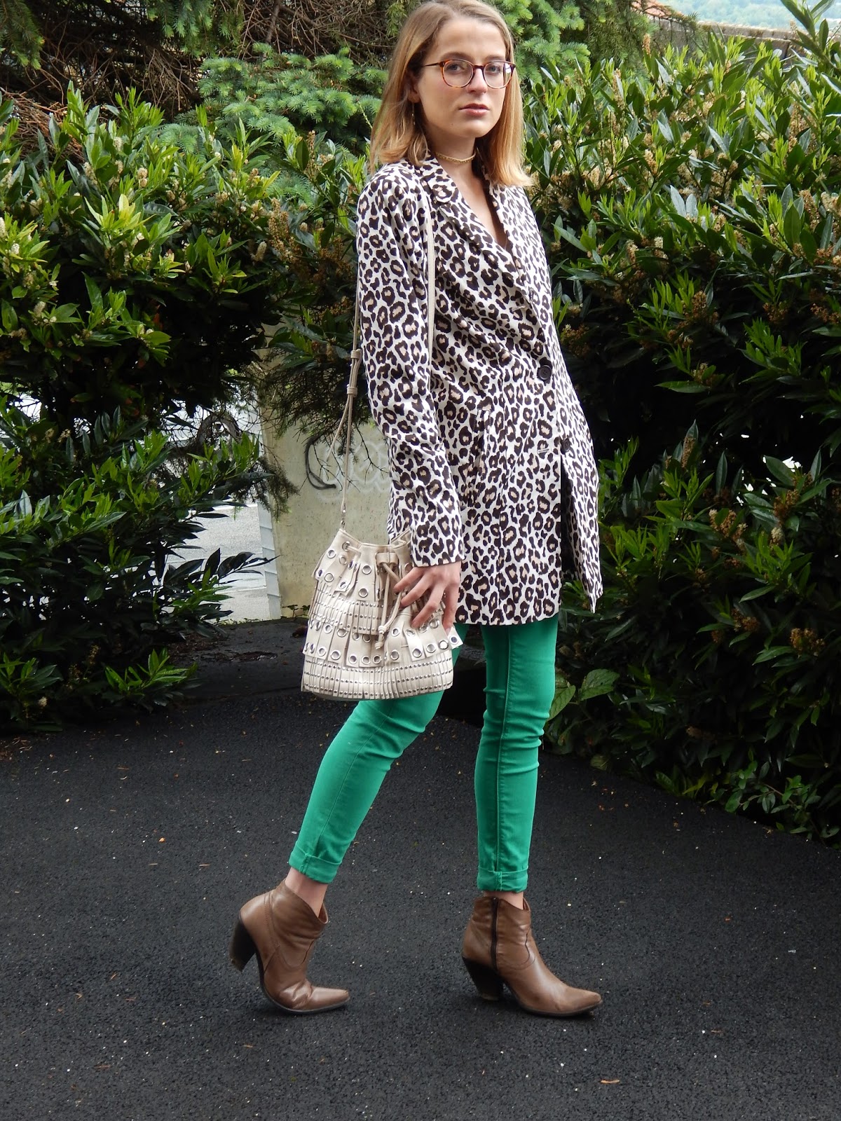 Il y a des périodes comme ça, où j’oublie un peu certains vêtements que j’ai s’ils ne sont pas en évidence sous mes yeux où dans mes rangements, alors qu’ils me plaisent… C’est une aberration, mais étant donné tous les vêtements que j’ai, il est facile de s’y perdre. D’ailleurs en ce moment j’ai trié beaucoup de choses, que j’ai mises en vente sur Vinted si vous êtes intéressées. Il y a de tout à petits prix, toujours en bon état, ne portant jamais beaucoup de fois une même pièce. Je parle donc de ce manteau léopard, idéal pour la mi-saison, parfait donc pour le temps où nous avons shooté ce look. Une dizaine de degrés, un temps couvert presque pluvieux, parfait pour le ressortir. La veille j’ai affronté le déluge avec lors d’une journée à Grenoble. Je porte un petit pull piqué dans le dressing de ma mère, auquel j’ai ajouté ce petit pin’s trop choupi shoppé dans le nouveau kiosque de Charly &Gaby dont je vous parlais dans cet article. Charlotte a emménagé dans un nouveau lieu super bien agencé et coloré, et j’y ai trouvé entre autre ce petit accessoire trop choupi. Depuis j’en ai commandé d’autres sur internet que je vous montrerai dans de futures tenues. Mon choker doré s’accordant aux couleurs de ma tenue, mon jean vert dont j’abuse en ce moment, j’adore toujours autant la matière super stretch, et le confort, en plus de la super couleur pétante. Mon sac Mango, et mes bottines marron, que j’avais délaissées elles aussi