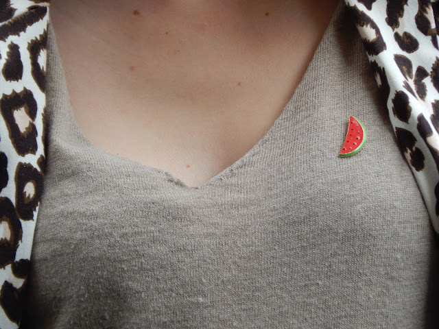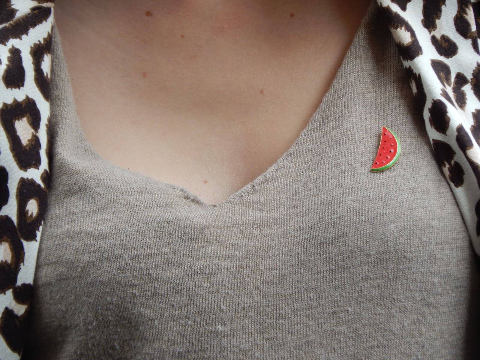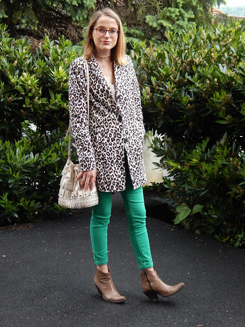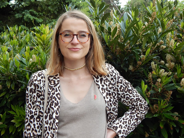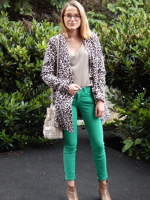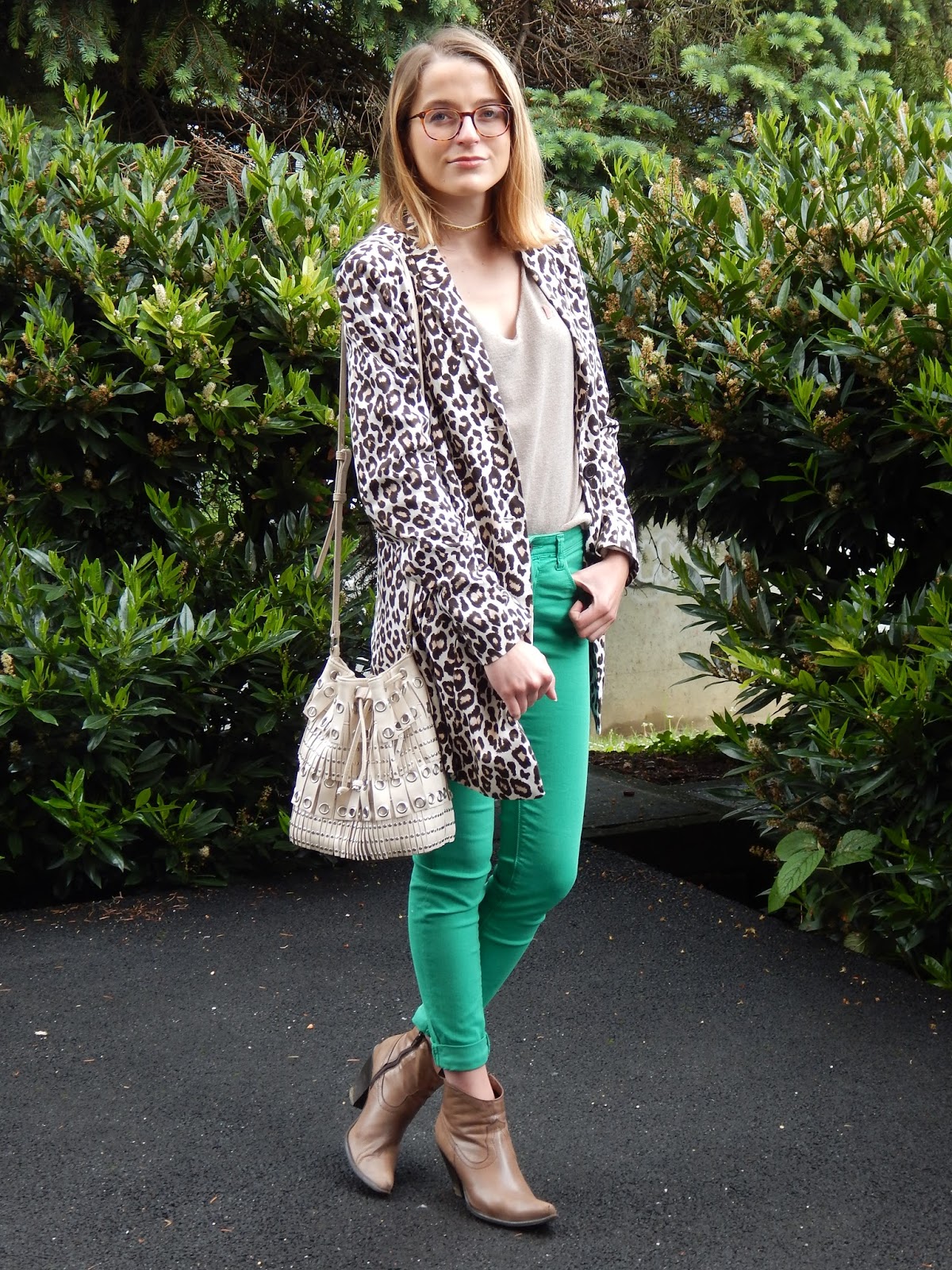 Il y a des périodes comme ça, où j’oublie un peu certains vêtements que j’ai s’ils ne sont pas en évidence sous mes yeux où dans mes rangements, alors qu’ils me plaisent… C’est une aberration, mais étant donné tous les vêtements que j’ai, il est facile de s’y perdre. D’ailleurs en ce moment j’ai trié beaucoup de choses, que j’ai mises en vente sur Vinted si vous êtes intéressées. Il y a de tout à petits prix, toujours en bon état, ne portant jamais beaucoup de fois une même pièce. Je parle donc de ce manteau léopard, idéal pour la mi-saison, parfait donc pour le temps où nous avons shooté ce look. Une dizaine de degrés, un temps couvert presque pluvieux, parfait pour le ressortir. La veille j’ai affronté le déluge avec lors d’une journée à Grenoble. Je porte un petit pull piqué dans le dressing de ma mère, auquel j’ai ajouté ce petit pin’s trop choupi shoppé dans le nouveau kiosque de Charly &Gaby dont je vous parlais dans cet article. Charlotte a emménagé dans un nouveau lieu super bien agencé et coloré, et j’y ai trouvé entre autre ce petit accessoire trop choupi. Depuis j’en ai commandé d’autres sur internet que je vous montrerai dans de futures tenues. Mon choker doré s’accordant aux couleurs de ma tenue, mon jean vert dont j’abuse en ce moment, j’adore toujours autant la matière super stretch, et le confort, en plus de la super couleur pétante. Mon sac Mango, et mes bottines marron, que j’avais délaissées elles aussi