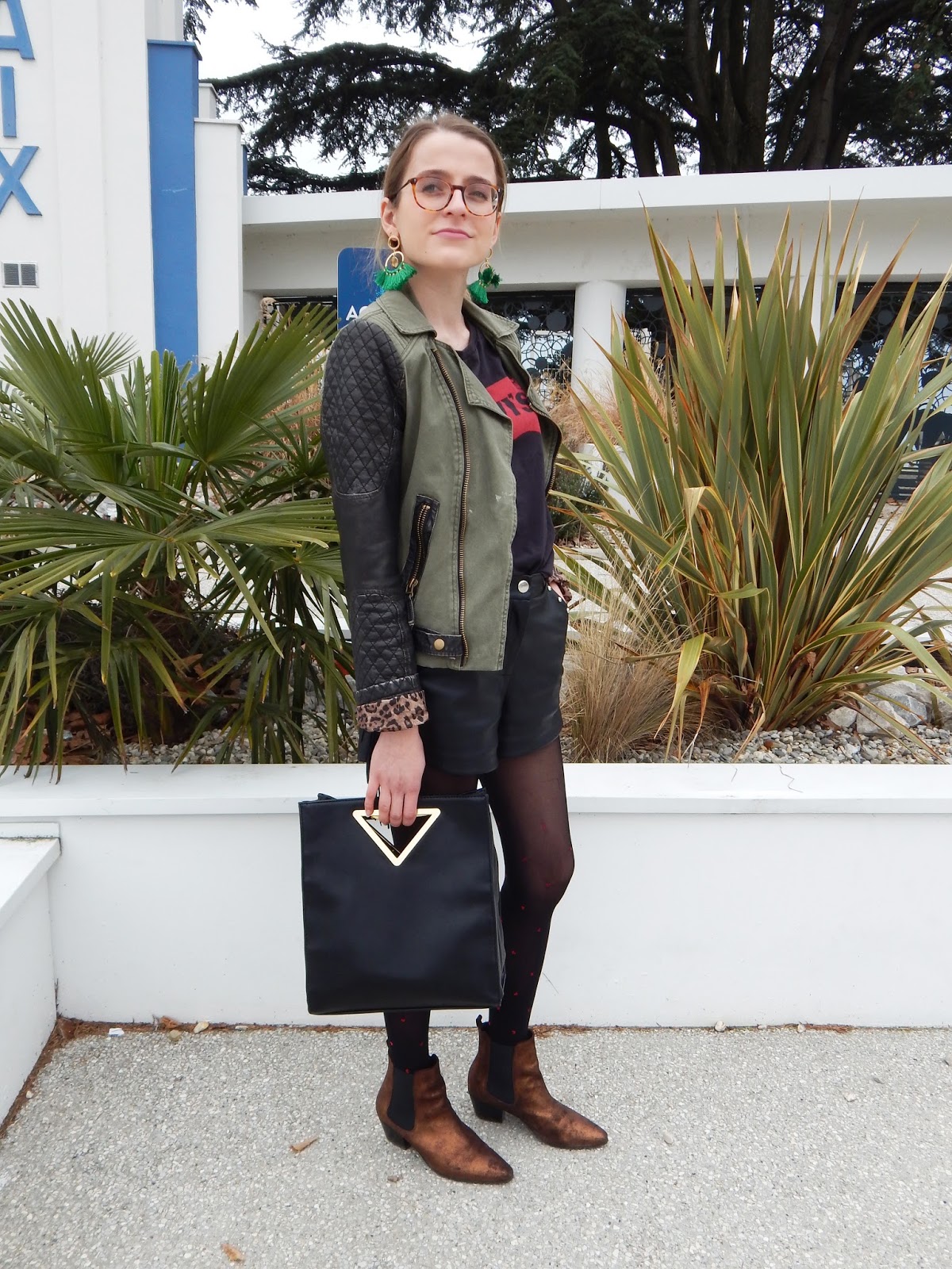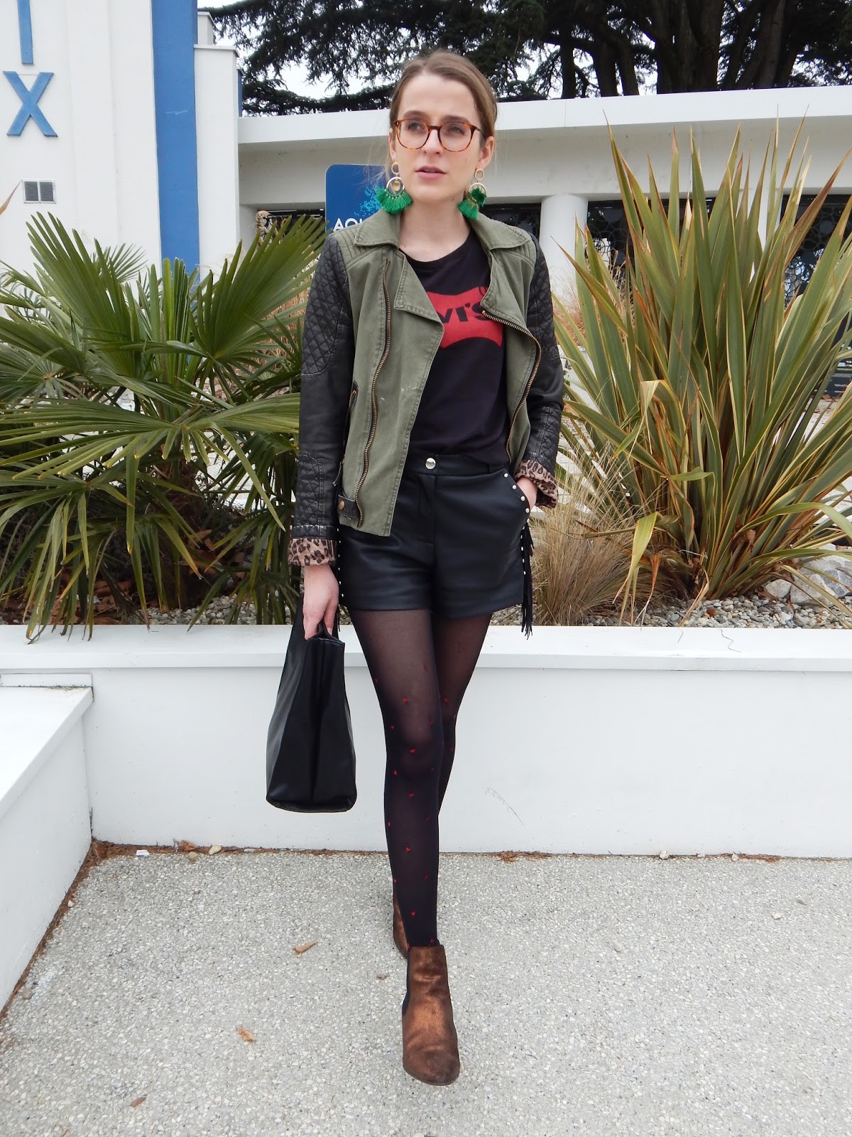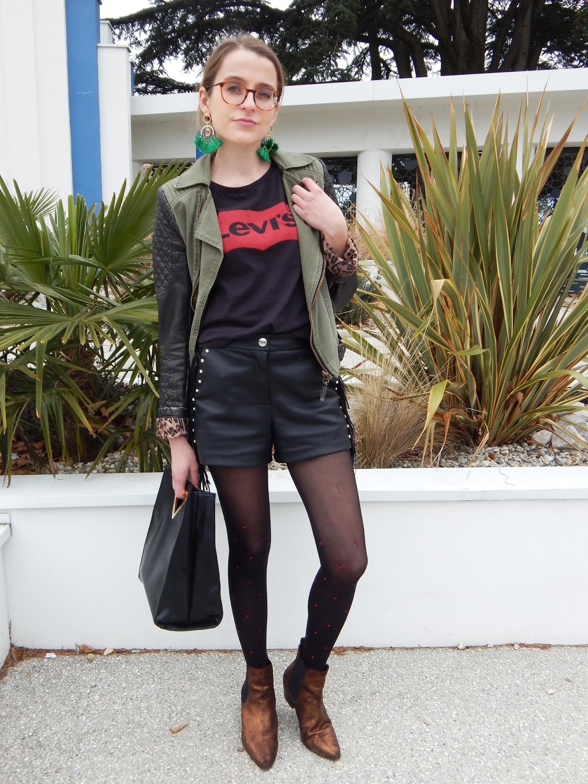 Veste/Jacket: Frime; Tee shirt: Levi’s; Sac/Bag; Short: Mango; Collants/Tights: H&M; Bottines/Booties: San Marina