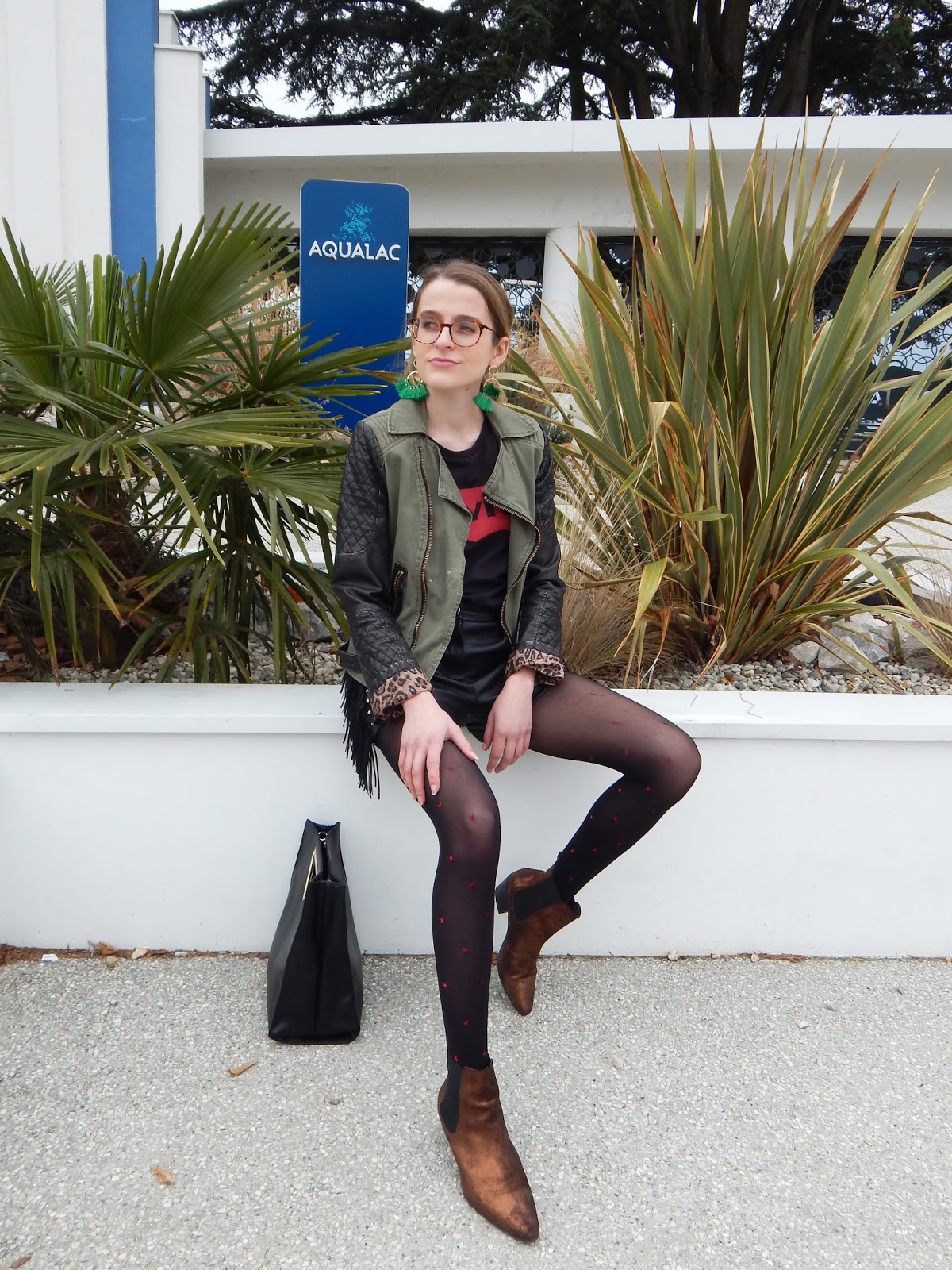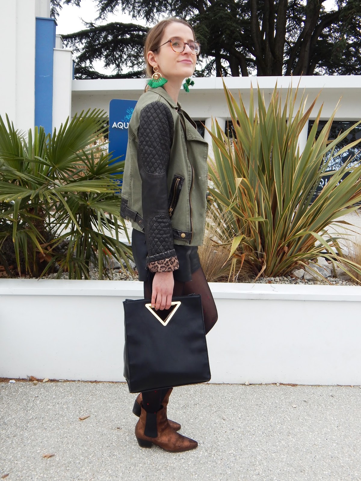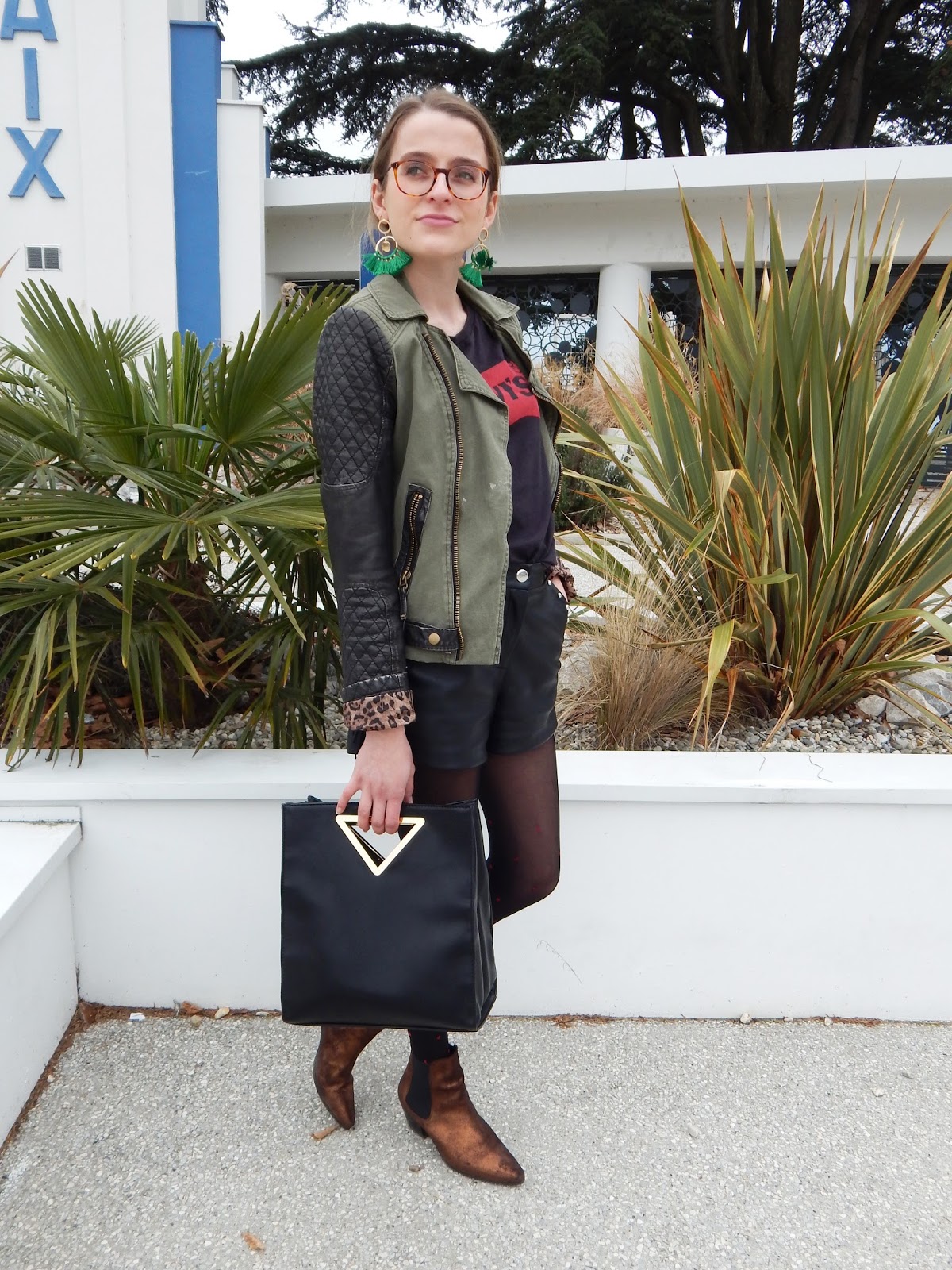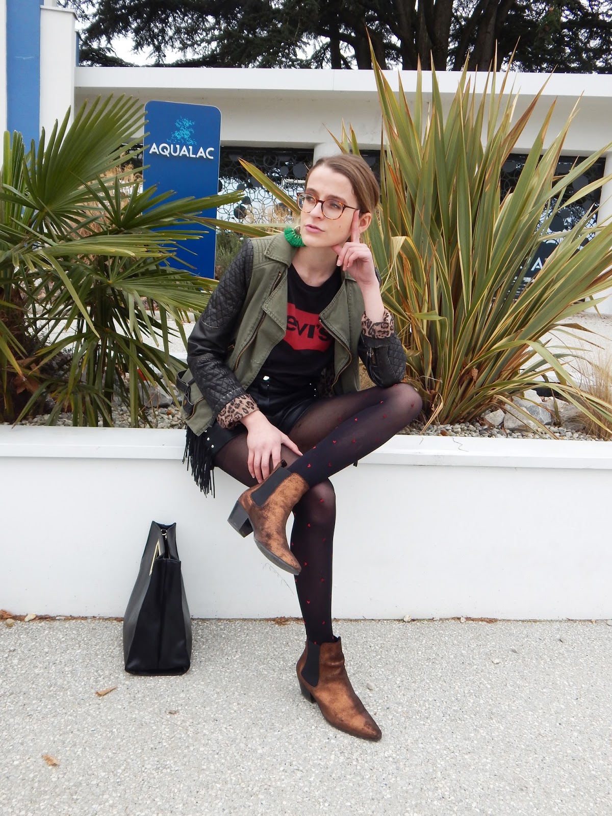 Veste/Jacket: Frime; Tee shirt: Levi’s; Sac/Bag; Short: Mango; Collants/Tights: H&M; Bottines/Booties: San Marina