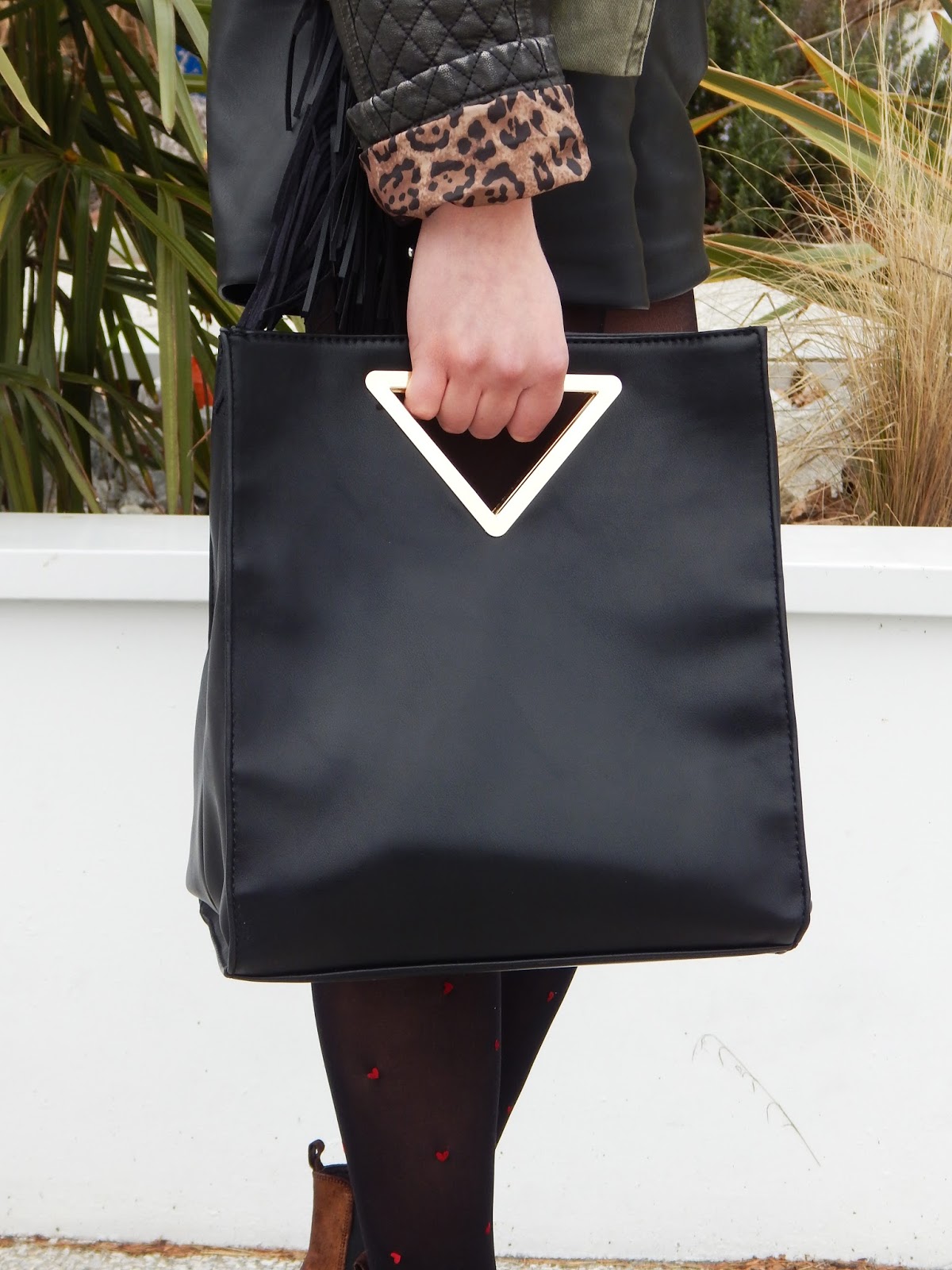 Une tenue composée de trois nouveautés, puisque je porte mon sac de chez Mango, sur lequel j’ai flashé semaine dernière en boutique. Je souhaitais me racheter des sacs, d’aspect un peu plus classe que ceux que j’ai. Histoire de changer aussi quoi. J’aime beaucoup le fait qu’on puisse le porter à la main, ainsi qu’en bandoulière ( je l’ai enlevée pour les photos). Il a une taille idéale, ni trop grand ni trop petit, et miracle je trouve hyper facilement mes affaires dedans! Il est assez rigide, chose que j’aime bien, de cette fa_on on peut trouver facilement ce que l’on cherche. J’en suis plus que ravie, et le fait qu’il soit noir ira avec toutes mes tenues.
