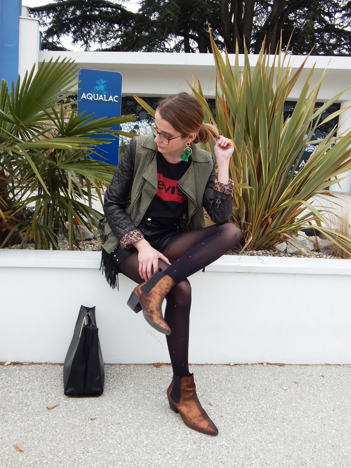 Quant au reste, je reporte cette petite veste bi-matière que je n’avais pas portée depuis un moment, mon short frangé que je portais cet hiver avec un gros pull et cette paire de bottines bronze que je porte et reporte à toutes les sauces. Je vous les présentais d’ailleurs dans ma vidéo de ma collection de bottines. Oui oui, j’ai vraiment une vidéo sur ma collection de bottines…