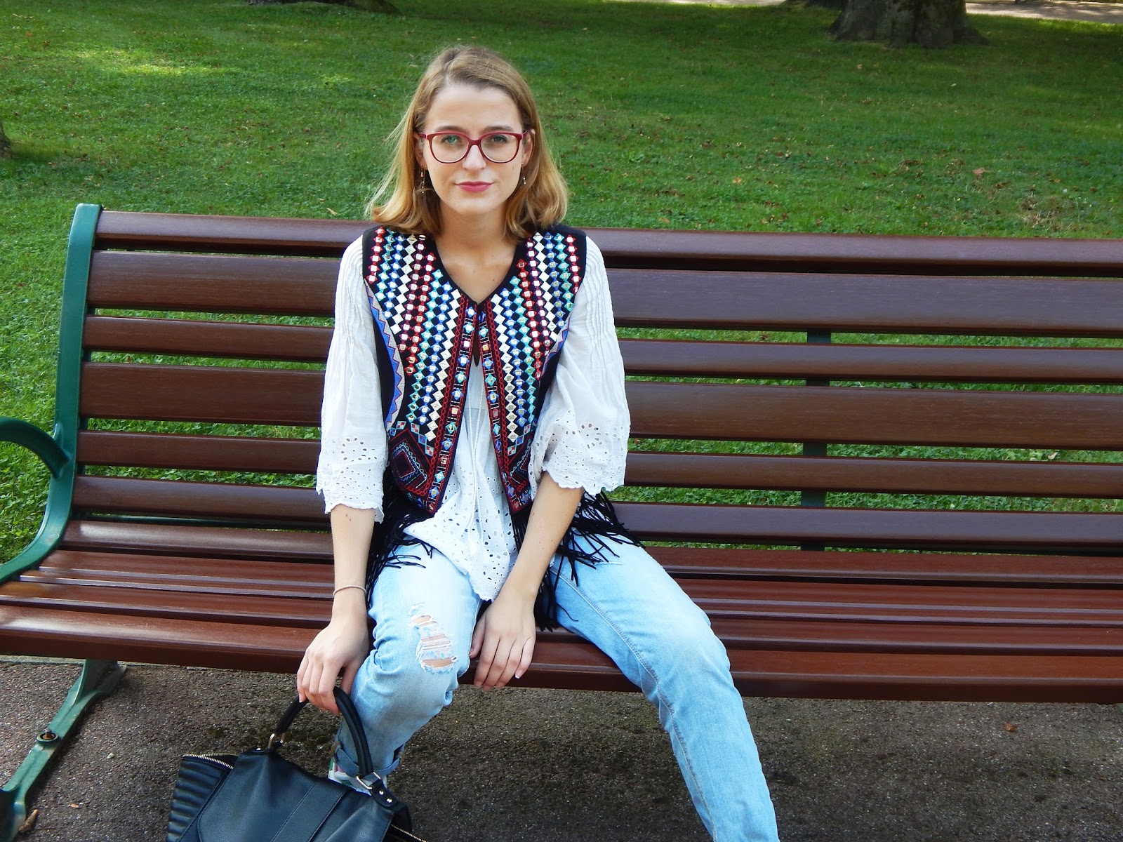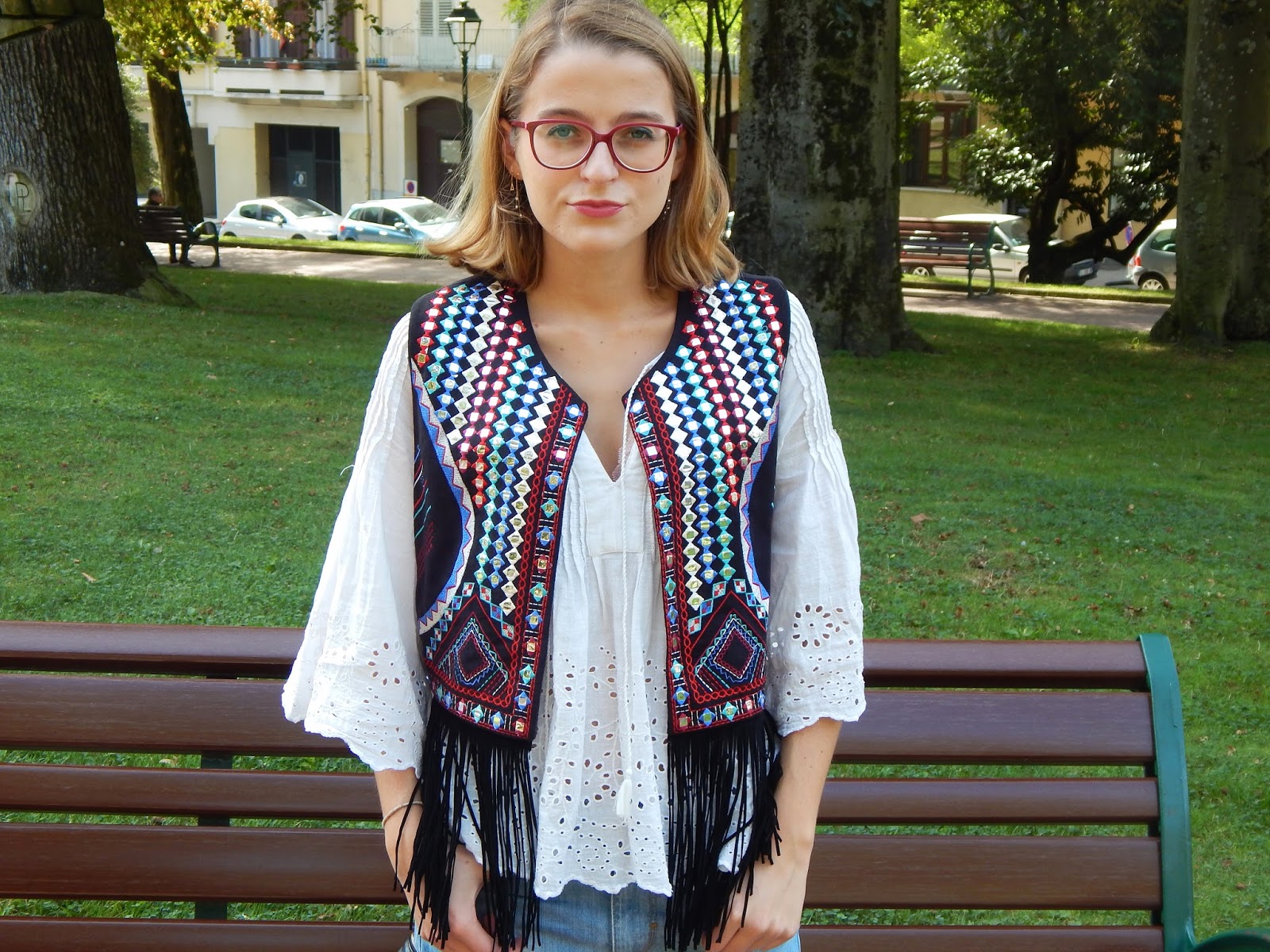 Et pour un effet plus original et coloré, j’ai ressorti mon gilet genre daim tout rebrodé de mini miroirs colorés. J’avais acheté cette veste sans manches chez Charly&Gaby à Aix, et vous avez vu ce gilet avec mon jean slim ici.