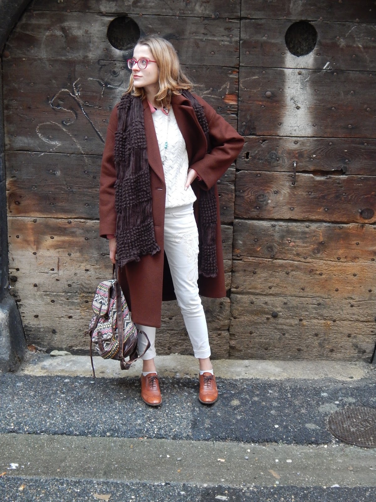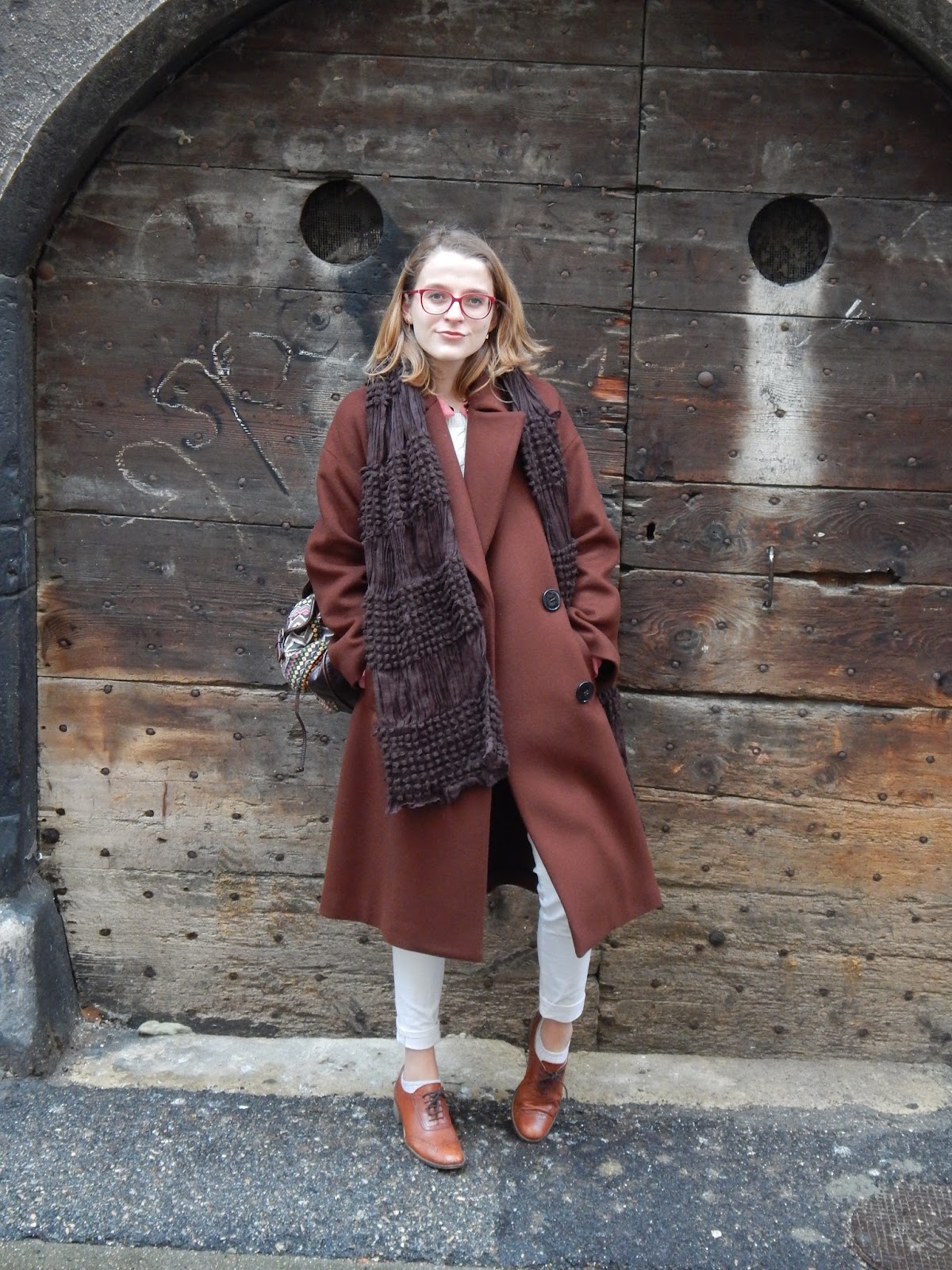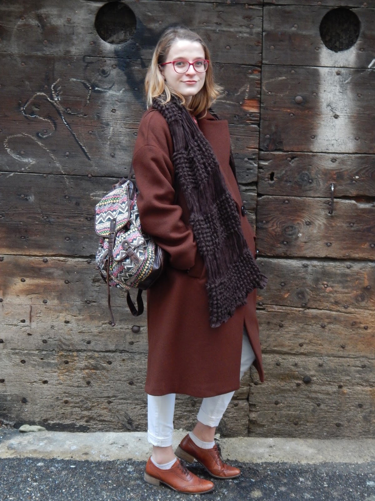La couleur de ton manteau est originale, j'ai presque l'impression que le marron tire sur le rouille, mais j'aime beaucoup, il te va très bien ! Je pense que c'est pas évident à porter et pourtant, on dirait pas puisque tu le fais super bien ! Les pièces blanches du reste de ta tenue le mettent bien en valeur et j'adore tes chaussures. 🙂