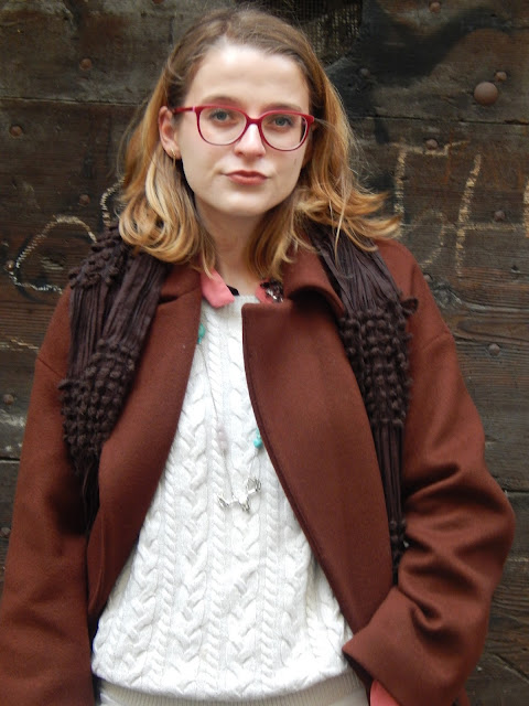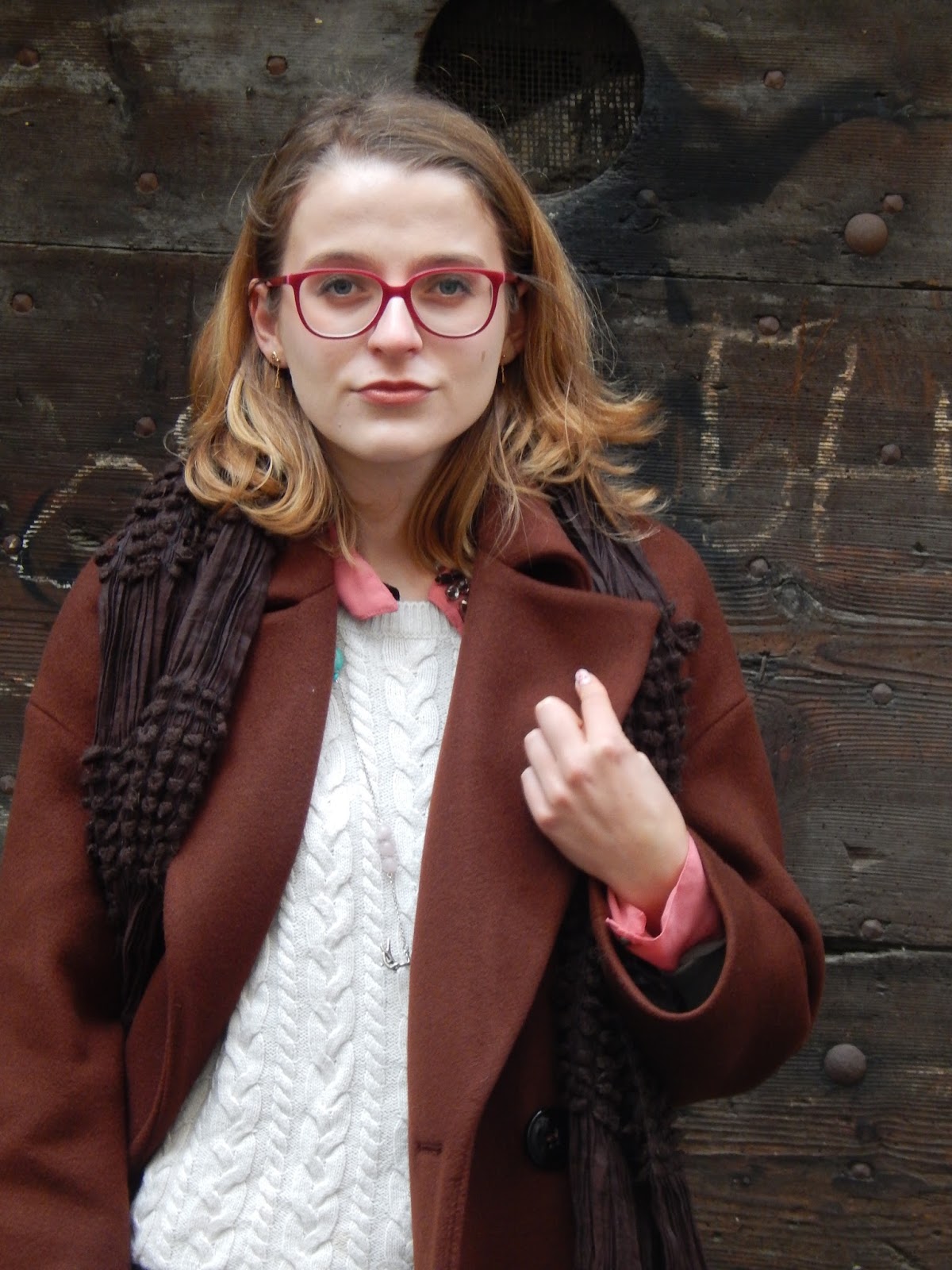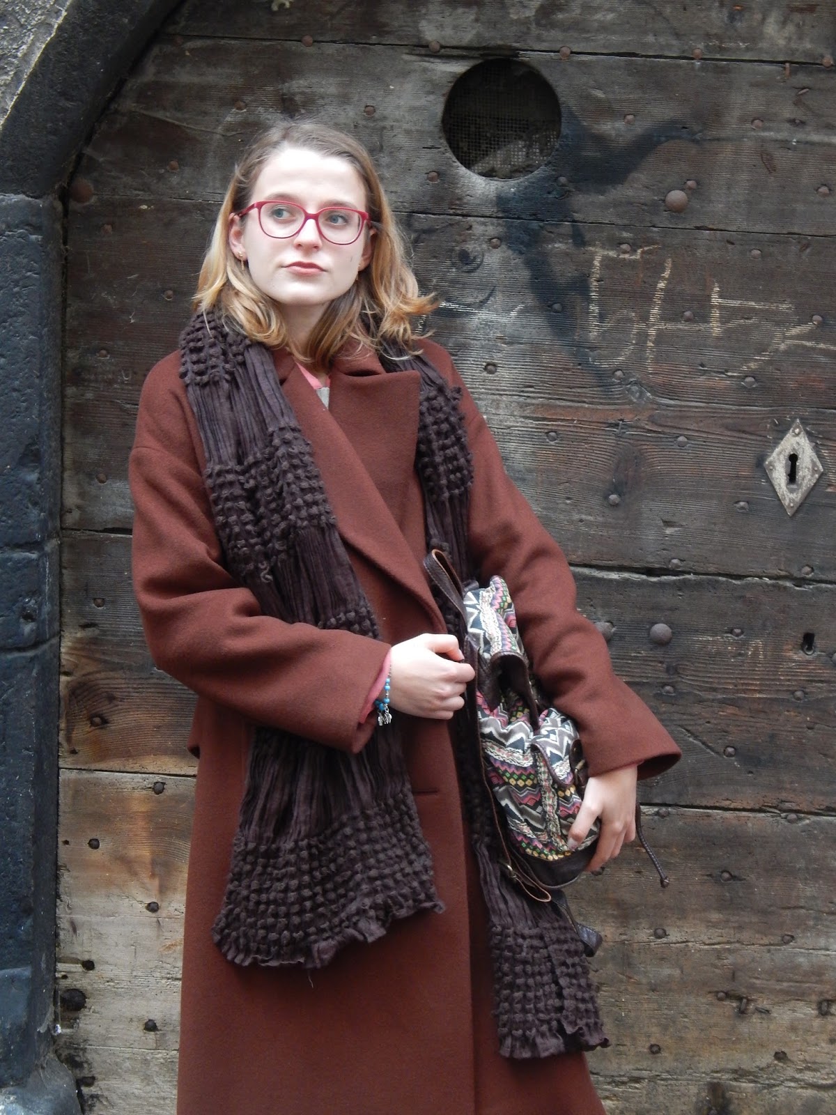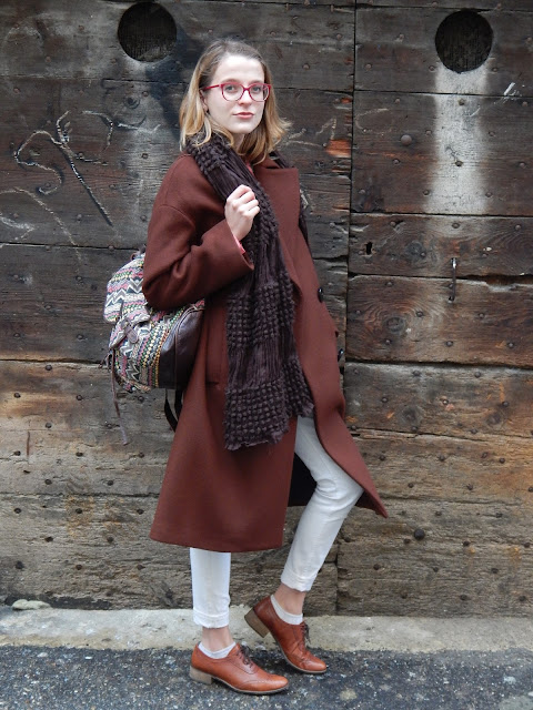 La couleur de ton manteau est originale, j'ai presque l'impression que le marron tire sur le rouille, mais j'aime beaucoup, il te va très bien ! Je pense que c'est pas évident à porter et pourtant, on dirait pas puisque tu le fais super bien ! Les pièces blanches du reste de ta tenue le mettent bien en valeur et j'adore tes chaussures. 🙂