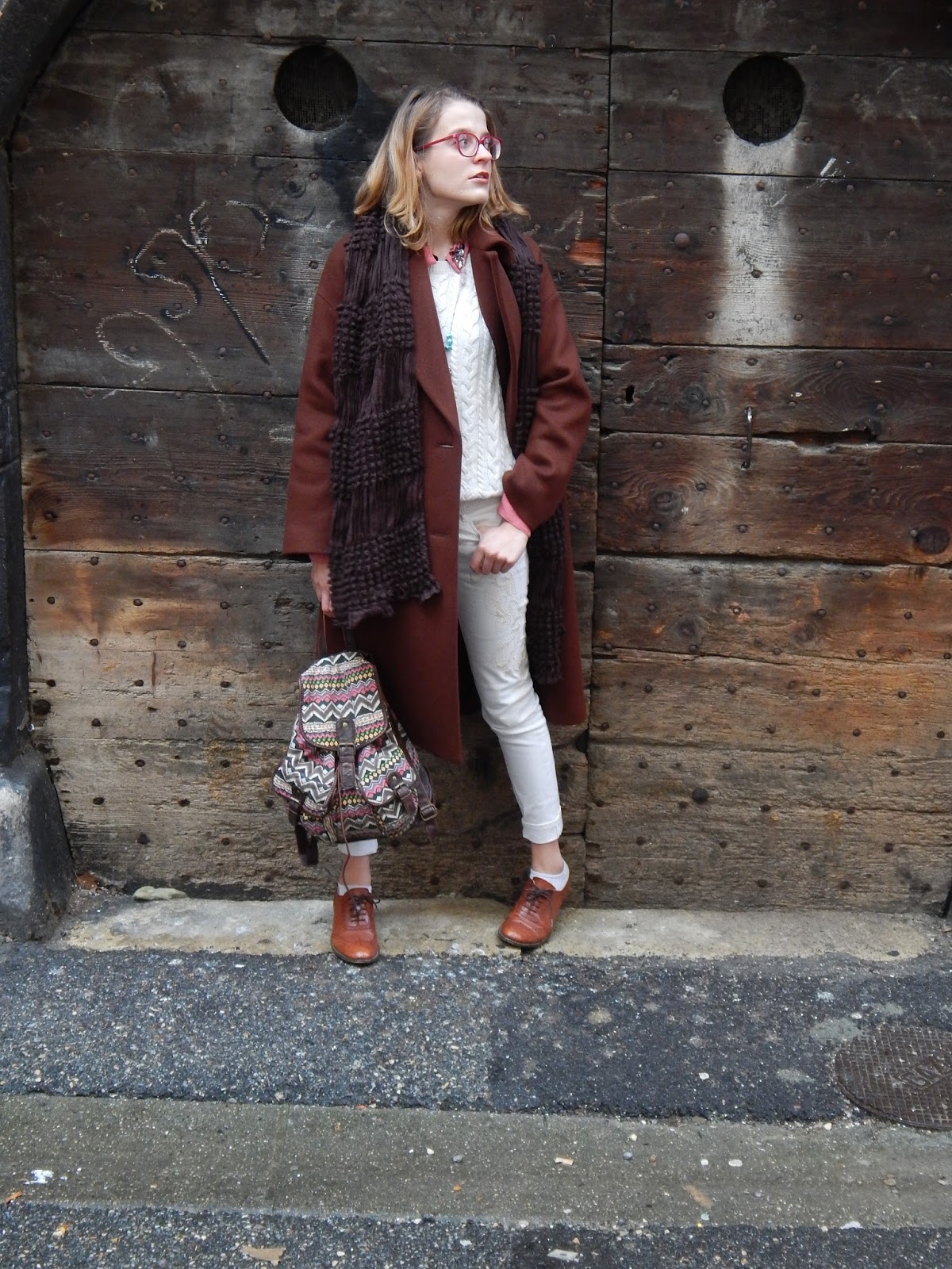 Je vous avoue que perdre 30 degrés en l’espace de deux jours, c’est pas terrible. Du coup j’étais congelée. Pour rester dans les mêmes tons, j’ai ressorti les derbies marron, que je ne mets quasiment jamais, pourtant je les aime vraiment beaucoup. Mon sac à dos pour changer des sacs à main, et surtout pour rester dans les mêmes tons, puisque je n’ai pas de sac à main marron foncé. En dessous, c’était total white. J’aime bien les looks monochromes, c’était aussi l’occasion de ressortir mon pull H&M, que je ne sors que très rarement. En dessous, ma chemise Bershka, que vous avez pu voir dans mon dernier look, et mon nouveau collier reçu aussi pour Noel. J’espère que ce look vous plaira.