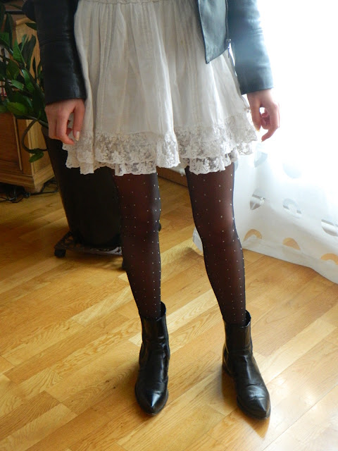 Je vous présente ma petite jupe en dentelle blanche. Ma préférée. Je l’adore littéralement. Puisqu’à la base c’est une jupe d’été, j’ai décidé d’y ajouter des collants. Mes noirs à plumetis blancs. Je trouve que ça rend plutôt pas mal. J’aimais bien l’idée été+hiver. Etant donné que la jupe est unie et les collants plutôt sombres, j’ai voulu y associer une chemise colorée, imprimée. Une de celles que je préfère. Quant à ma coiffure, il s’agit d’une tresse à 11!!! Vous avez bien entendu, 11 brins! C’est un ami qui me l’a faite qui est plus que doué pour les coiffures. Futur coiffeur de stars!!!