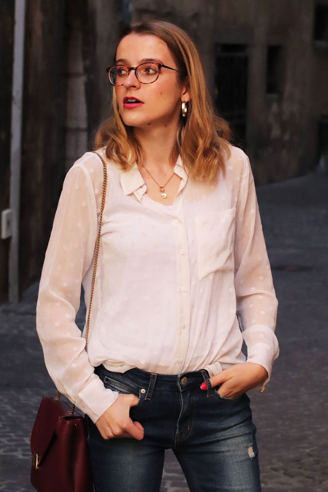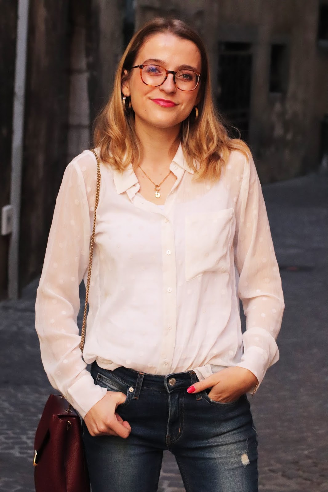 J’en suis absolument ravie vous n’imaginez même pas. Je porte une petite chemise en dessous, la dernière pièce de mon craquage chez Stradivarius qui date d’il y a maintenant deux mois. Comme elle est complètement transparente, je porte un petit haut en dessous.