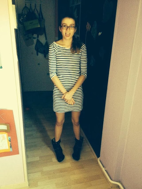 Tel était le cri de guerre des gens de ma classe lors de la présentation de notre promo. Je leur pique donc, puisque ça correspond très bien à ma tenue. Ma robe marinière que j’ai depuis bien trois ans, portée sans collants pendant ma seule et unique semaine de vacances. Le samedi 26 il était possible de ne pas mettre de collants, en parlant de ça dans la semaine qui avait precede, un jour j’ai mis un short. Il faisait 20º. Truc de dingue. Pour cette tenue, donc, ma robe, mon perf clouté et les bottines afin de rester dans le côté rock. Je vous avais montré cette robe l’année derniere dans un look bleu puisque j’avais associé des collants bleus que vous pouvez retrouver ici