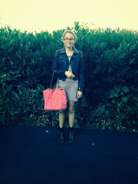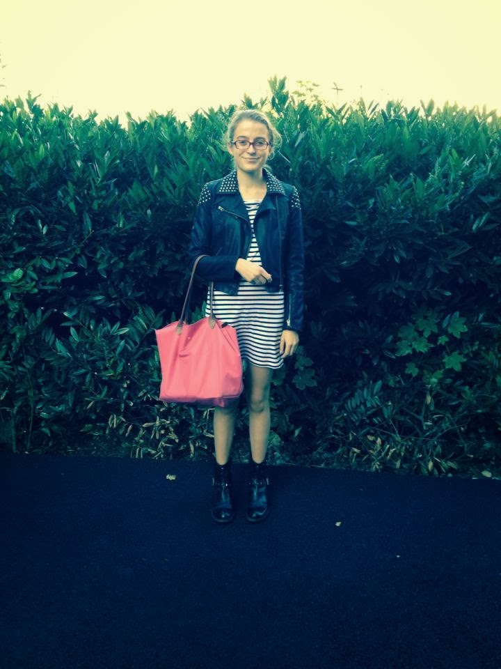 Tel était le cri de guerre des gens de ma classe lors de la présentation de notre promo. Je leur pique donc, puisque ça correspond très bien à ma tenue. Ma robe marinière que j’ai depuis bien trois ans, portée sans collants pendant ma seule et unique semaine de vacances. Le samedi 26 il était possible de ne pas mettre de collants, en parlant de ça dans la semaine qui avait precede, un jour j’ai mis un short. Il faisait 20º. Truc de dingue. Pour cette tenue, donc, ma robe, mon perf clouté et les bottines afin de rester dans le côté rock. Je vous avais montré cette robe l’année derniere dans un look bleu puisque j’avais associé des collants bleus que vous pouvez retrouver ici