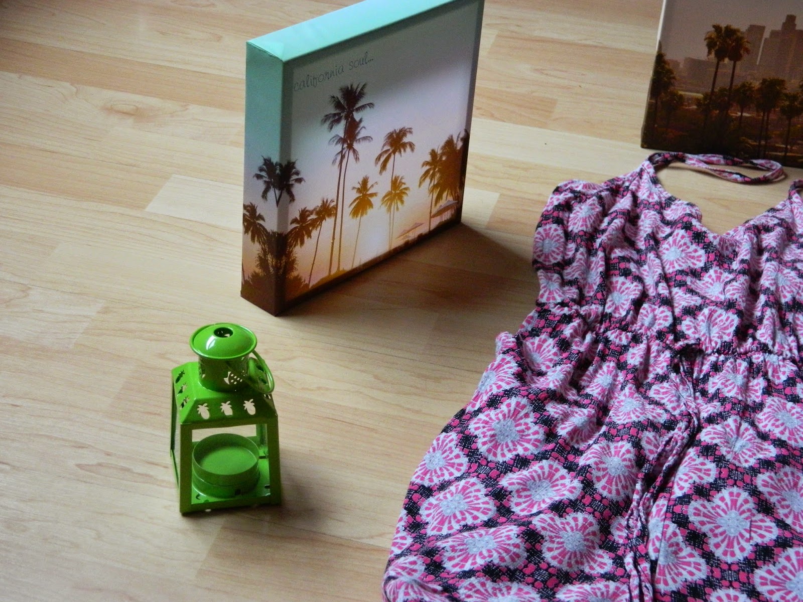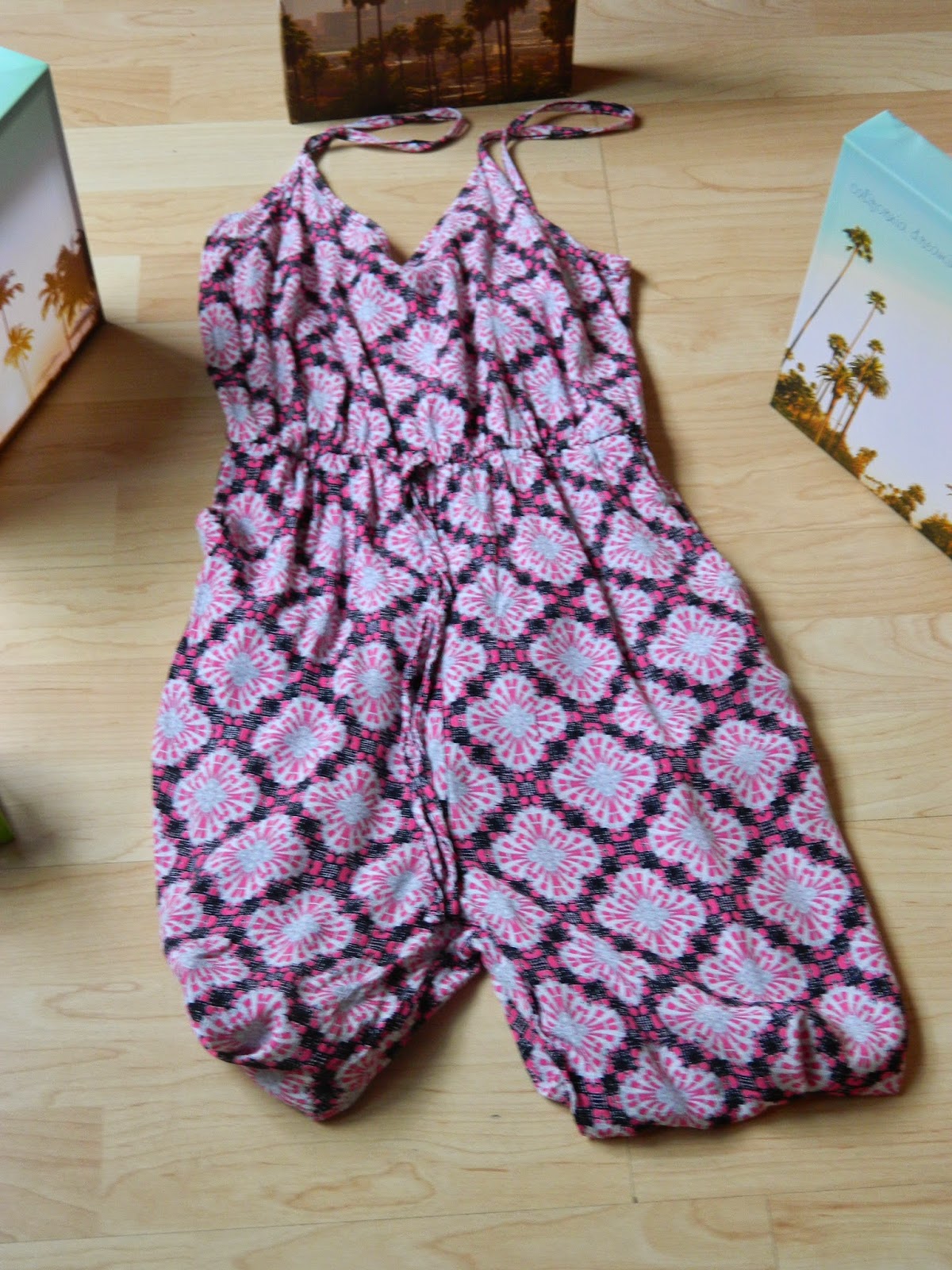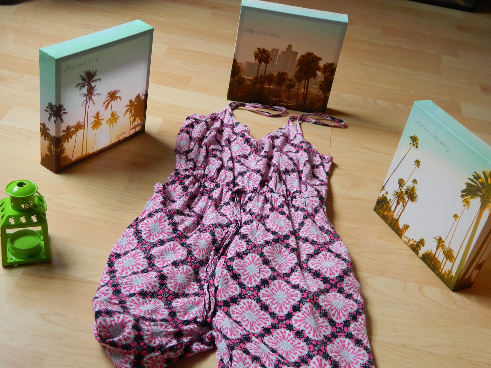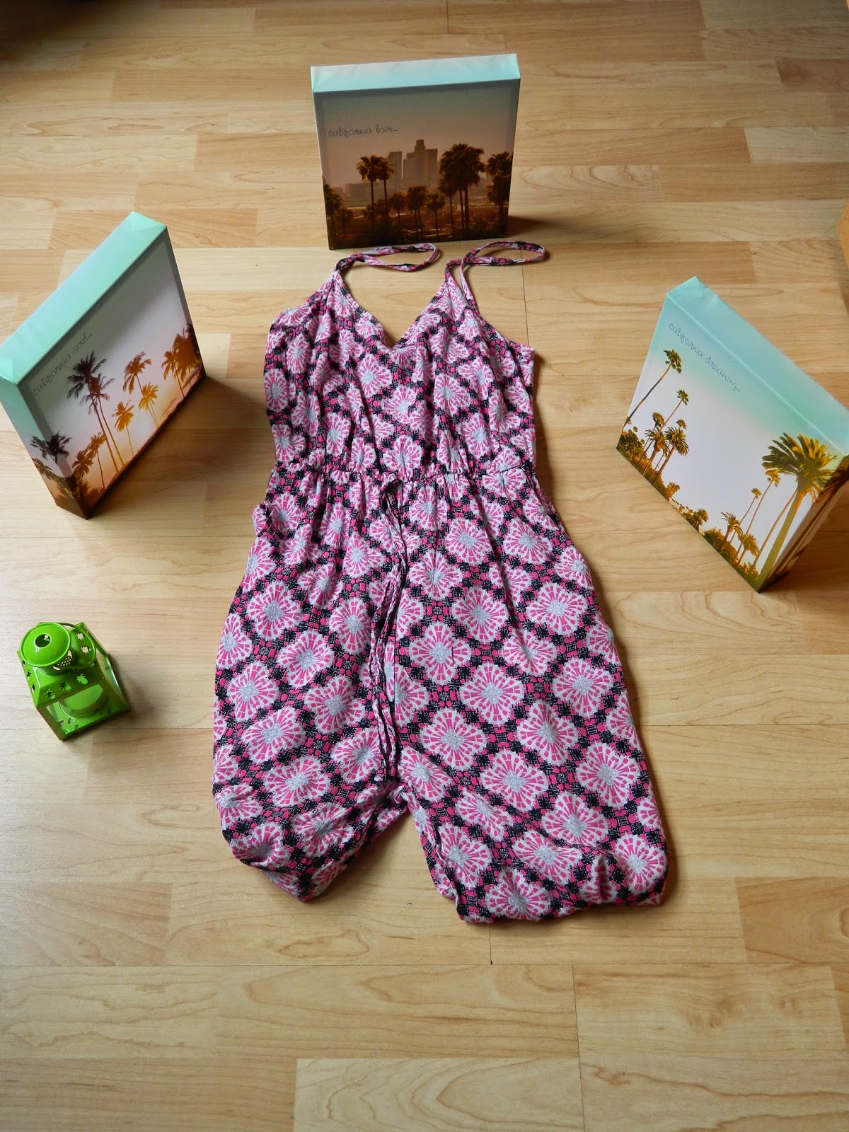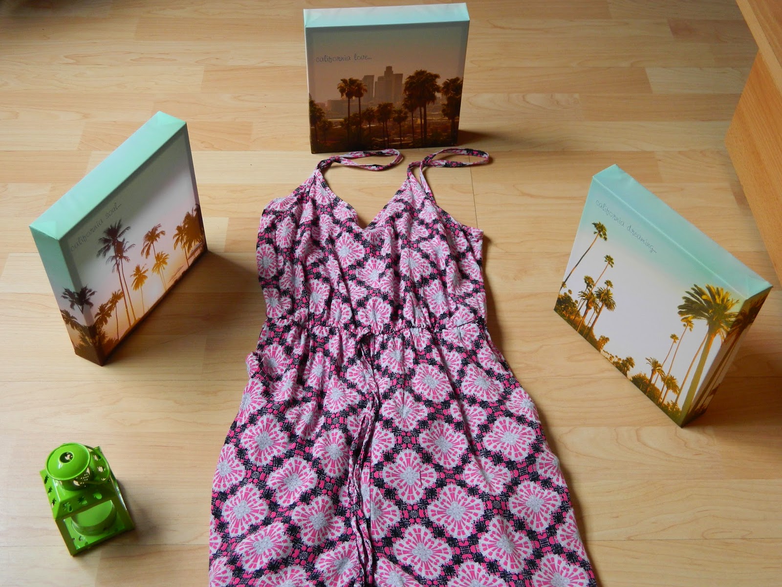 Nous avons d’abord commencé par le rez-de-chaussée avec la déco que j’ai vraiment appréciée. Du coup, j’ai emporté ces trois jolis tableaux pour 5€ ( un avant goût d’un potentiel futur séjour en Californie peut être?). J’ai également emporté sous le bras ce joli photophore que j’imaginais offrir à ma mère afin de décorer les tables de sa crêperie. Finalement on l’a gardé à la maison. Quant aux vêtements( que j’étais hyper impatiente de découvrir), il y avait beaucoup de choix. J’ai notamment été stupéfaite devant le rayon sacs. J’ai d’ailleurs hésité à prendre une pochette couleur abricot, mais cette couleur n’étant pas évident à associer, j’ai renoncé. Juste derrière, il y avait pleins de combi-pantalons. Vous savez mon goût particulier pour les combis ces derniers temps, je m’y suis donc attardée. J’en ai repéré une jolie, mais pas ma taille. Finalement, je tombe sur la rose que vous pouvez voir sur les photos à 17€. Au moment de l’essayage, dans le coin cabine absolument énormissime ( il y avait pas moins d’une trentaine de cabines au bas mot), je me rends compte que la combi tombe au niveau des épaules. En fait, le bouton qui devait se fermer dans le dos était décousu, du coup voilà. Je l’ai quand même prise, et un petit point plus tard, c’était ok. Je l’ai portée plusieurs fois dont dans cet article en bord de lac. Je n’ai rien pris d’autre parce que je n’ai pas trouvé ça top. Ma cousine a eu la même opinion, et pourtant, l’une comme l’autre, sommes loin d’être difficiles. Je pense que la période post-soldes a fait que les nouvelles co n’avaient pas encore tellement pointé le bout de leur nez. Au niveau des prix, pour la déco je n’ai rien à redire, mais au niveau vestimentaire, notamment pour ma combi, j’ai entendu beaucoup dire que les prix étaient très bas, du coup, je pensais que cela serait encore moins cher. Bon, je ne vais pas me plaindre. 17€ pour une combi, ce n’est pas énorme. Par contre, je pense qu’en Angleterre, les prix sont peut être plus bas.