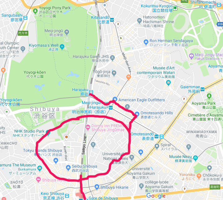 Zone rose: Où nous avons déambulé approximativement dans Shibuya
