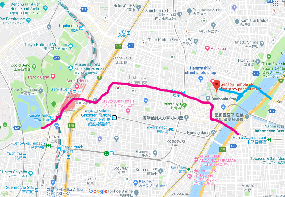 – Trait rose: Notre trajet approximatif pour aller jusqu’au parc Ueno