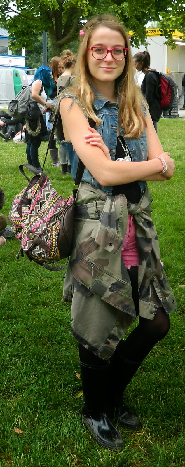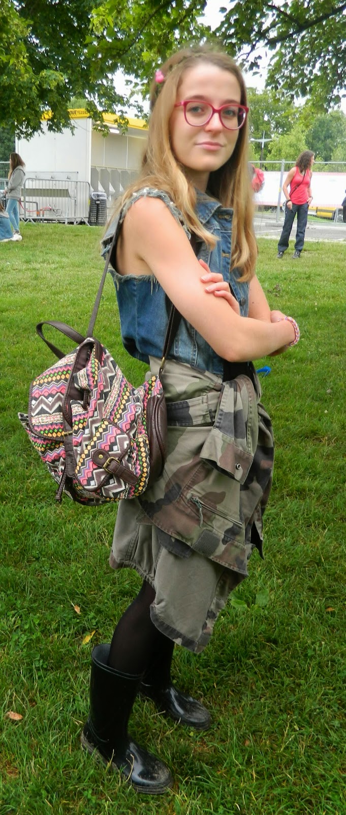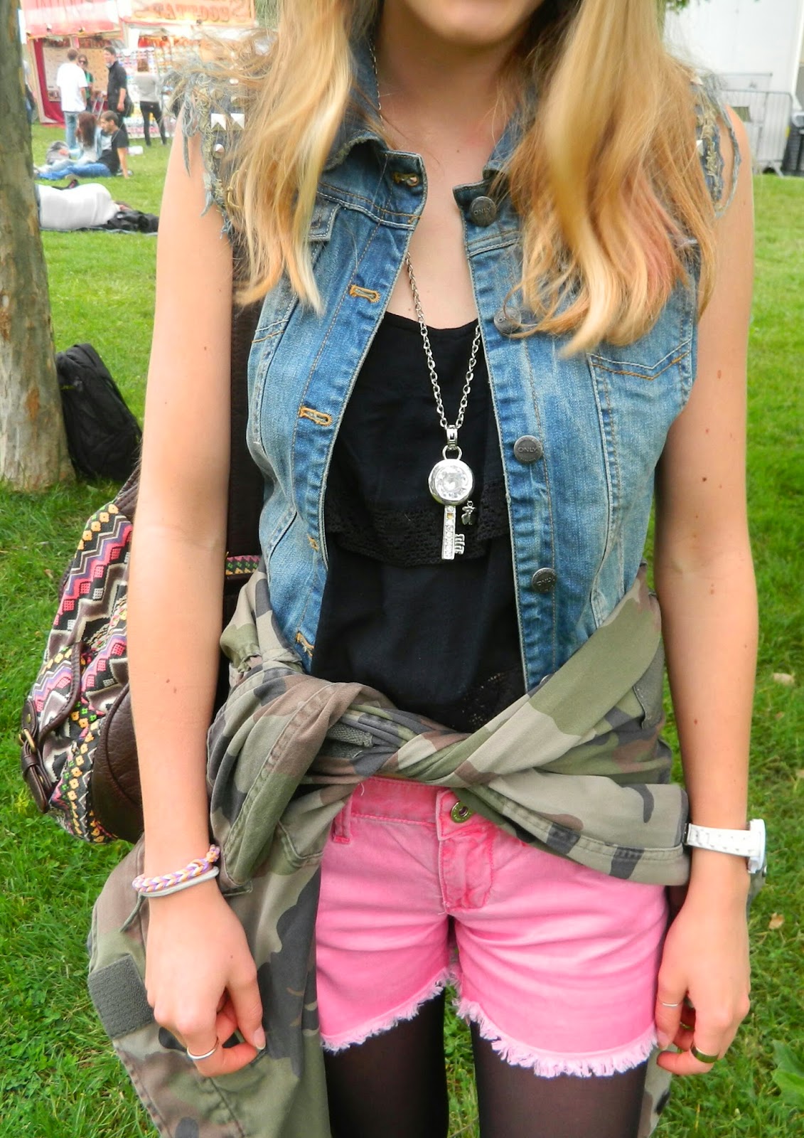 Comme je vous l’ai dit dans mon post inspirations Coachella, j’ai passé trois jours à un festival de musique: Musilac. Le temps n’était pas au rendez-vous, puisque pluie et aux alentours de 15°. Du coup, j’ai du adapter mes tenues. Au lieu d’un simple short, un collant était de rigueur ainsi que des bottes en caoutchouc tellement la boue était omniprésente. Pour être dans le thème festival ( puisque j’adore porter ce genre de looks), j’ai opté pour ma veste militaire trouvée dans une friperie lyonnaise (Tilt Vintage rue Victor Hugo). En dessous, ma veste cloutée sur mon nouveau petit top Jennyfer payé 5€. Avec sa dentelle et sa forme il est parfait. Mon short rose enduit mon headband fleuri, mon collier clé, et mon fidèle sac qui m’a accompagnée durant ses trois jours, acheté il y a trois ans chez New Look, mais que n’ai quasiment jamais mis( j’ai bien tort). En avant la musique! Finalement j’étais bien parée puisque je n’ai pas eu froid. Il faut dire que London Grammar, M, Shaka Ponk et Fauve ont enflammé le festival!