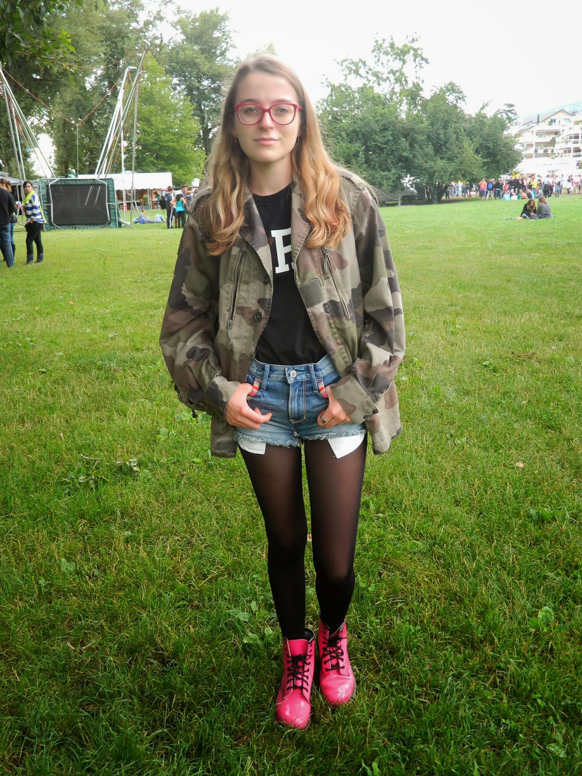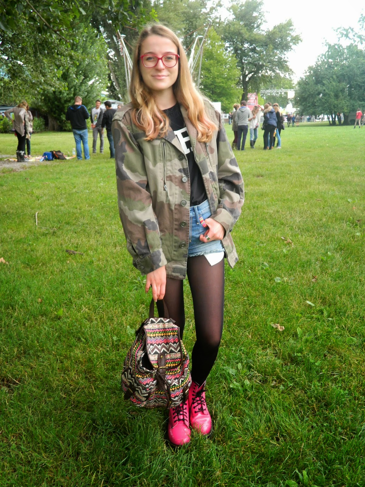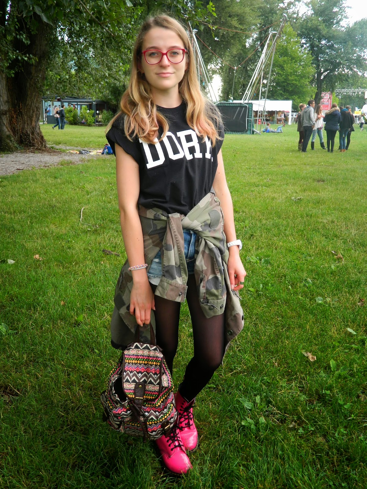 Deuxième jour de festival. Et pas le meilleur selon moi. Malgré un début plutôt sympa puisque nous avons pu faire dédicacer le programme par Skip the Use, la suite était moins cool. Heureusement, Haim un groupe américain composé de trois soeurs était une vraie révélation nous avons passé un moment très sympa. La suite avec Skip the Use l’était beaucoup moins. Nous étions entassés et le chanteur a eu la grande idée de nous faire bouger à droite, à gauche, ensemble. Intelligent quand 10 000 personnes sont entassées. Bref, pas le meilleur moment de ma vie d’autant qu’avant je me suis pris la tête avec cinq gamins qui faisaient le bazar. Sinon, parlons look. Pour ce deuxième jour, toujours pas très chaud( mais finalement ce n’est vraiment pas plus mal sinon on étouffe), la veste militaire était encore de sortie comme le sac. J’ai misé sur mon teesh Topshop « Dork » qui veut dire « idiot » ou « stupide » en anglais. J’aime beaucoup cette dérision. Mon short Hollister et mes Doc pour donner une touche de couleur. Elles sont vite devenues boueuses pour ne pas dire complètement dégoûtantes. Heureusement étant donné qu’elles sont en plastique, je n’ai pas eu de mal à faire partir tout ça.