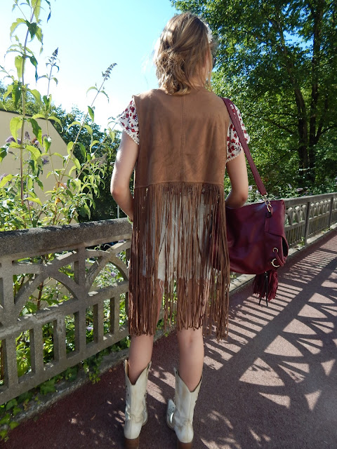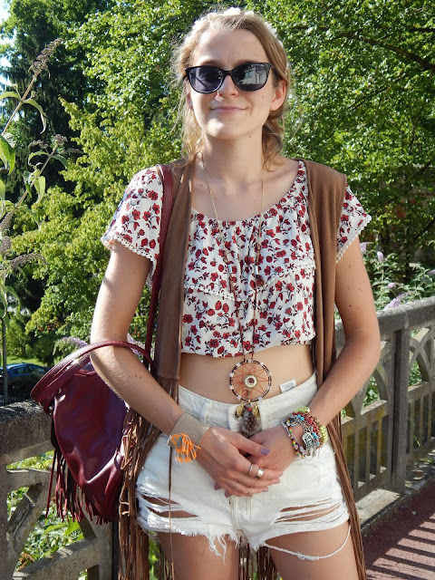 Gilet frangé/Fringed jacket: Hollister; Crop top; Short: H&M x Coachella; Collier/Necklace: Réserve naturelle; Sac à dos/Backpack: Boohoo; Manchette/Bracelet: Hipanema; Bagues/Rings: New Look; Bracelets: H&M; Guadeloupe et Thailande; Santiags: Marque italienne