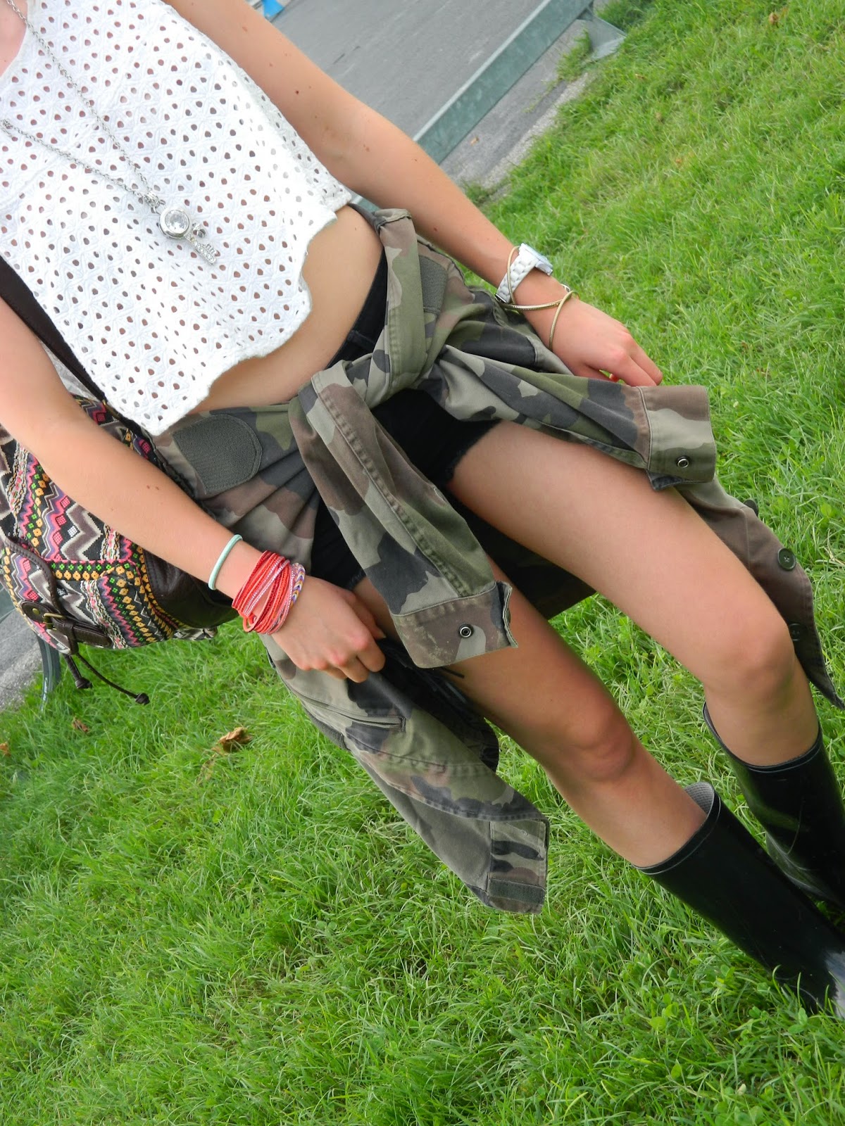 Sinon niveau vestimentaire, on est quand même là pour ça, ce jour-là, nous avons eu la chance d’avoir la meilleure journée au niveau températures, car il a quand même plu 30mn pendant Tom. Donc j’ai enlevé les collants, opté pour mon short frangé, très ambiance festival, toujours fidèle à ma veste militaire, que j’aurai bien rentabilisée et qui m’aura bien servi avec les fraîcheurs du soir. Mon haut crochet, mes bottes de pluie de nouveau et mon sac New Look qui comme ma veste m’aura suivie durant tout Musilac. Deux fidèles alliés. En amont du festival, jai pris un soin particulier à concocter mes tenues parce que je voulais être bien lookee mais aussi à l’aise. J’ai adoré porter ce genre de looks, si je pouvais, je me trimballerai comme ça tout le temps. J’ai même adoré trouver comment rendre mes bottes de pluie sympas.