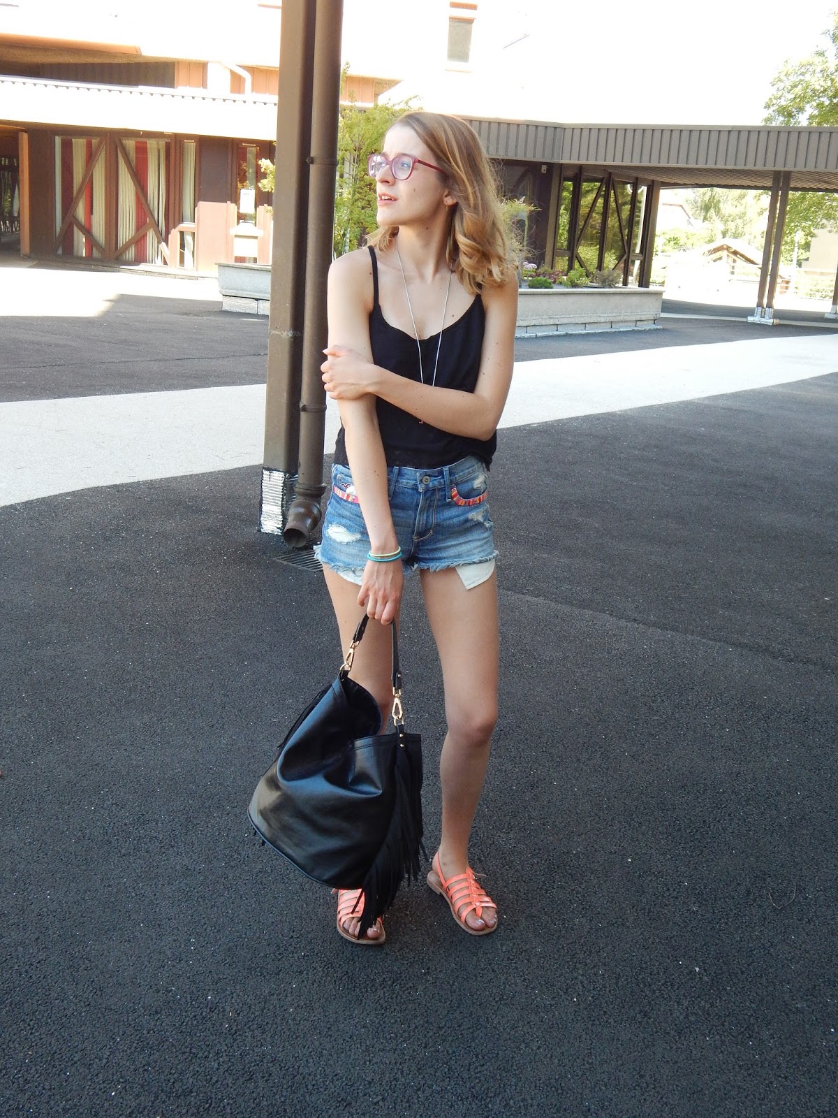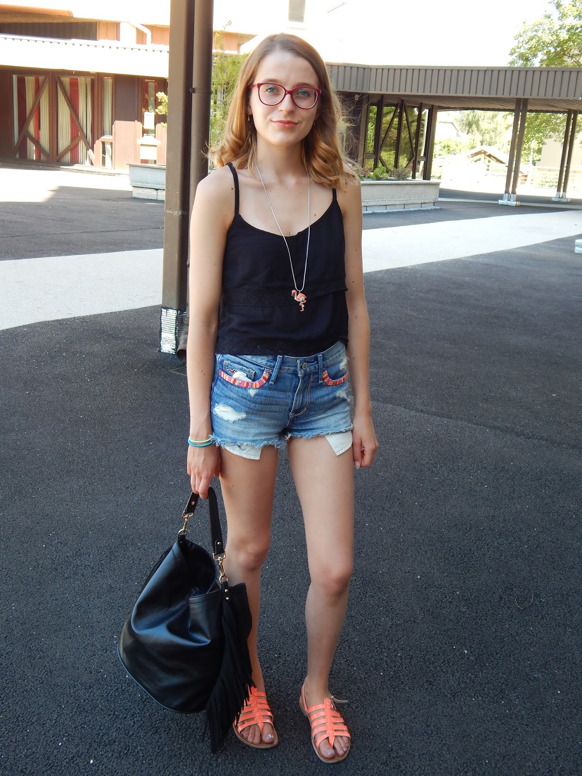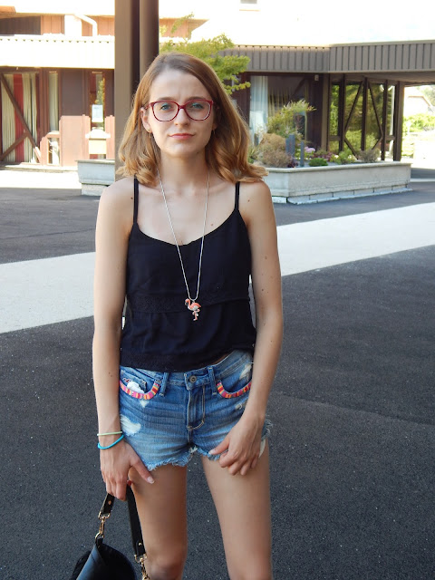 Top: Jennyfer; Collier/Necklace: Bizzbee; Short: Hollister; Sac/Bag: Jennyfer; Sandales: Tropéziennes; Rouge à lèvres/Lipstick: Gemey Maybelline; Crayon pour les yeux/Shadow: Biguine make-up