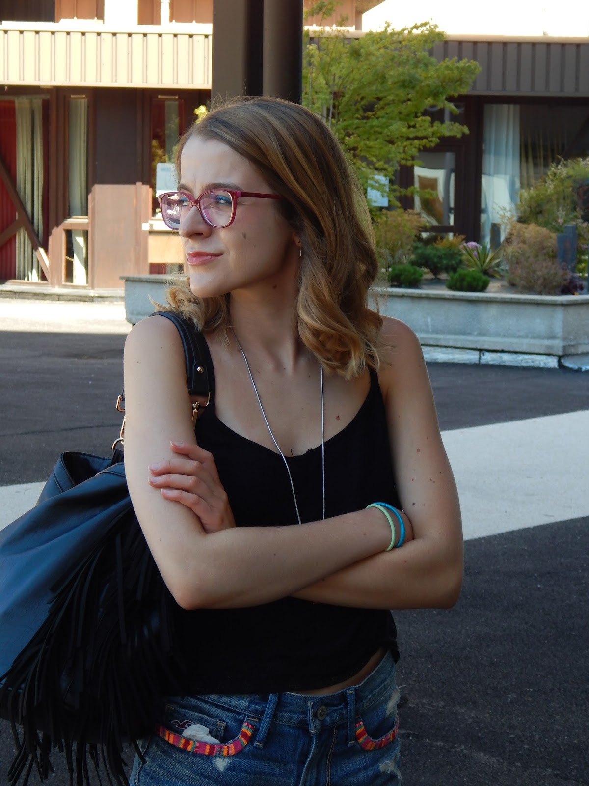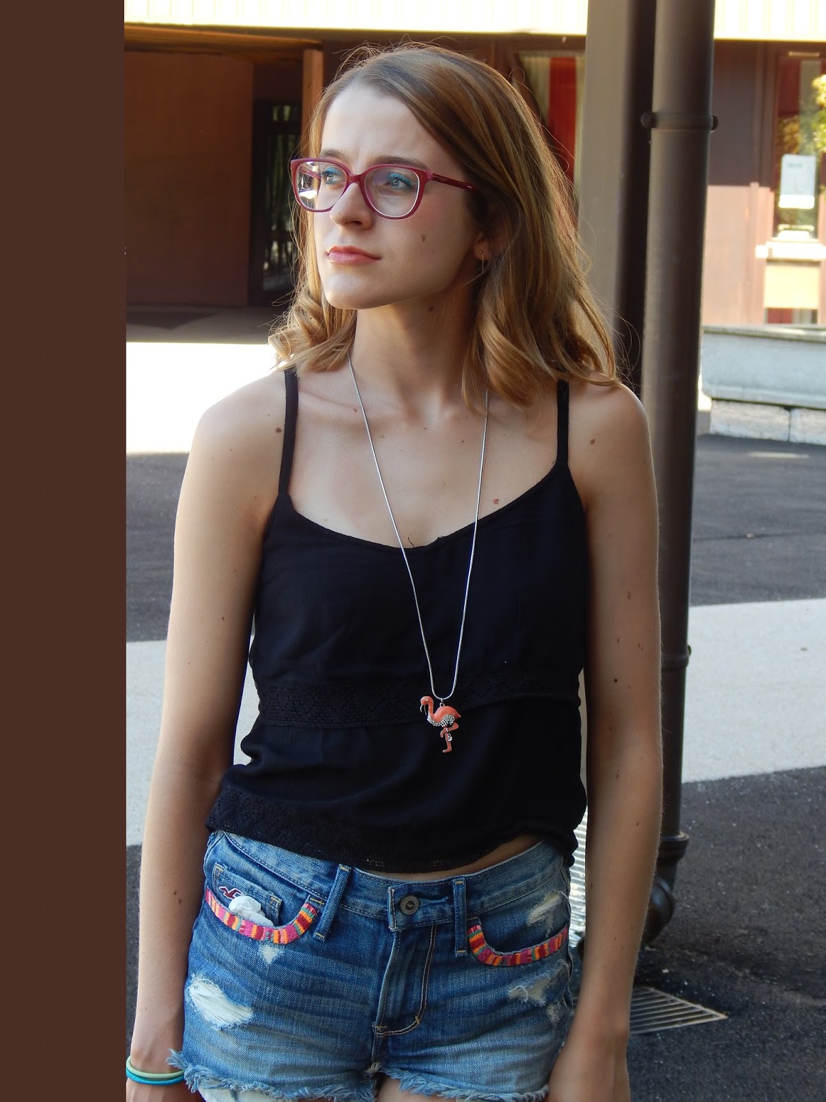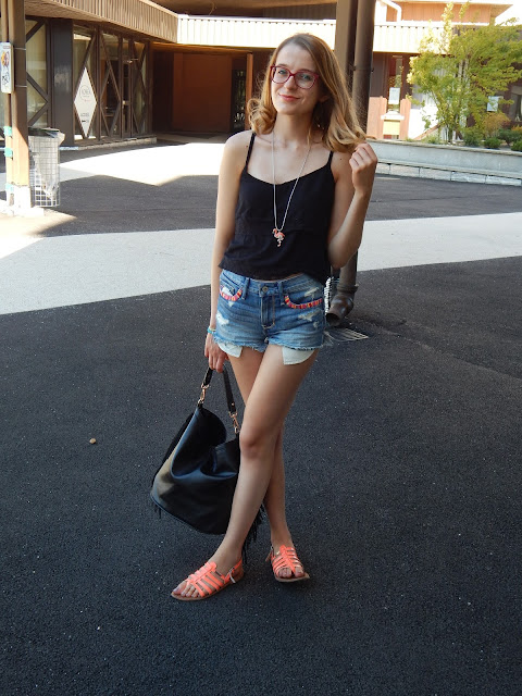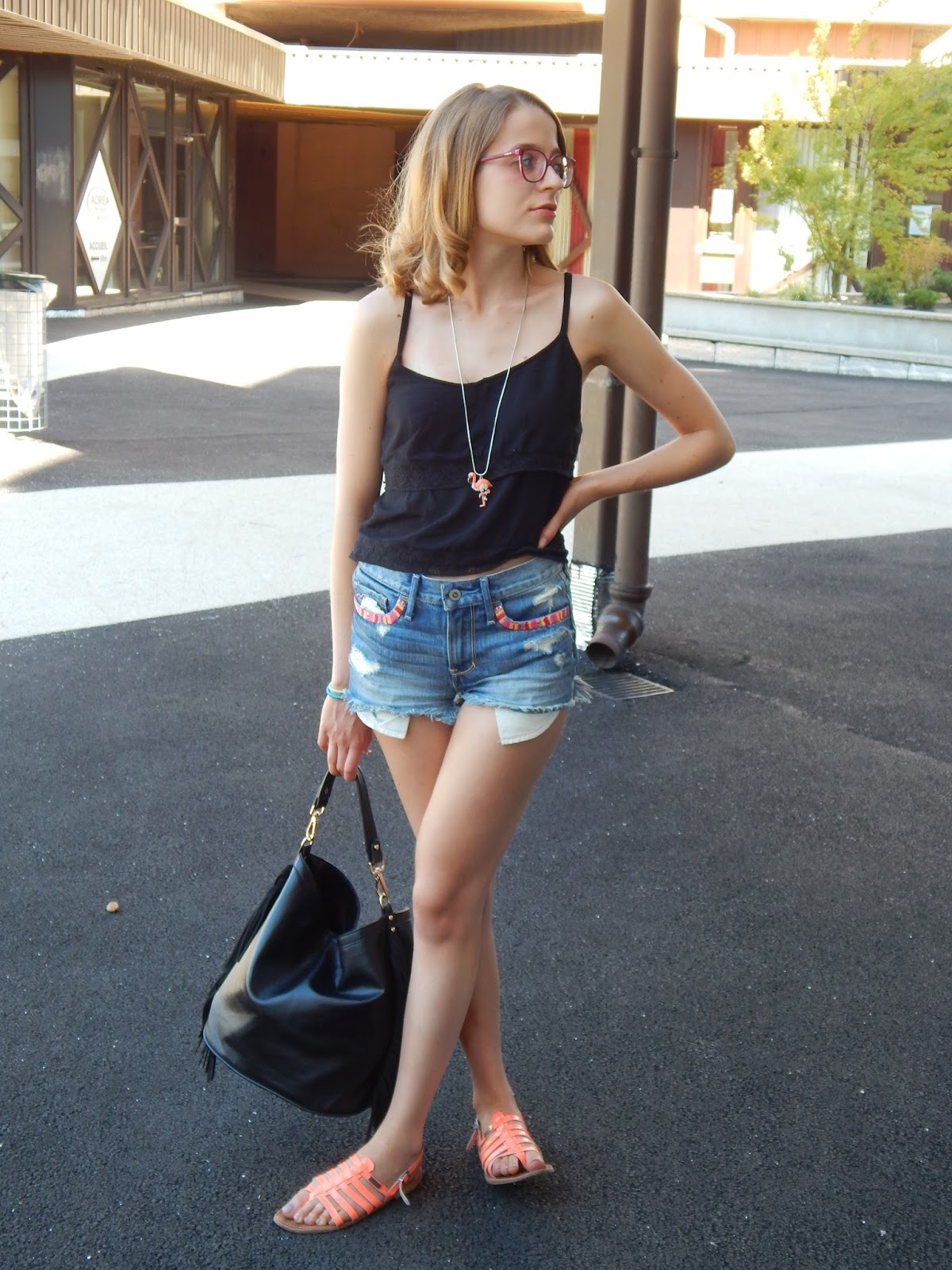 Top: Jennyfer; Collier/Necklace: Bizzbee; Short: Hollister; Sac/Bag: Jennyfer; Sandales: Tropéziennes; Rouge à lèvres/Lipstick: Gemey Maybelline; Crayon pour les yeux/Shadow: Biguine make-up