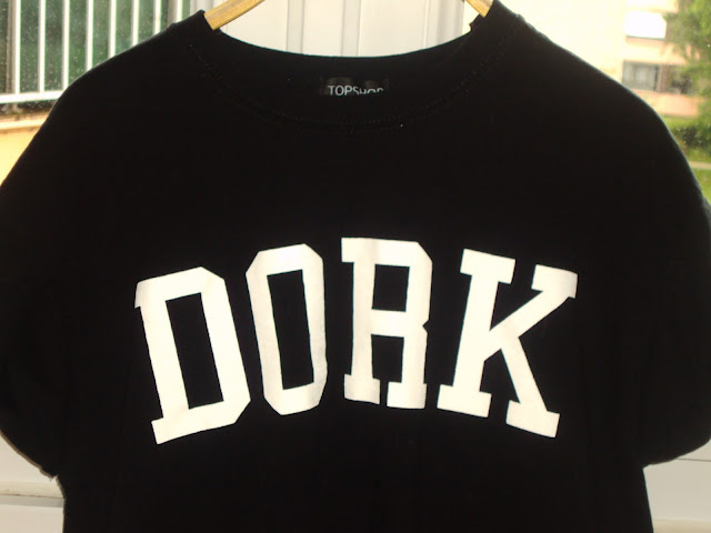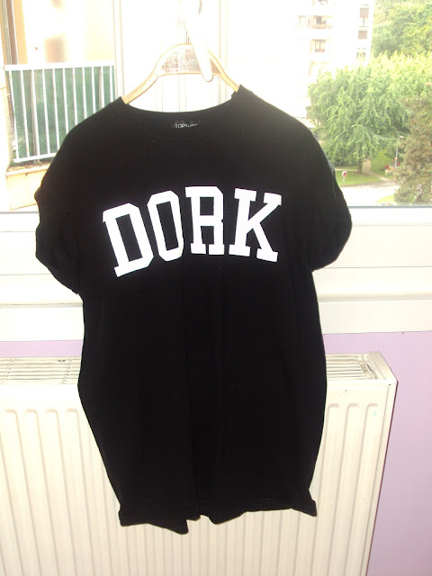 Haut inscription DORK( ndlr idiot). J’ai beaucoup aimé ce haut à inscription humoristique. Je le pensais plus court, mais finalement je préfère ainsi: il est long et assez épais. On pourrait quasiment le porter sans rien en dessous quoique ce serait un peu court. 10€ au lieu de 18.