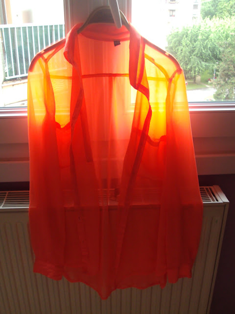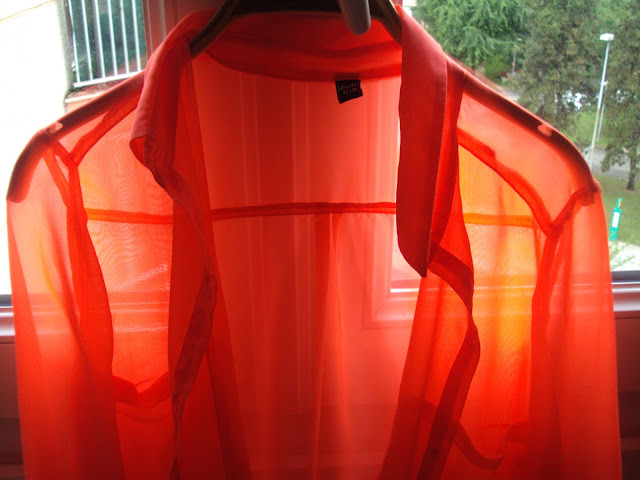 J’ai trouvé cette jolie chemise un peu transparente fluo en regardant un peu partout à la recherche du graal que je nommerai juste après. J’aimais bien cette chemise Topshop que portait Betty, mais vraiment chère: 50€. Du coup cette jolie chemise orangée à 10€ au lieu de 20 était très bien tombée.