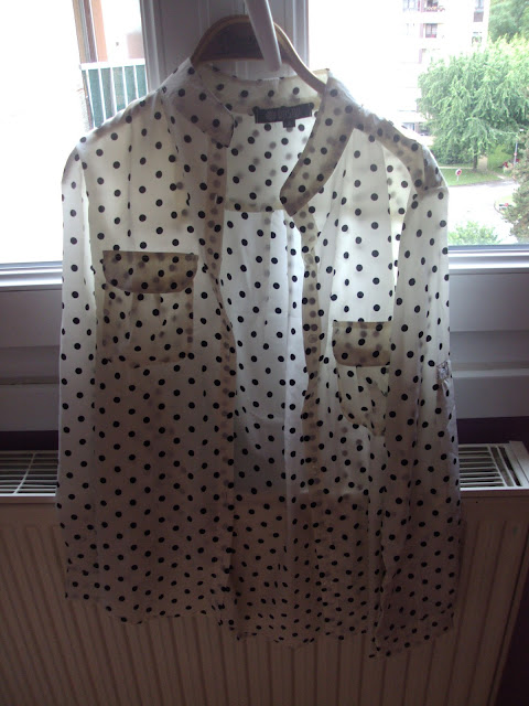 Deux semaines plus tard j’ai recu cette jolie blouse à pois qui m’avait fait de l’oeil également. La même matière que le haut, donc pas très chaude, mais je l’adore. 22,5€ au lieu de 30, vous pouvez la trouver ici