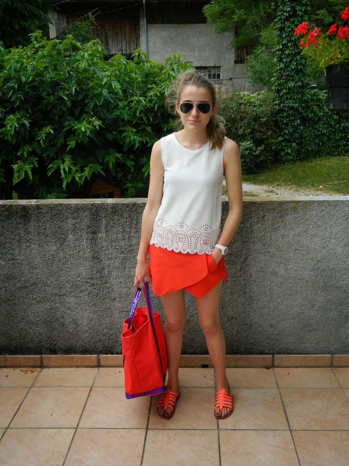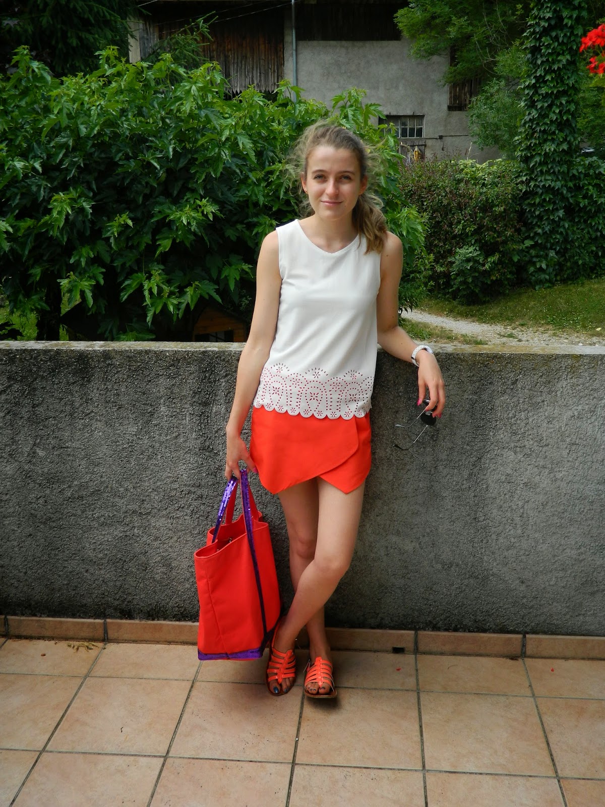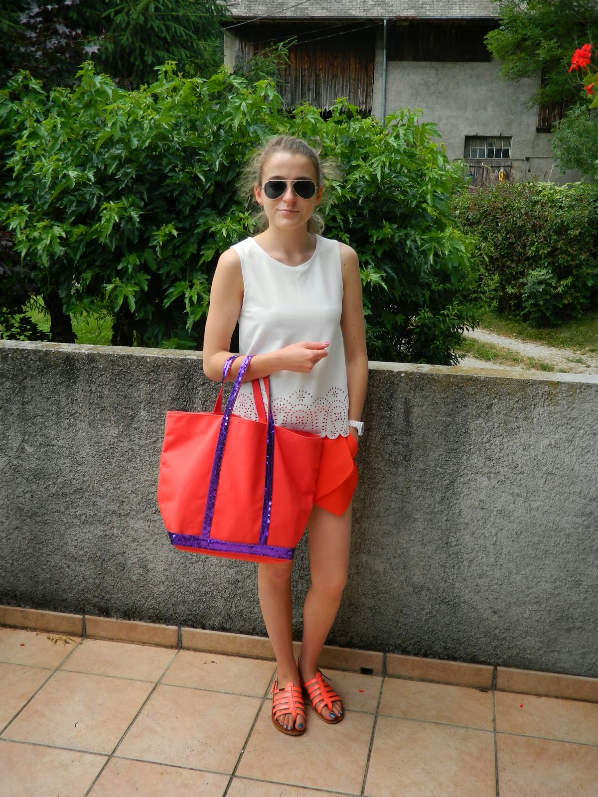 Petite panne internet durant quelques jours. J’ai donc demandé à l’un de mes voisins de me brancher sur sa box, et le seul endroit où j’ai internet est sur le palier. Imaginez-moi l’ordi ou la tablette à la main devant ma porte… Très pratique pour faire un article donc. Je tenais quand même à vous montrer cette tenue prise chez mon beau-père où je prends de plus en plus souvent de photos. La prochaine série sera également chez lui. Une tenue bien orangée pour l’occasion. Une bonne idée pour avoir le moral pour mes derniers jours de stage. Je suis désormais en vacances, et ça fait beaucoup de bien! Mon skort, mes tropéziennes et mon Vanessa Bruno. Moi qui avais beaucoup de mal à accorder ce sac à des tenues, j’ai fait en sorte de le porter 3 jours de suite. J’ai donc du user d’idées pour l’associer.
