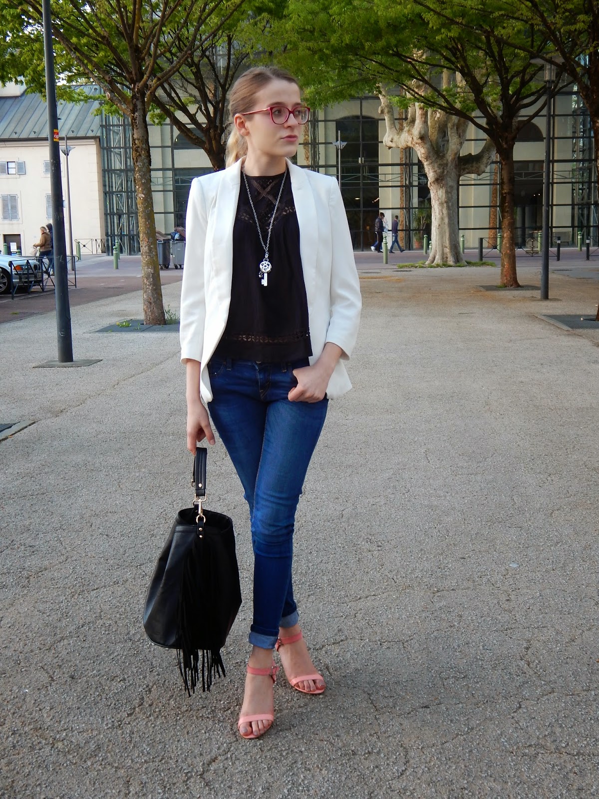 Veste/Jacket: H&M; Haut/Shirt: Mango; Jean: Levi’s; Sac/Bag: Jennyfer; Sandales/Sandals: New Look; Vernis pieds/Feets nail polish: Essie