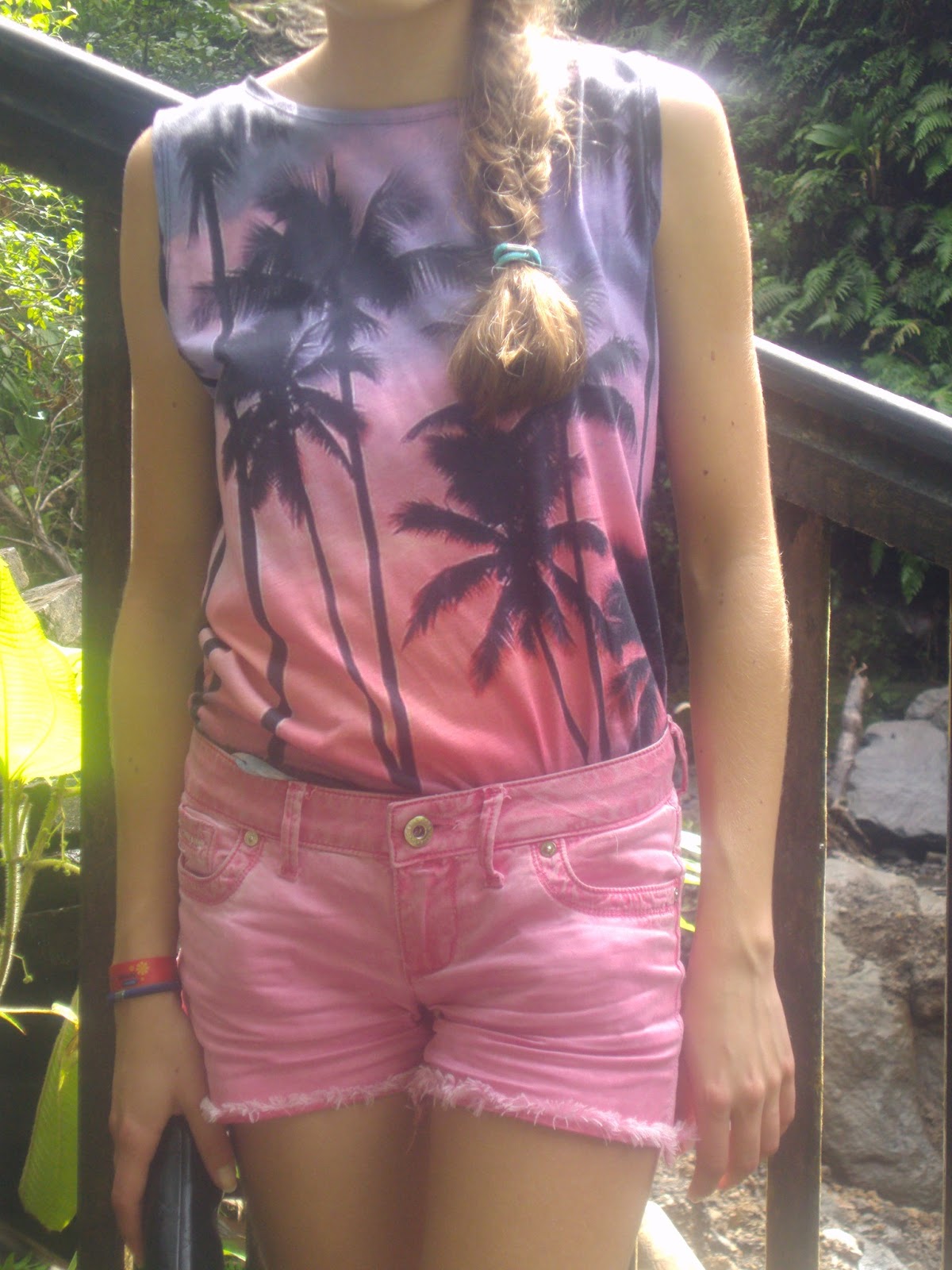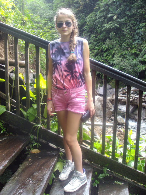 La première a été prise le 31, lorsque nous sommes allés aux Chutes du Carbet. Ce jour-là je portais mon haut imprimé palmiers de chez Asos que j’aime beaucoup mais que certains trouvent spécial. Certes. Associé à mon short enduit rose déjà vu dans l’article précédent, et mes Adidas pour cavaler dans la forêt.