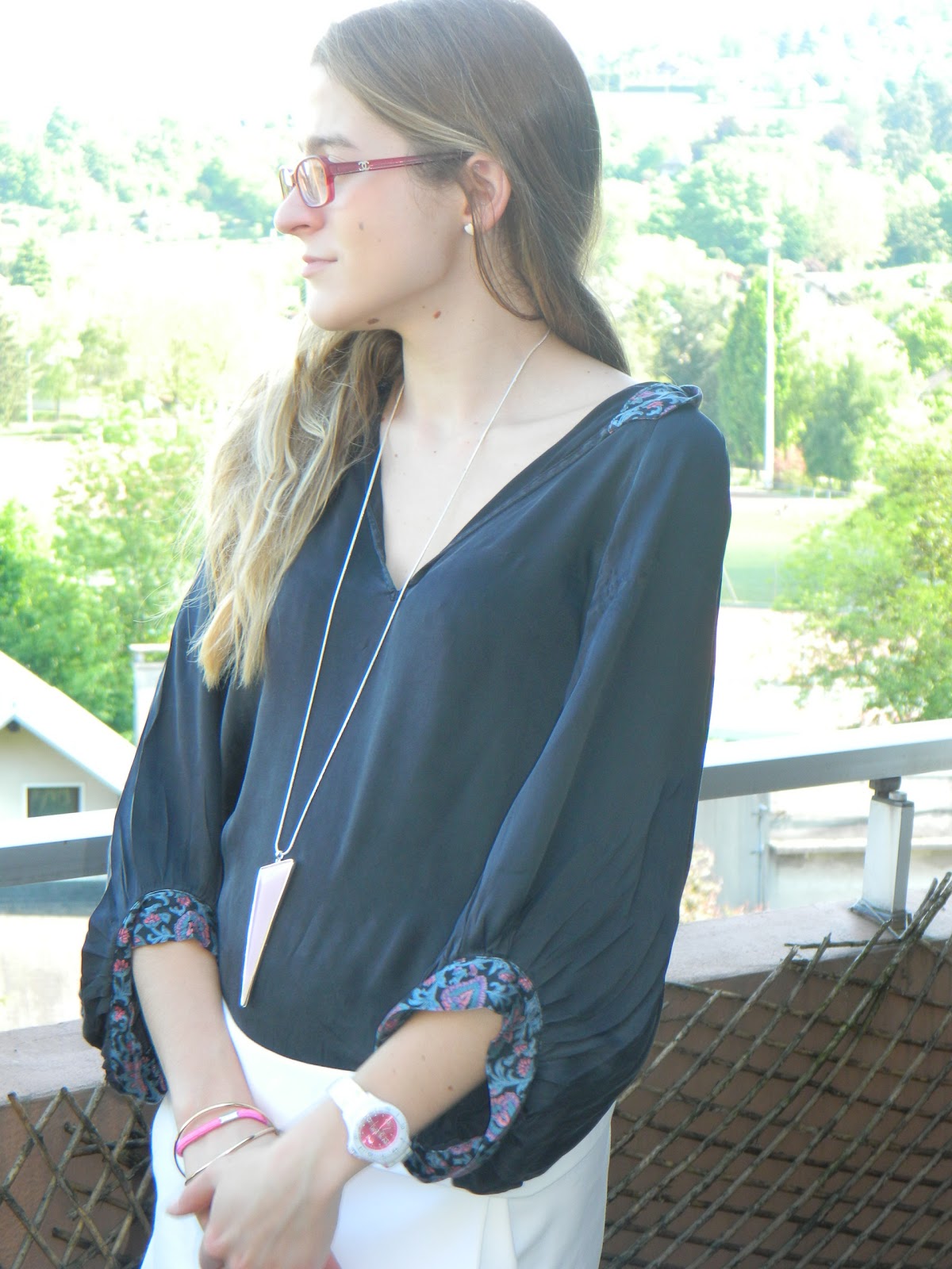 Je vous représente ma jupe vue ici. Portée deux jours de suite tellement que je la like la p’tite, je vous montre aujourd’hui la deuxième version. Elle ressemble beaucoup à la première, une blouse noire et les mêmes compensées mais quelques détails changent. Déjà, le vernis bubble gum sur les orteils: OPI, qui est top. Dans  la première version je n’en n’avais pas et je dois vous dire que je déteste porter des chaussures ouvertes sans vernis, donc là, problème résolu. La blouse appartient à ma mère, et elle date d’au moins cinq ans, à l’époque où la marque des deux amies Barbara Boccara et Sharon Krief était plus accessible. J’adore Ba&sh, mais un peu hors budget pour moi. La jolie marque née d’une amitié entre deux amies présente toujours de très jolies collections. Et cette blouse ne fait pas exception. Elle est super douce et j’adore les détails des poignets et du col. J’ai aussi ajouté mon collier, rose, pour rester dans le ton of course.