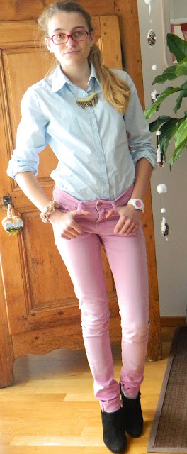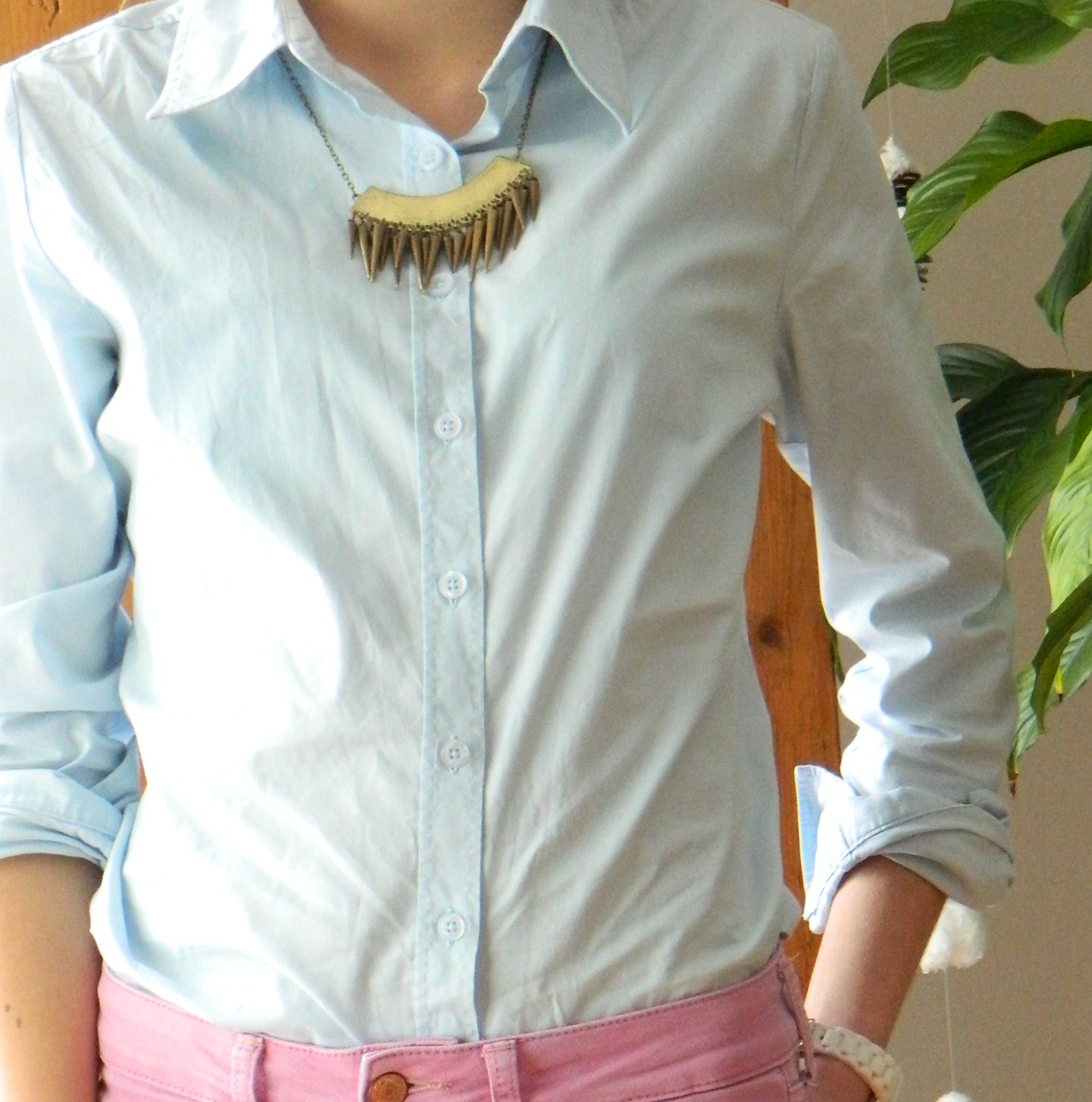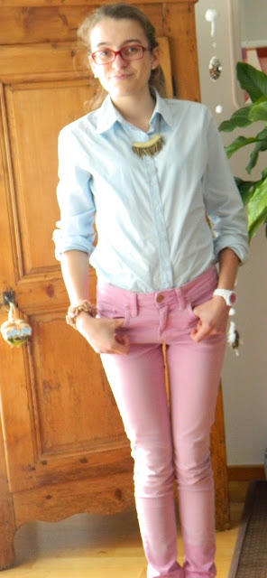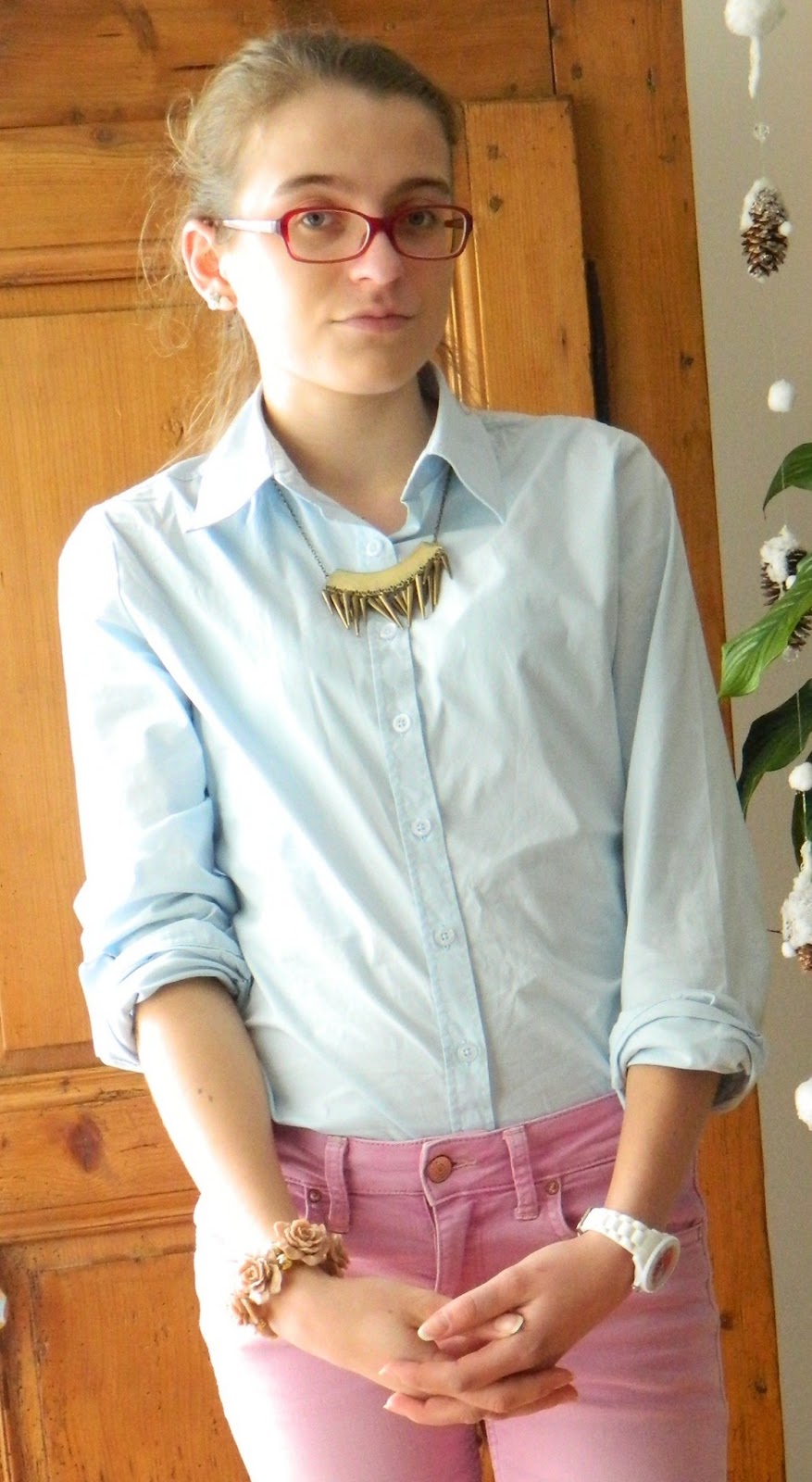 C’est pas mal d’inventer des mots. J’aime bien. Quand j’ai associé cette chemise bleue clair que ma mère m’a donnée avec mon jean rose, j’ai pensé au pastel. Logique.