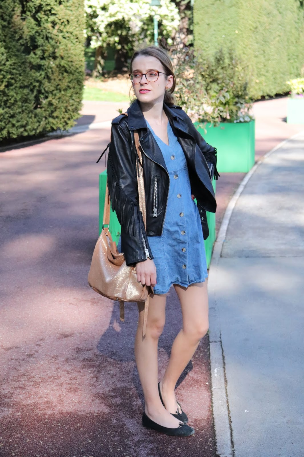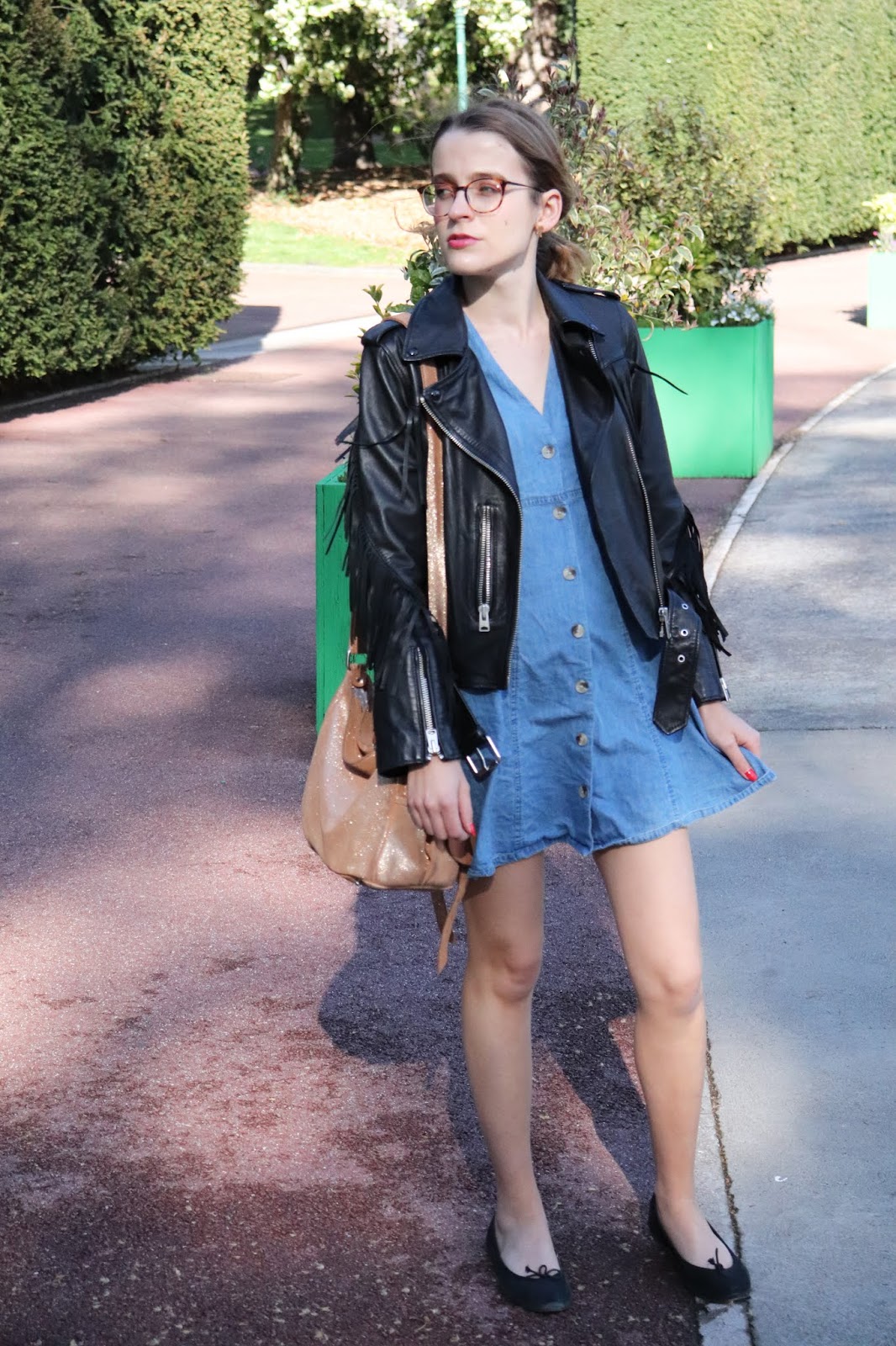 Je porte une robe de chez Asos achetée mi-mars. J’ai adoré sa forme féminine très sympa, la matière denim qui se porte avec tout et que j’adore. Je l’ai portée au Japon, vous le verrez dans mon article sur mon séjour à Tokyo. Quant à cette veste en cuir… Toute une histoire que je vous raconte dans ma vidéo Haul japonais.