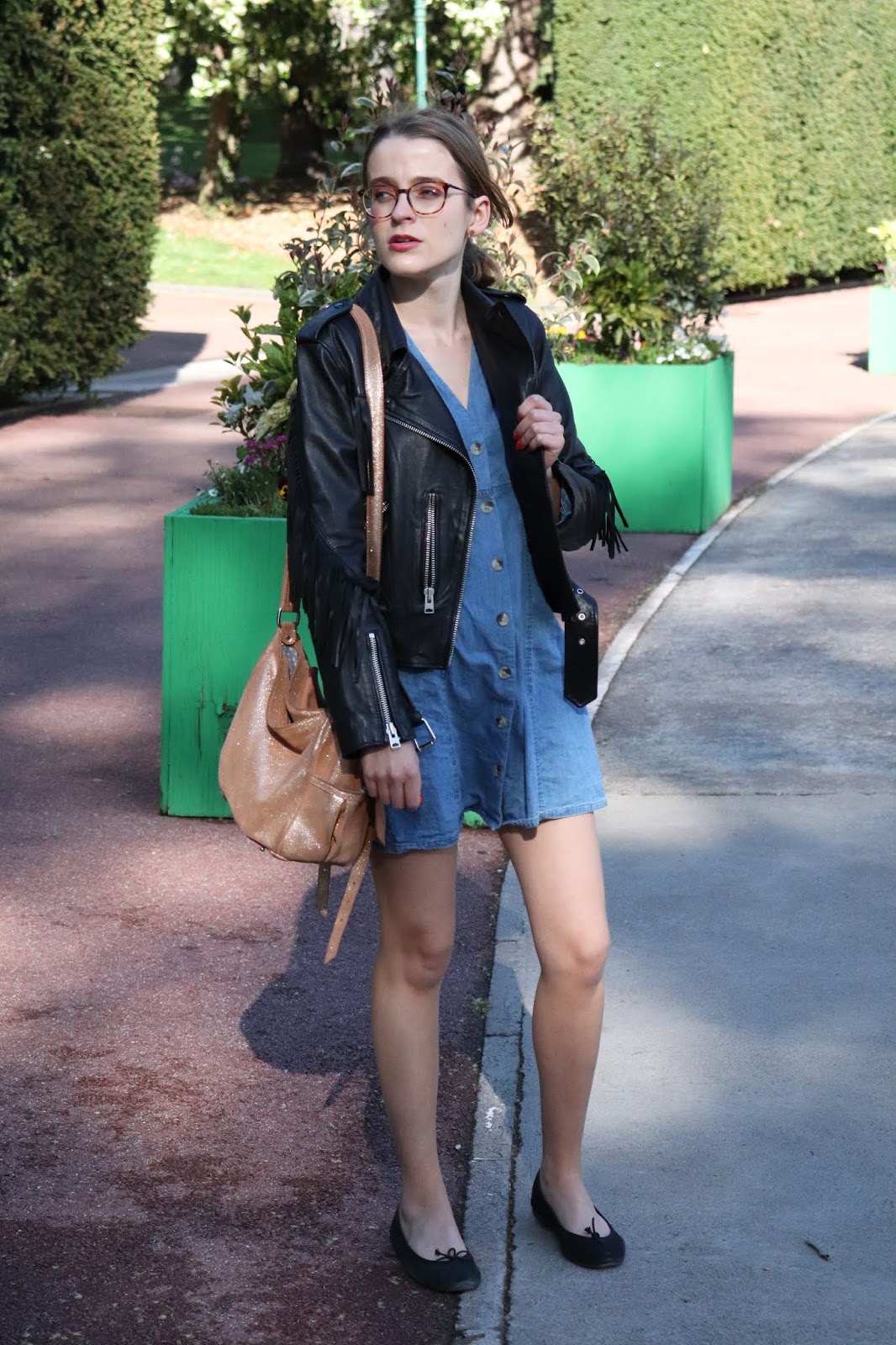 Perfecto/Leather jacket: All Saints; Robe/Dress: Asos; Sac/Purse: Mila Louise; Ballerines/Shoes: Repetto