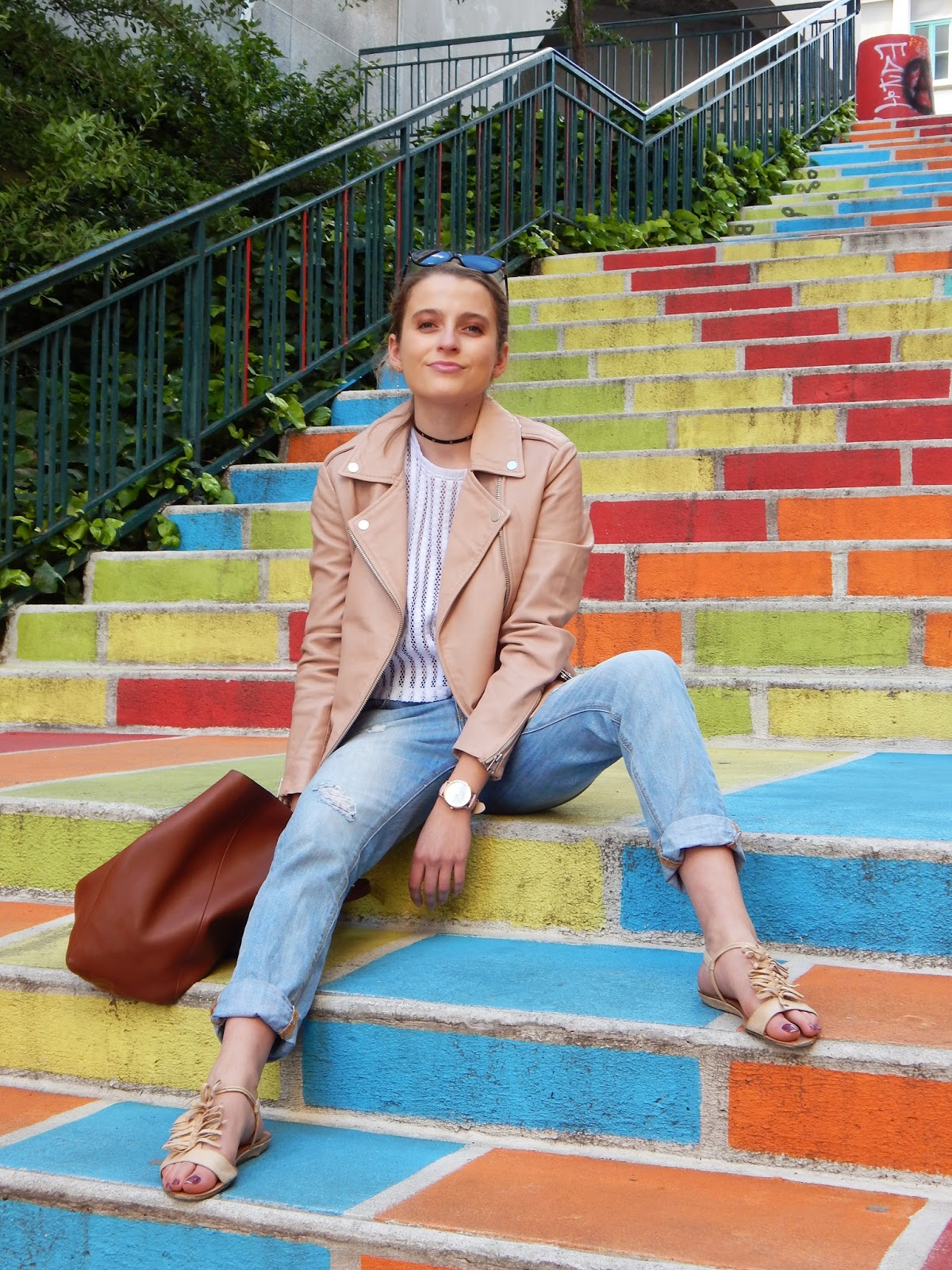 Nous avions fait ce shooting il y a plusieurs mois rue Prunelle à Lyon. Je ne l’avais jamais publié tout simplement parce que un peu avant j’avais déjà fait des photos avec cette veste. Je ne voulais donc pas publier un autre article tout de suite après avec la même. Problème de blogueuse je vous jure… Il fallait donc que je les publie rapidement, puisque des sandales fin octobre c’était déjà un peu juste. Je portais donc mon perfecto Mango que j’avais eu pour mon anniversaire que j’associe avec tout, vous l’avez vu récemment avec ma robe en dentelle noire, avec ma combinaison noire, et ma chemise noire et ce jean. De façon générale je l’ai donc beaucoup portée avec du noir. Dans ce look, j’ai opté pour du blanc et des accessoires marrons. Vous aimez?