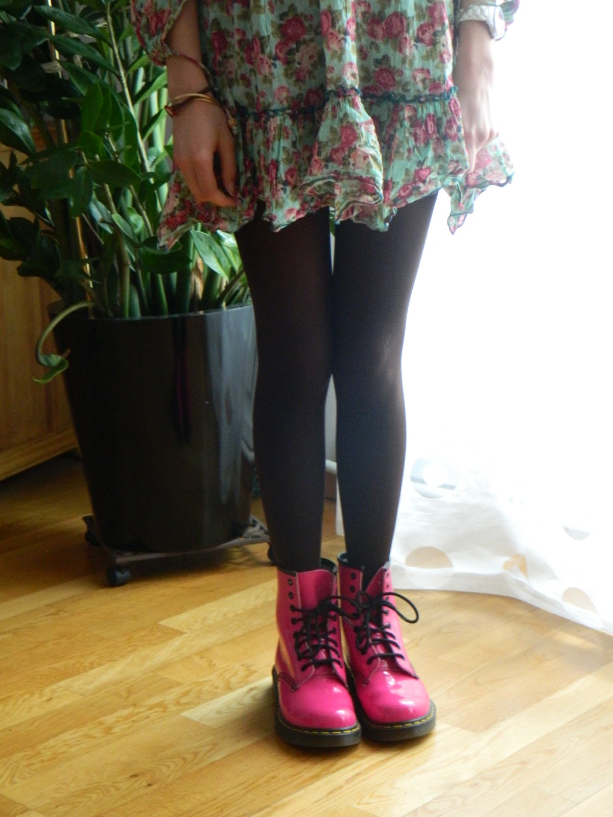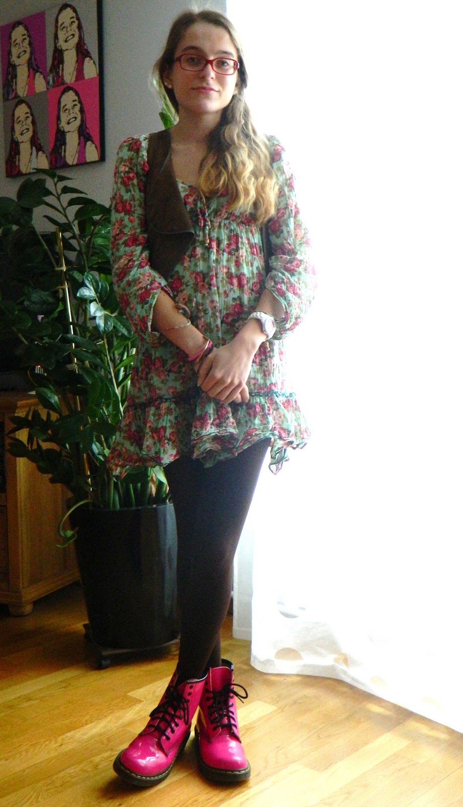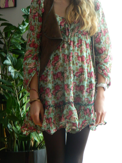 Robe/Dress: L’été de Jeanne( achetée dans le Sud); Gilet daim/ Deer vest: One Step; Collants/Tights: Le Bourget: Boots: Doc Martens; Boucles d’oreilles/Earrings: Tally Weijl( offertes par une amie)