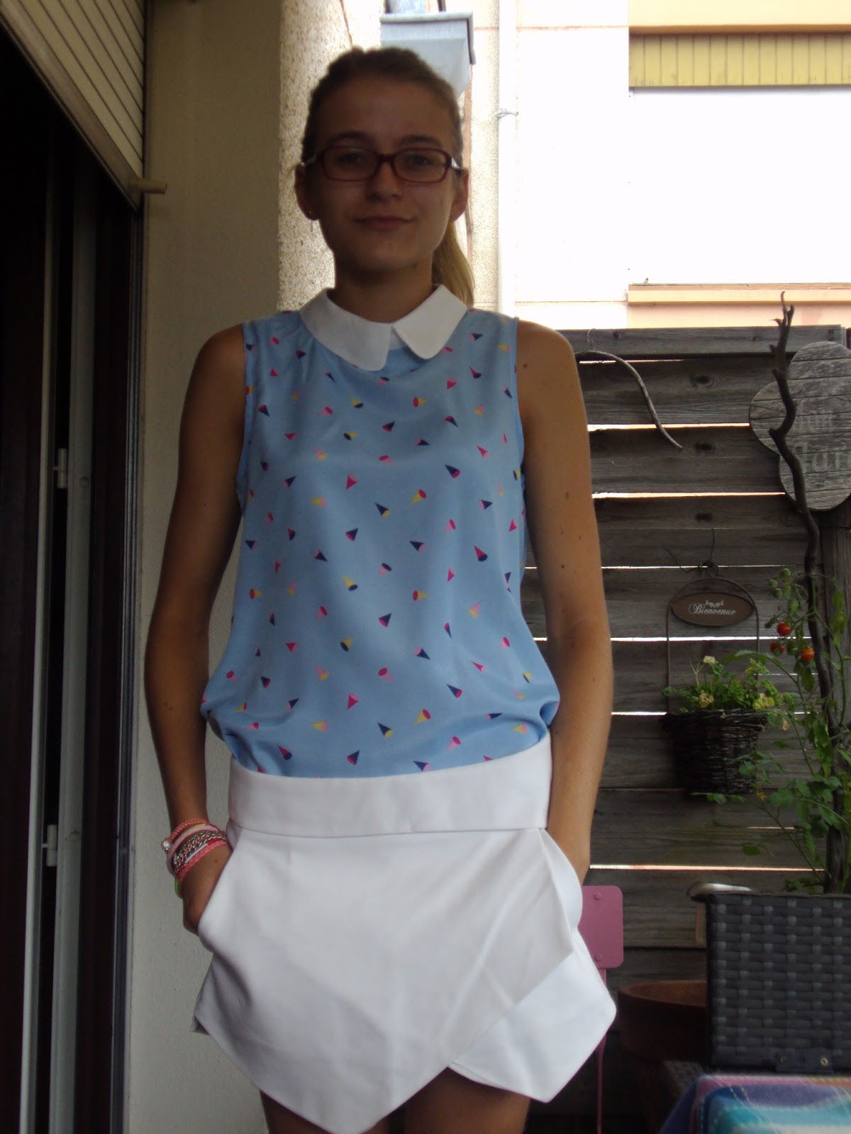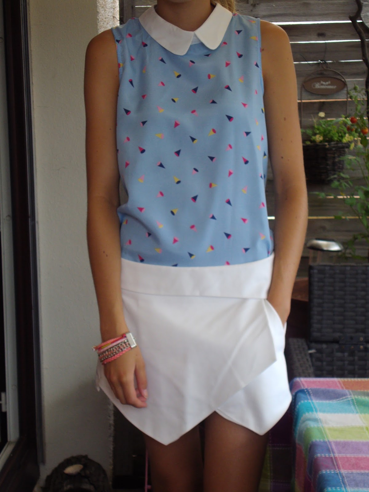 Haut/Shirt: Oasap; Bracelet et bague: achetées sur le marché; Skort: Zara; Compensées/Shoes: Boutique chambérienne