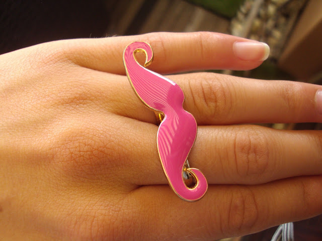 I showed you this top in my New Stuff sales and here it comes in action. Looked and ordered on, Oasap, I’m very glad of it. I tried an association with my skort, and I’m not very convinced, I let you judge. My mustach ring and my bracelet in the shades of pink and here we are!