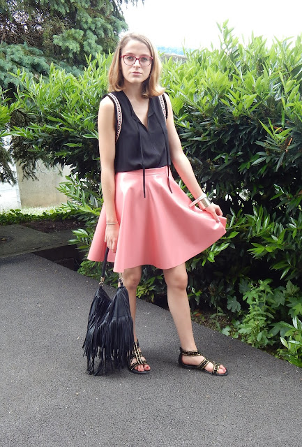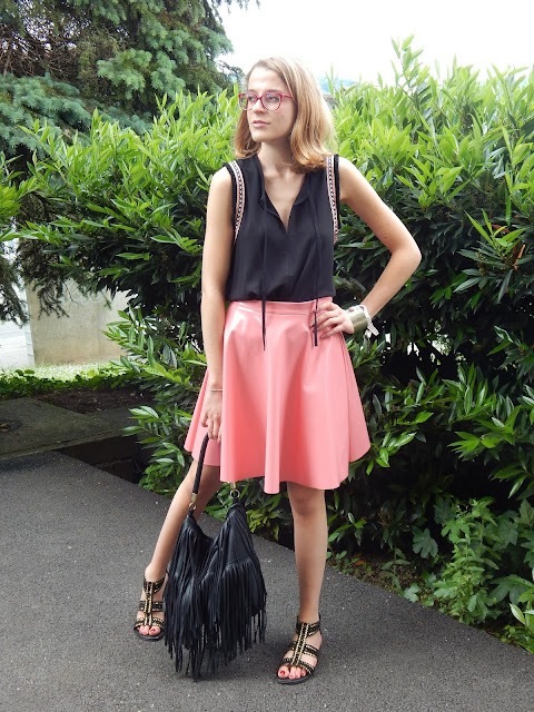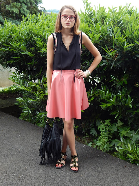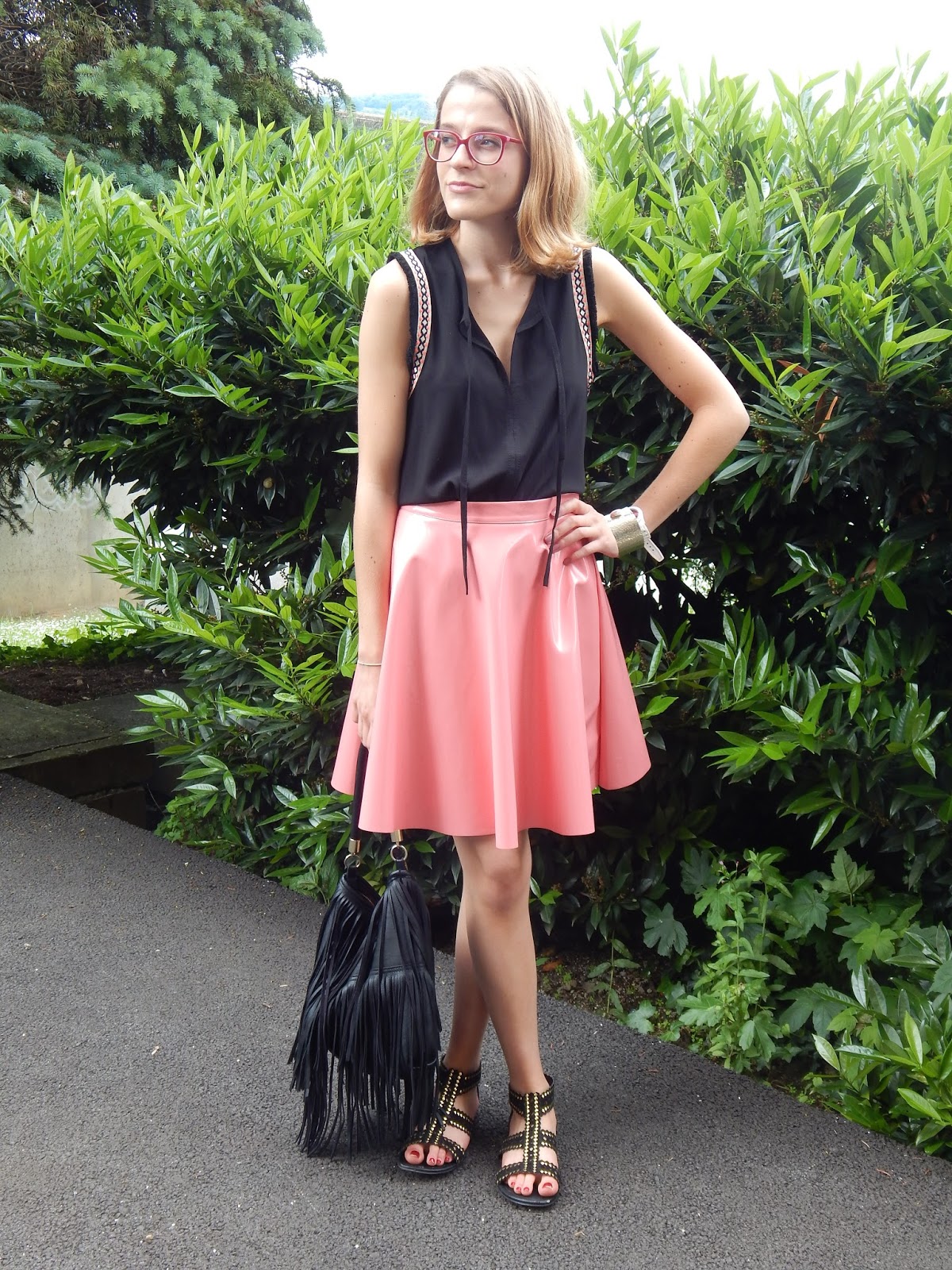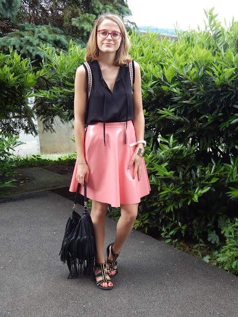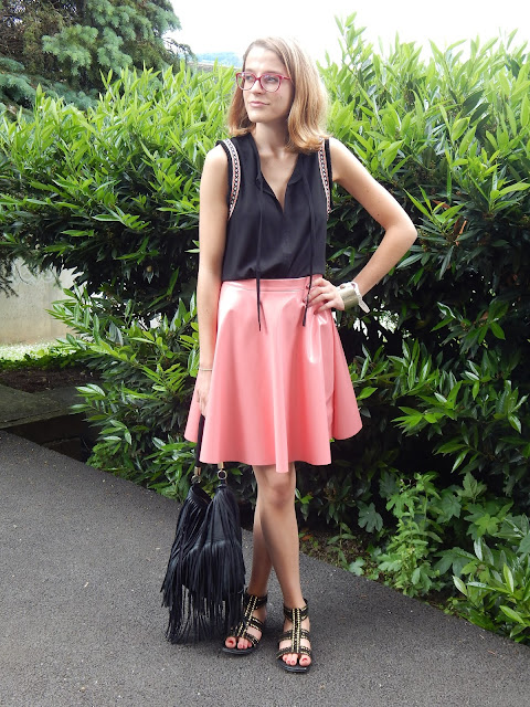 Un look que j’avais fait un jour où je travaillais à la boutique, le haut venant de cette boutique d’ailleurs. Je l’avais étiqueté et j’étais tombée sous le charme. J’avais voulu ressortir cette jupe, assez spéciale je vous l’accorde, que j’avais achetée sur Topshop il y a trois ans je crois, qui ne fait pas l’unanimité. Personnellement je l’adore et c’est tout ce qui importe. Être bien les fringues que l’on porte. Si l’on vous juge ou l’on vous regarde bizarrement parce que vous portez une jupe rose en vinyle grand bien fasse à ces conformistes. Puisque oui j’ai eu droit à pas mal de regards appuyés et à des paroles pas très discrètes sur ma jupe. J’avais eu le même genre sur mes Doc fushia. Faut se calmer les gars y a pas écrit fuck sur mon front non plus.