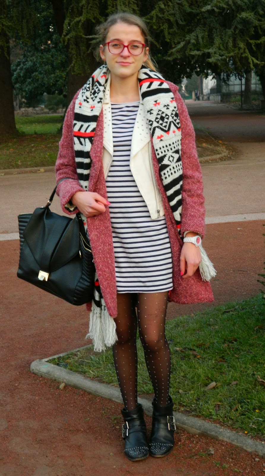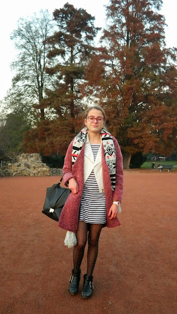 Un petit shooting au parc de la tête d’or, parc que j’adore, avec Lucie afin d’immortaliser mon nouveau manteau. Je vous l’avais montré dans ma première édition de la pièce de la semaine. Ce beau manteau La Redoute vu sur plusieurs blogs. Sa coupe, sa couleur, sa matière, et son prix, plus de 50% de réduction, il était top. Avec, ma robe marinière, mes collants plumetis, mon perf trompe l’oeil (remember il est en coton), et heureusement que j’avais cette écharpe bien chaude.