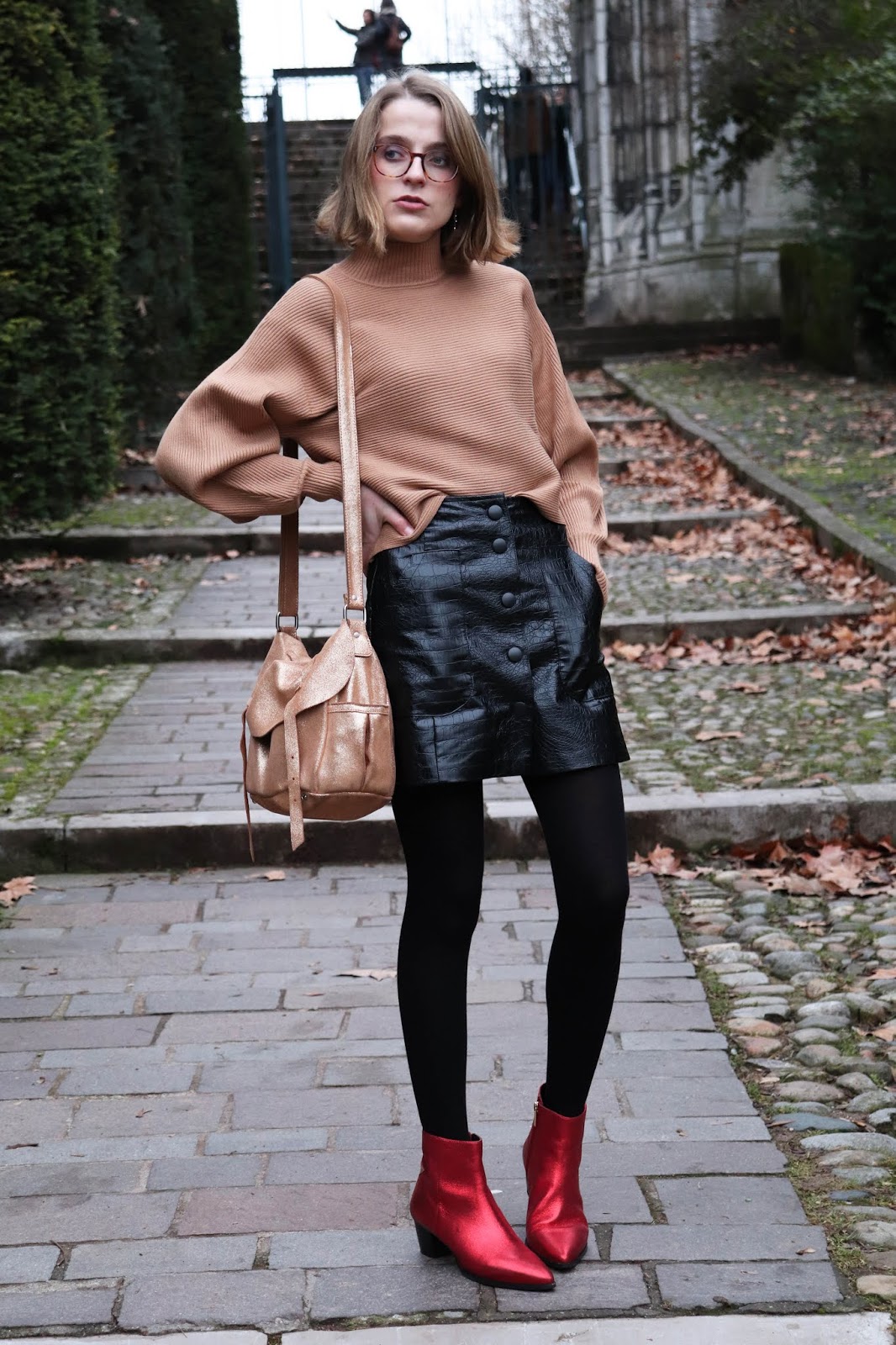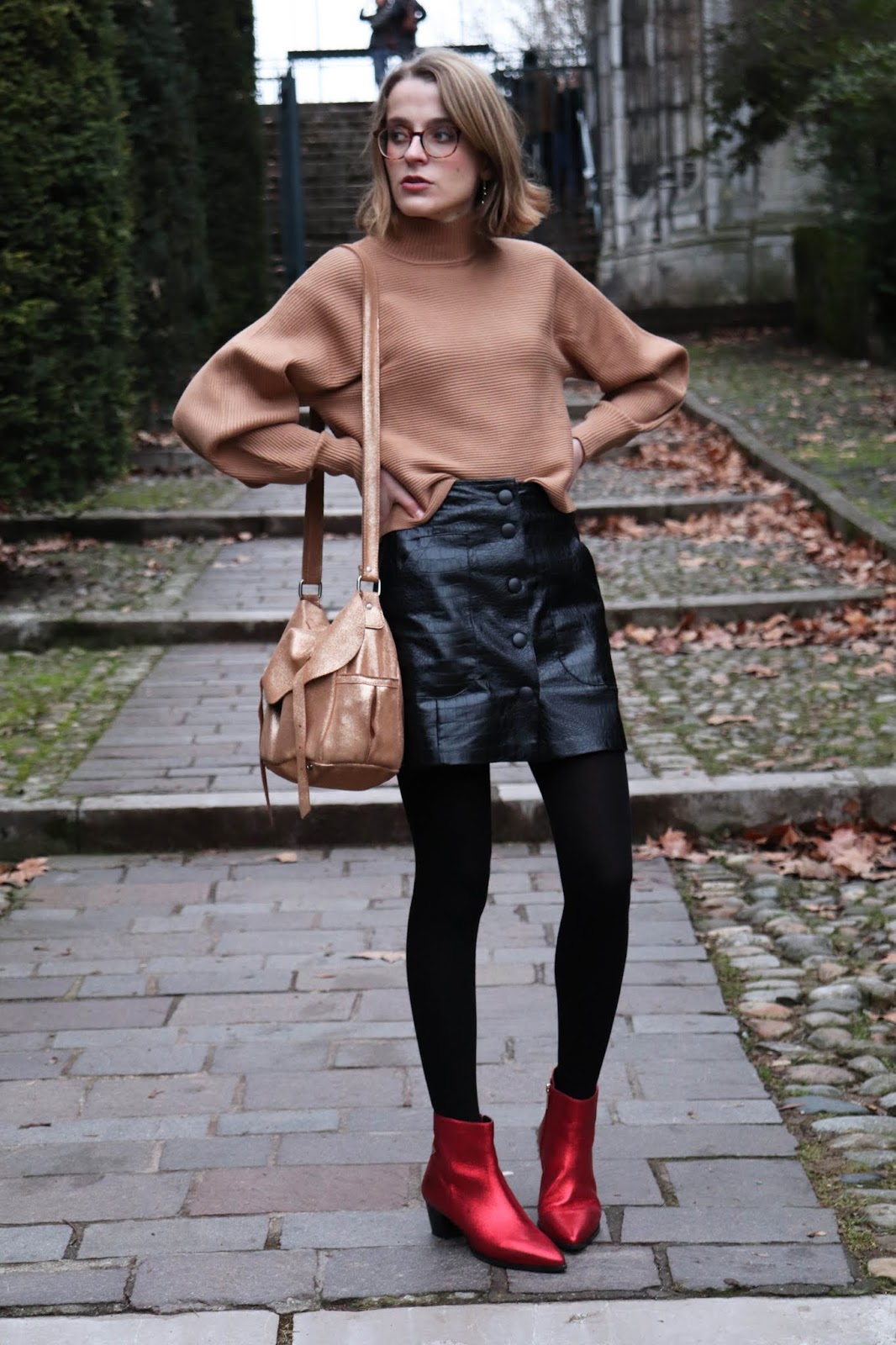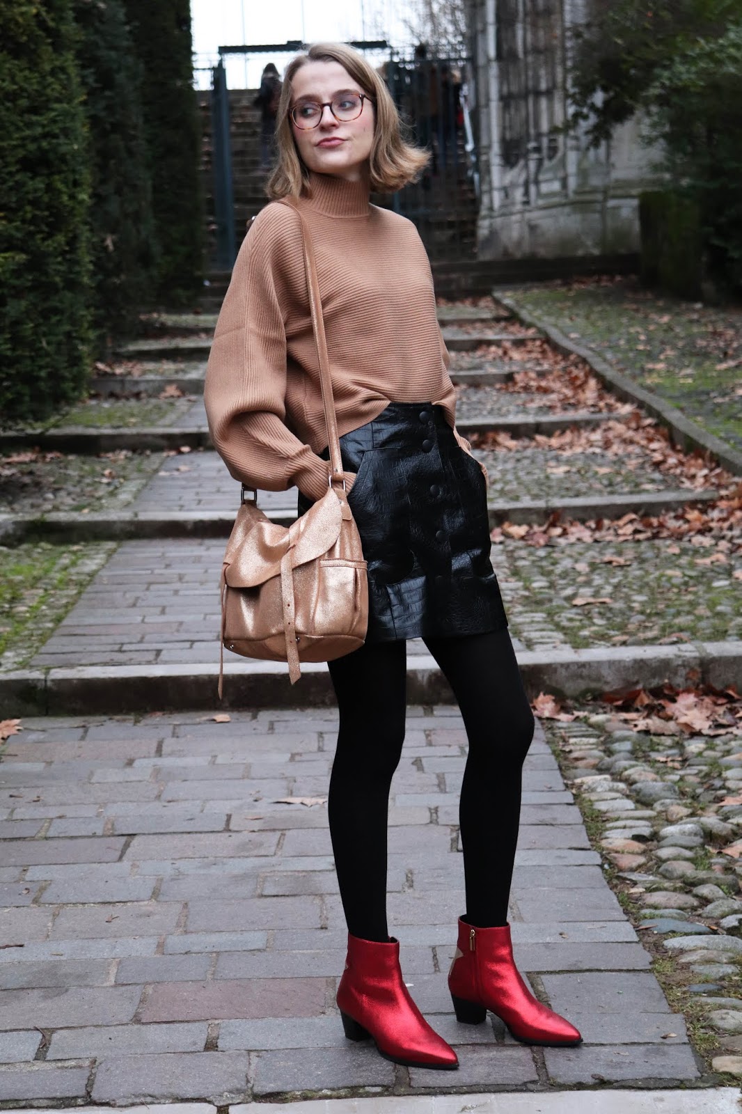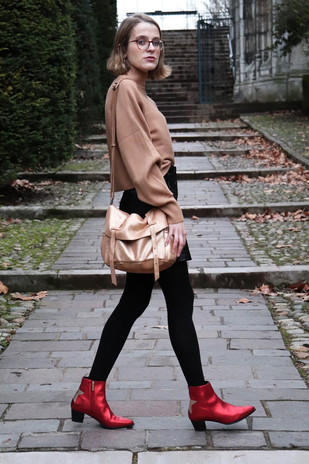 Cette petite jupe va vraiment avec tout, et je l’imaginais beaucoup avec ce pull type col roulé et un peu oversize. J’aime beaucoup le rendu. Aux pieds, je porte ma nouvelle paire de bottines métallisées Bocage que j’aime beaucoup trop!