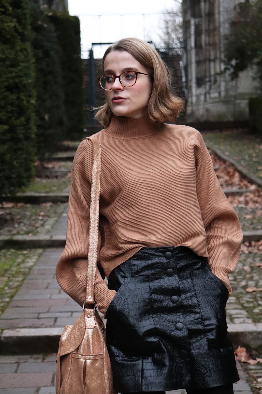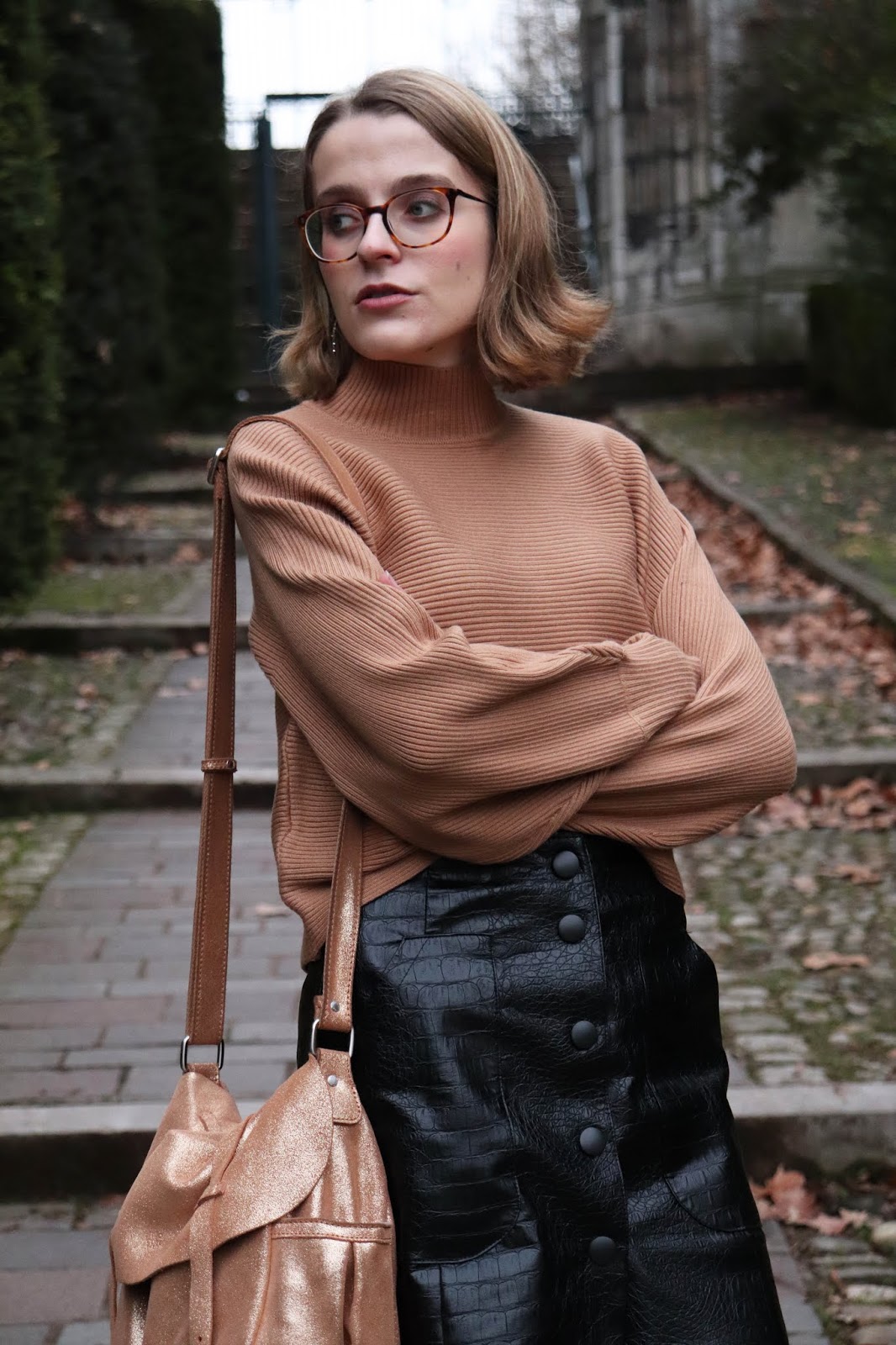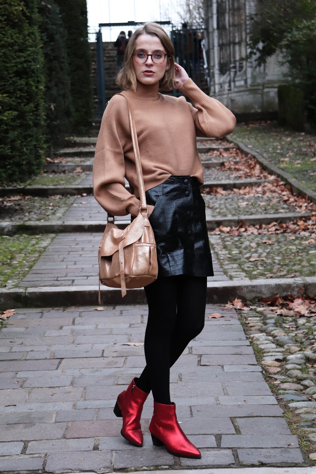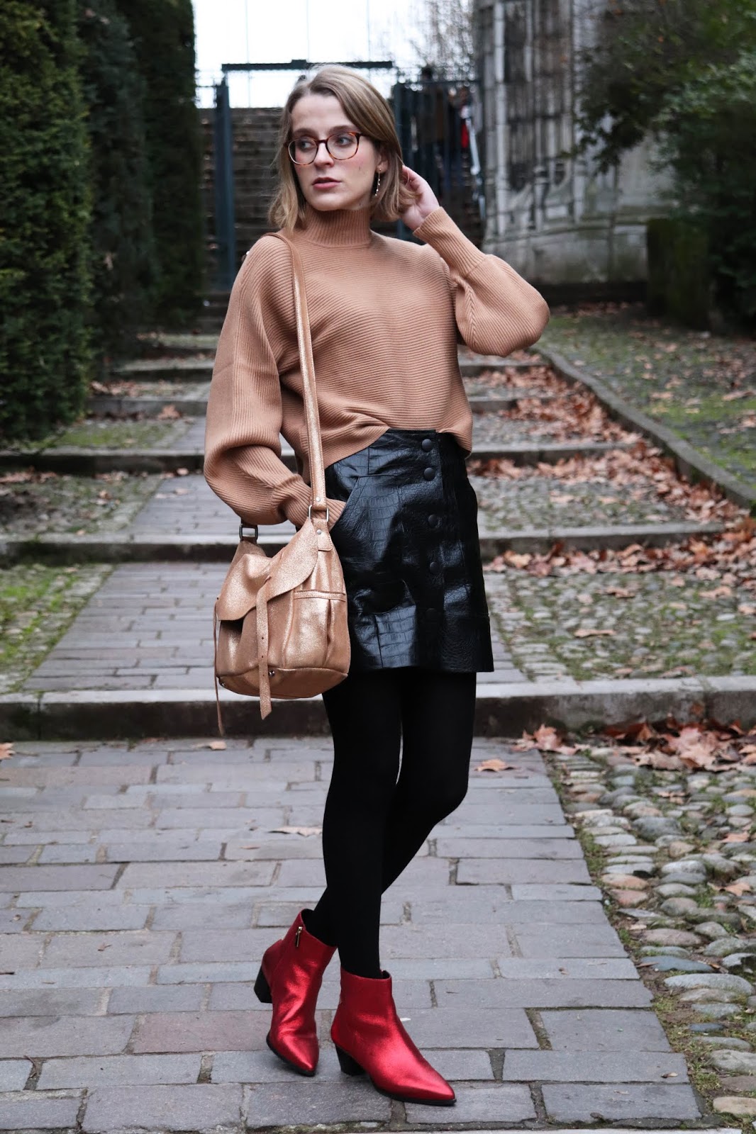 Cette petite jupe va vraiment avec tout, et je l’imaginais beaucoup avec ce pull type col roulé et un peu oversize. J’aime beaucoup le rendu. Aux pieds, je porte ma nouvelle paire de bottines métallisées Bocage que j’aime beaucoup trop!