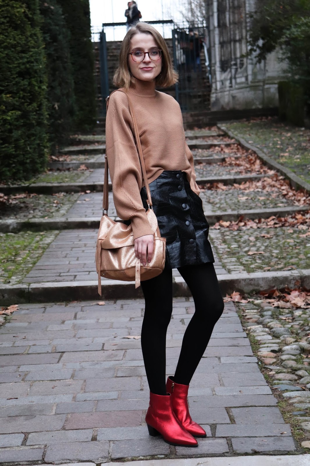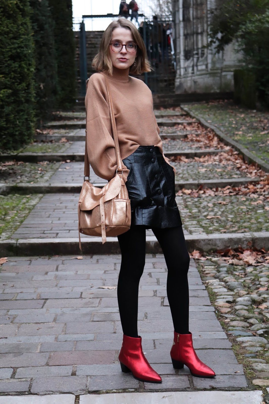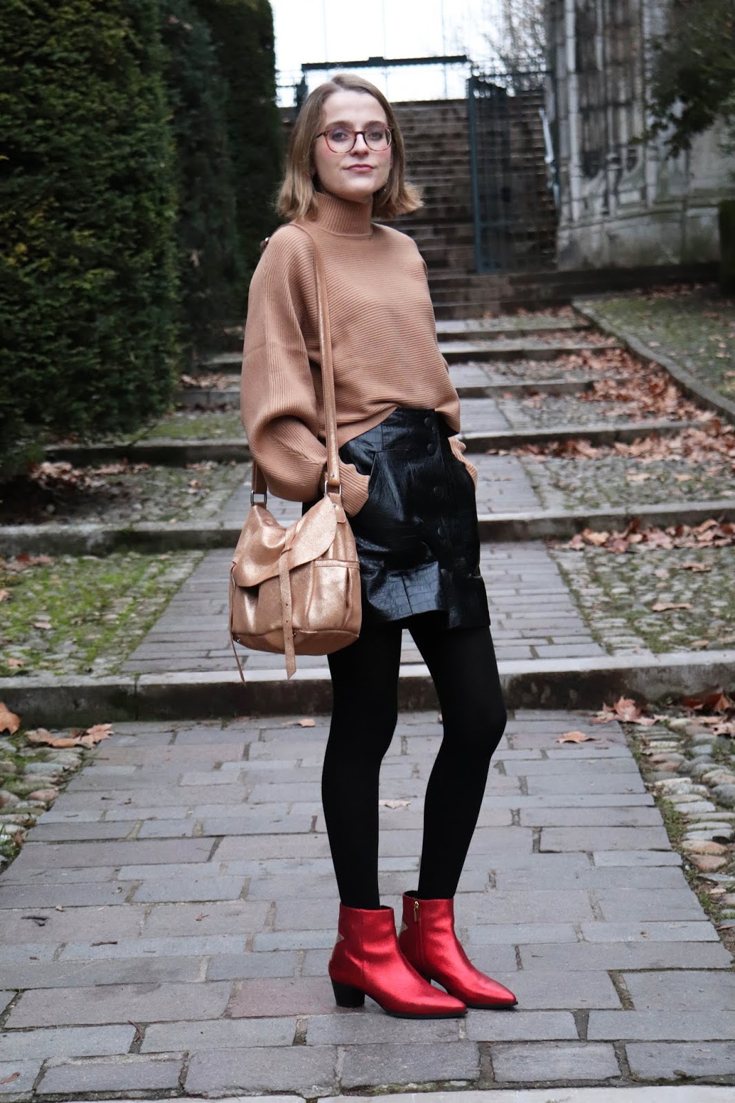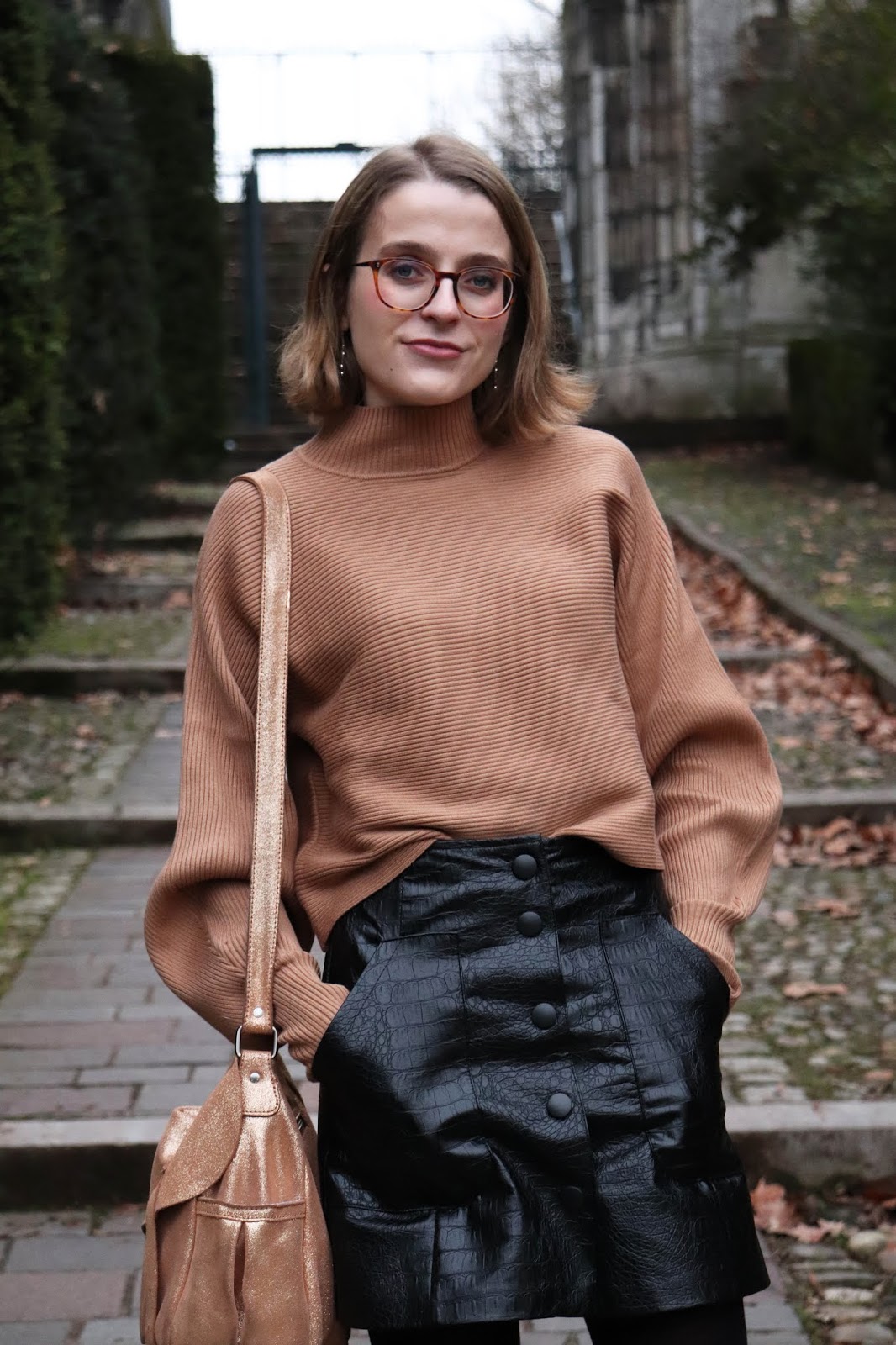 Cette petite jupe va vraiment avec tout, et je l’imaginais beaucoup avec ce pull type col roulé et un peu oversize. J’aime beaucoup le rendu. Aux pieds, je porte ma nouvelle paire de bottines métallisées Bocage que j’aime beaucoup trop!