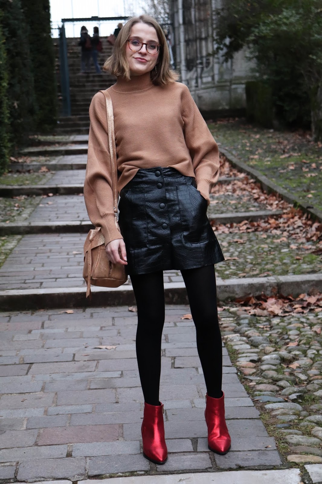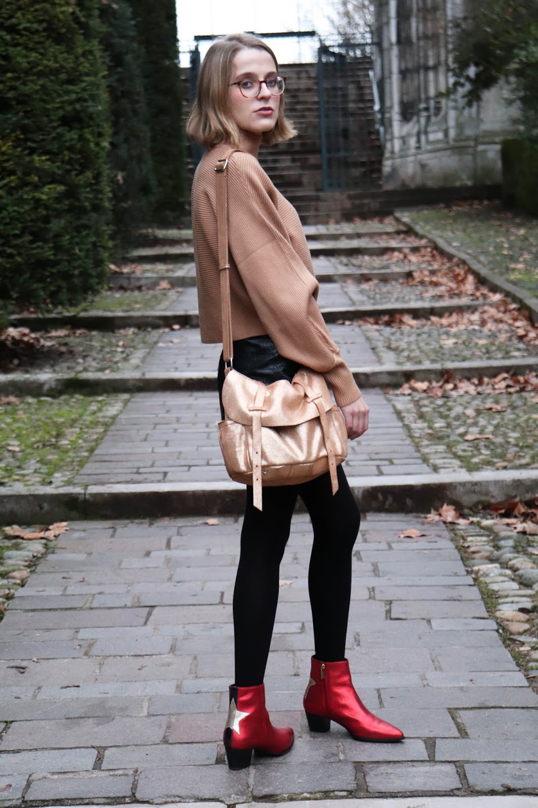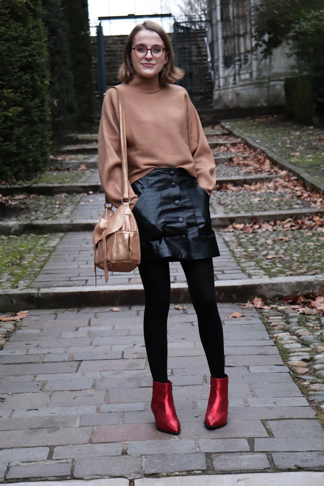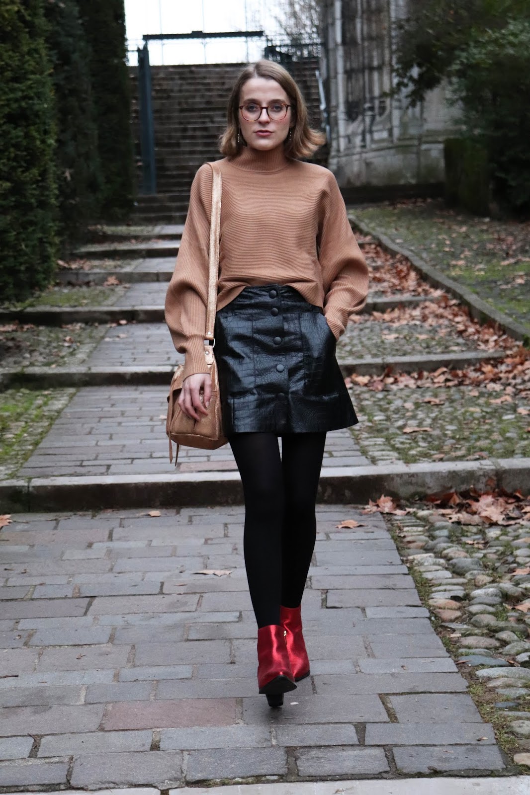 Cette petite jupe va vraiment avec tout, et je l’imaginais beaucoup avec ce pull type col roulé et un peu oversize. J’aime beaucoup le rendu. Aux pieds, je porte ma nouvelle paire de bottines métallisées Bocage que j’aime beaucoup trop!