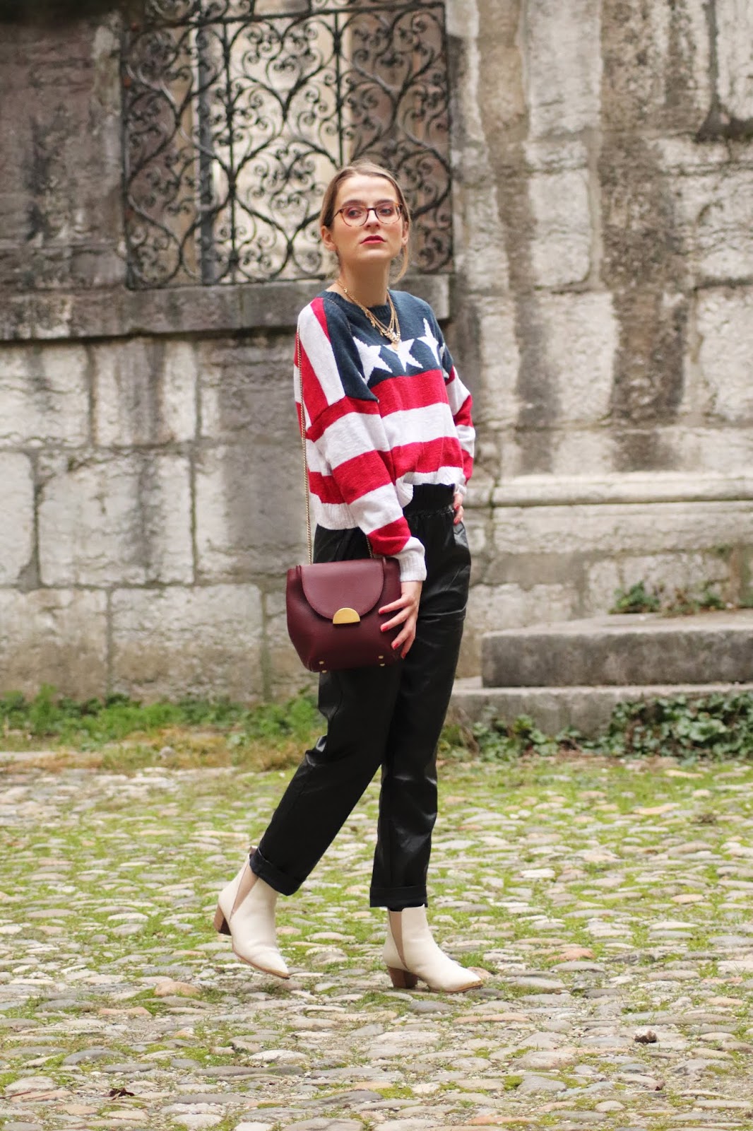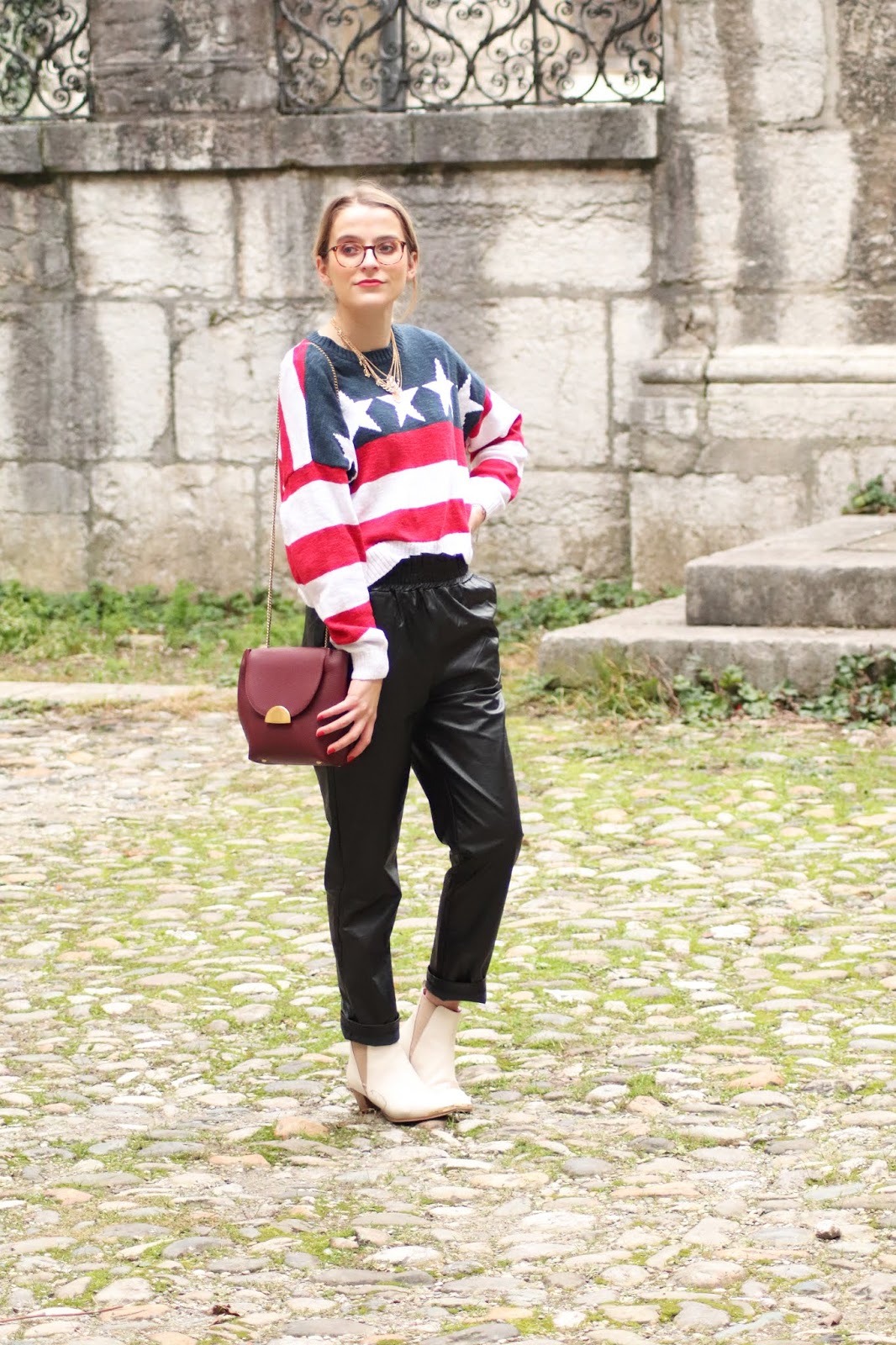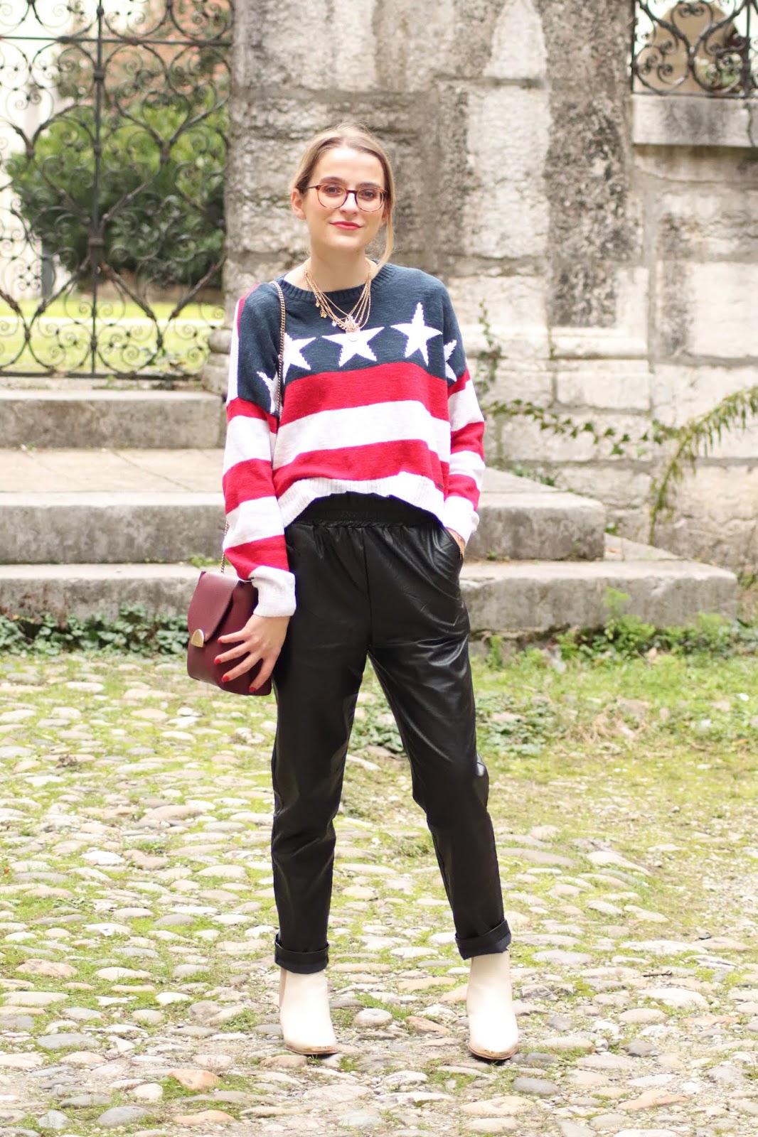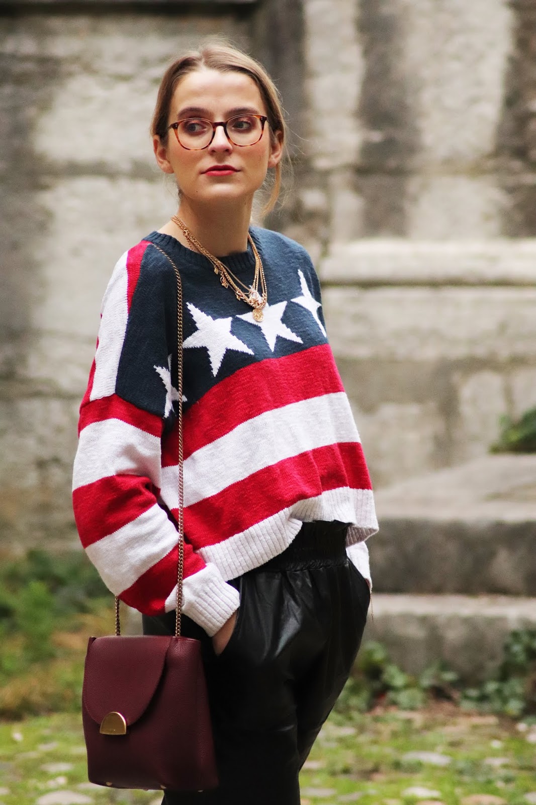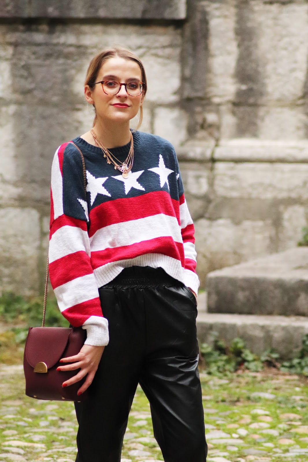 J’avais très envie de vous montrer certains nouvelles pièces de mon dressing, partagées dans mon dernier Haul. Si je vous dis que depuis j’ai fait quelques craquages chez Stradivarius vous me croyez? Thérapie post-rupture et parce que j’en avais envie tout simplement. Je vous montrerai donc tout ça plus tard. En attendant, j’avais acheté il y a plusieurs mois ce pull à l’imprimé drapeau américain chez Hollister dont je suis beaucouppp trop fan. Je le porte avec mon pantalon en similicuir du e-shop français Not your girl, chez qui j’ai une jolie robe genre vichy et ce top en satin.