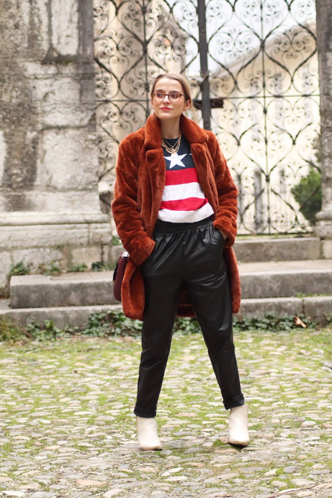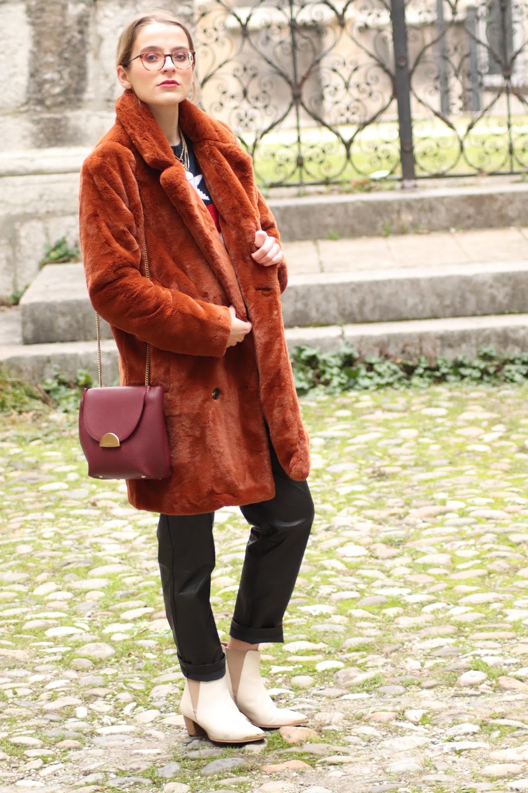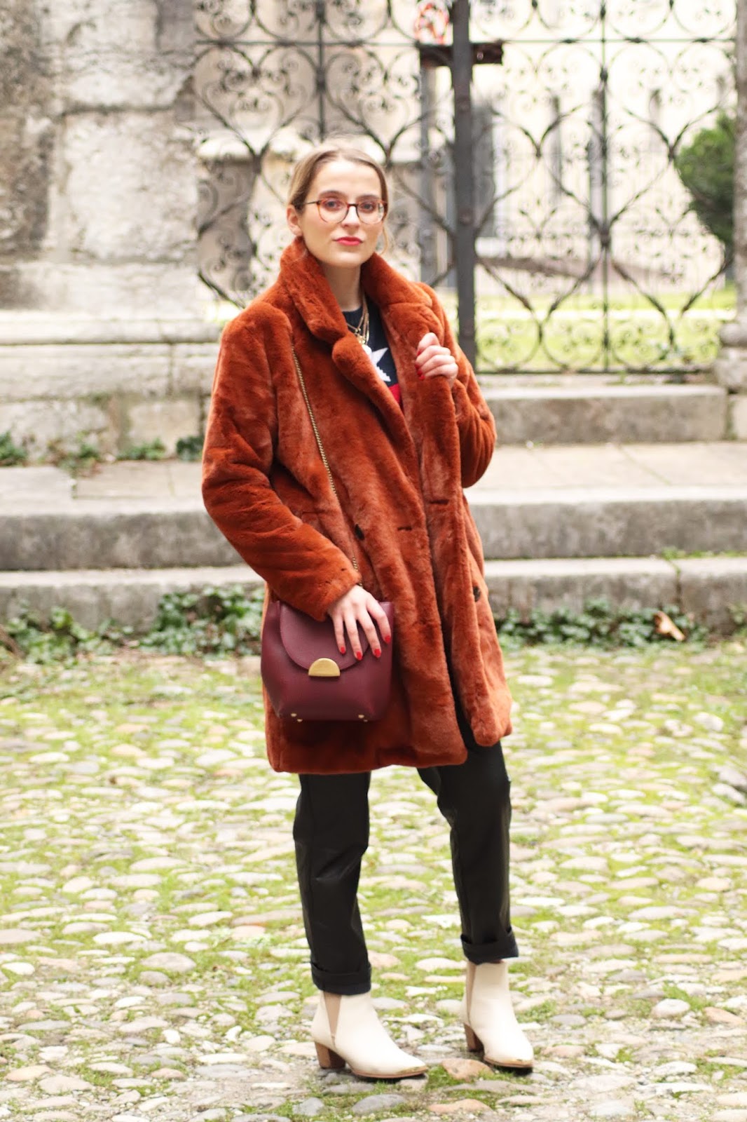 Je cherchais un pantalon style similicuir depuis littéralement des mois, sans trouver celui qui me plaise vraiment. J’en avais vus chez Stradivarius mais pas dispos en boutique, donc j’aurais du commande à l’aveugle avec le risque de renvoyer. Flemme. En voyant celui-ci sur Not your girl, un site donc, allez comprendre, j’ai eu envie de tenter. Et j’en suis ravie! J’ai eu envie de porter tout ça avec mes bottines blanches offertes par le gentil ex BF il y a plus d’un an.